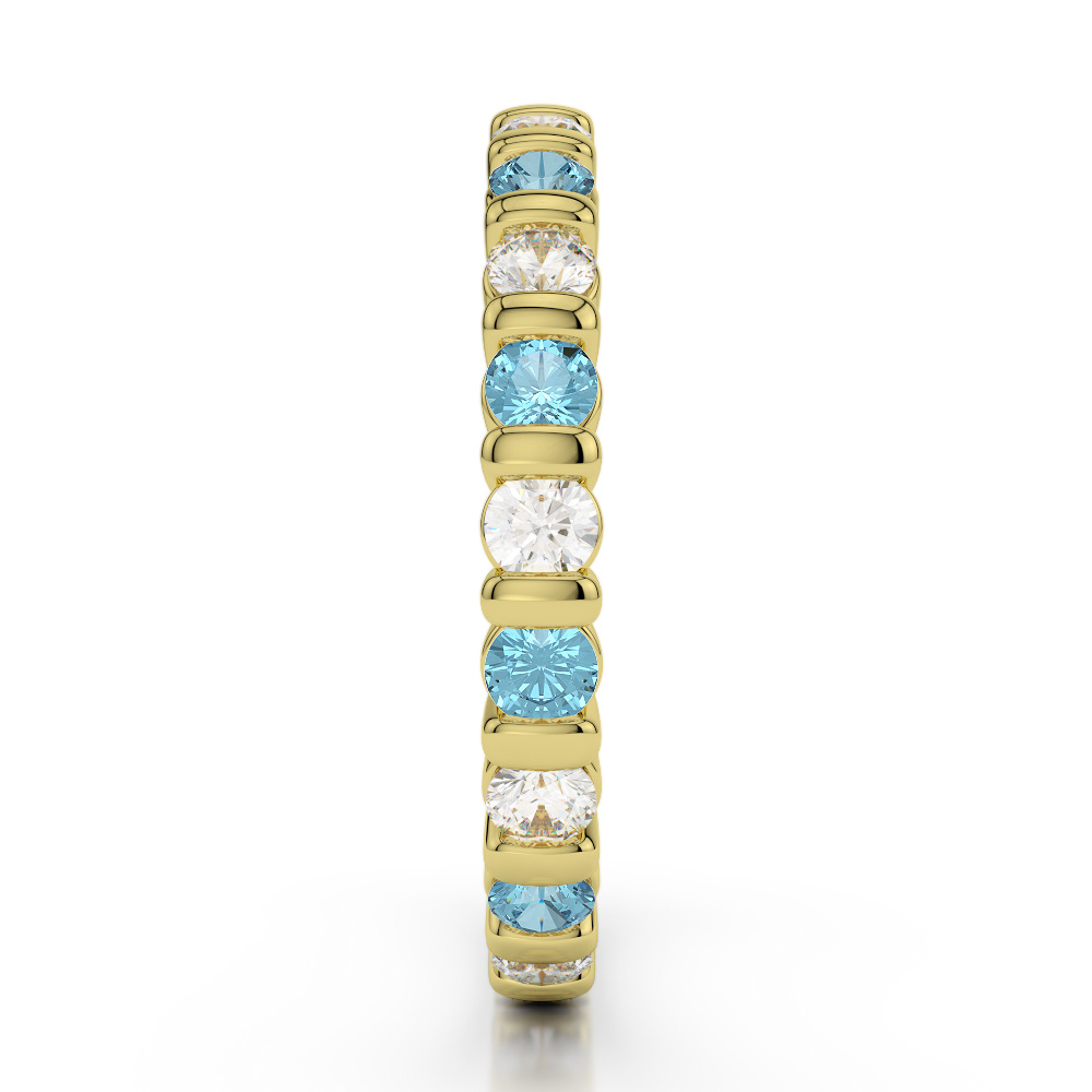 This aquamarine and diamond eternity ring is a symbol of love and dedication, featuring a row of brilliant aquamarines and sparkling diamonds in a bar setting. The sapphires complement the diamonds, creating a captivating contrast. The bar setting enhances the ring's aesthetic appeal and ensures its durability. This timeless treasure is perfect for weddings, anniversary gifts, or as a lasting symbol of love.