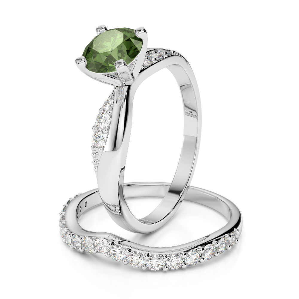 This exquisite green tourmaline bridal set features beautiful wedding rings crafted in elegant gold/platinum, adorned with sparkling diamonds. The rings are designed with a prong setting, ensuring that the diamonds are securely held in place while allowing maximum light to enhance their brilliance. Perfect for symbolising eternal love and commitment, this stunning set is a timeless choice for any couple's special day.