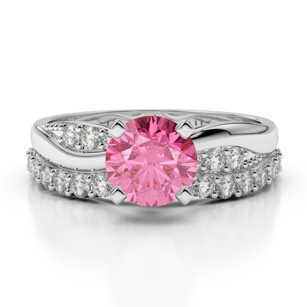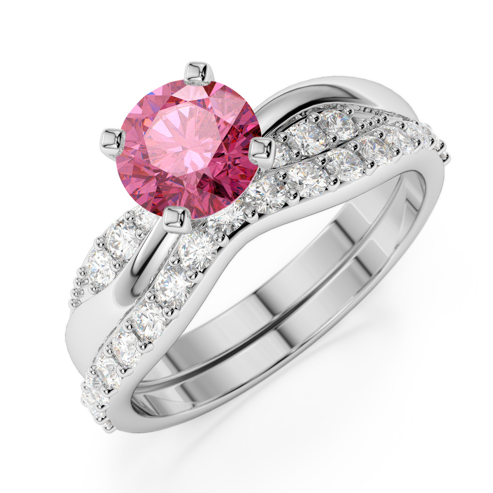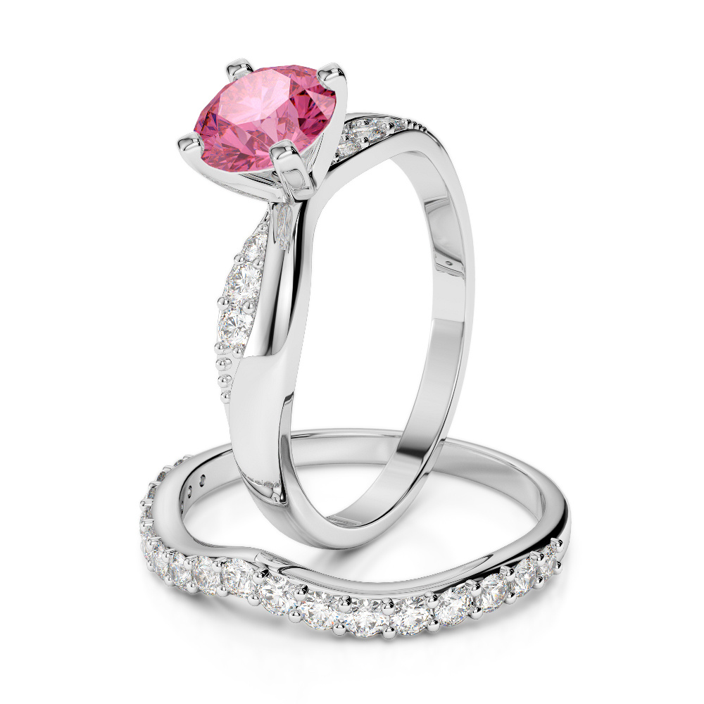 This exquisite pink tourmaline bridal set features beautiful wedding rings crafted in elegant gold/platinum, adorned with sparkling diamonds. The rings are designed with a prong setting, ensuring that the diamonds are securely held in place while allowing maximum light to enhance their brilliance. Perfect for symbolising eternal love and commitment, this stunning set is a timeless choice for any couple's special day.