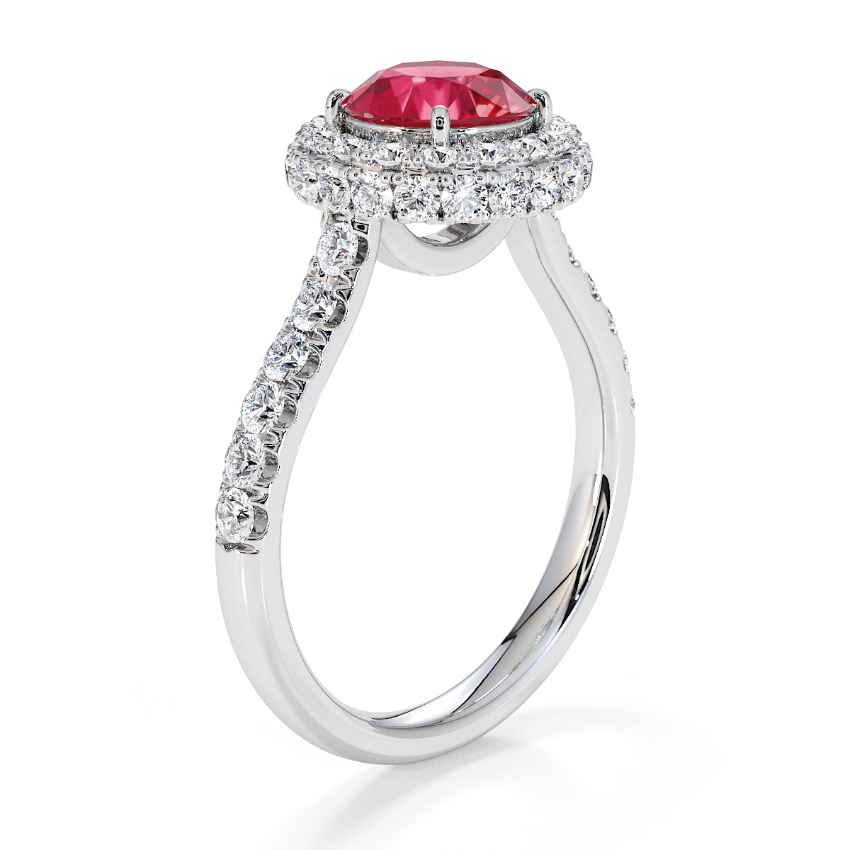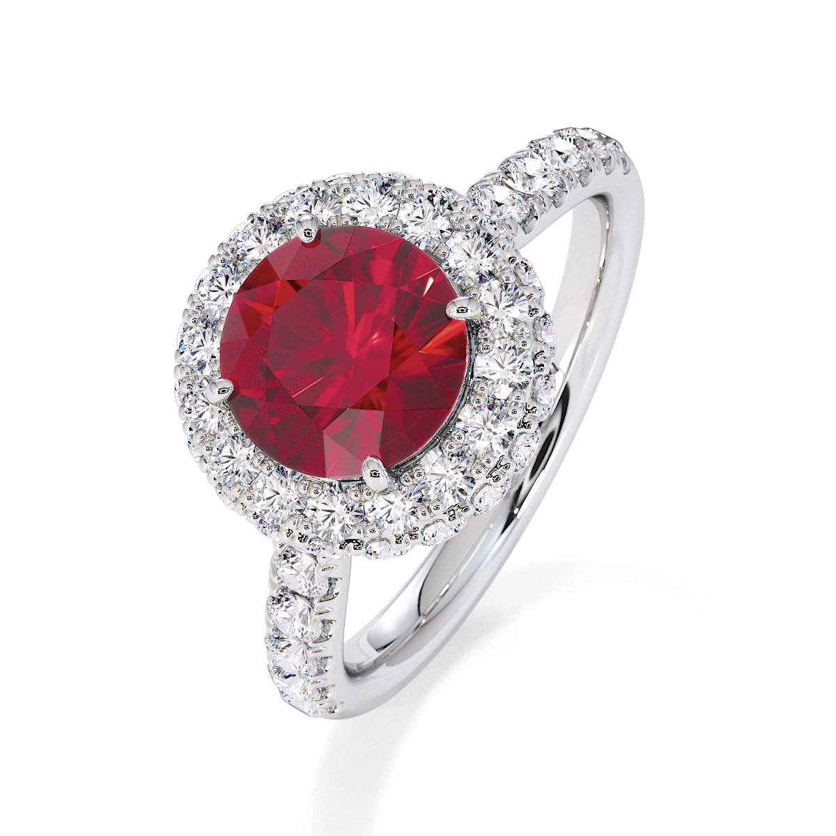 Experience timeless elegance with our exquisite Round Cut Ruby and Diamond Engagement Ring, featuring a halo of diamonds and prong-set stones. A perfect symbol of everlasting love and sophistication.