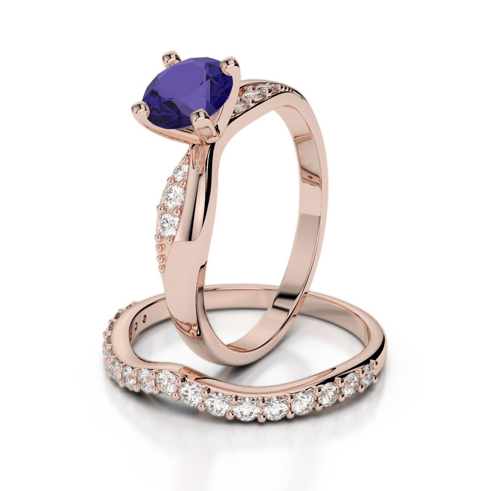 This exquisite tanzanite bridal set features beautiful wedding rings crafted in elegant gold/platinum, adorned with sparkling diamonds. The rings are designed with a prong setting, ensuring that the diamonds are securely held in place while allowing maximum light to enhance their brilliance. Perfect for symbolising eternal love and commitment, this stunning set is a timeless choice for any couple's special day.