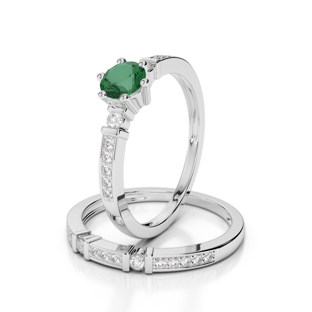 This Bridal Set Ring is a stunning engagement set featuring beautiful emerald bridal set. Crafted with precision, the rings feature a mesmerizing design with a row of dazzling diamonds, chosen for their brilliance and clarity. The Prong & Bar Setting secures the diamonds, allowing maximum light to pass through. This timeless treasure symbolizes eternal love and commitment, making it a timeless treasure to cherish.