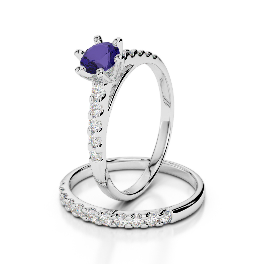 This tanzanite bridal set is a sophisticated and elegant piece, featuring a brilliant tanzanite center stone that symbolizes love. The prong setting enhances the diamond's beauty, ensuring it sparkles from every angle, showcasing its beauty.