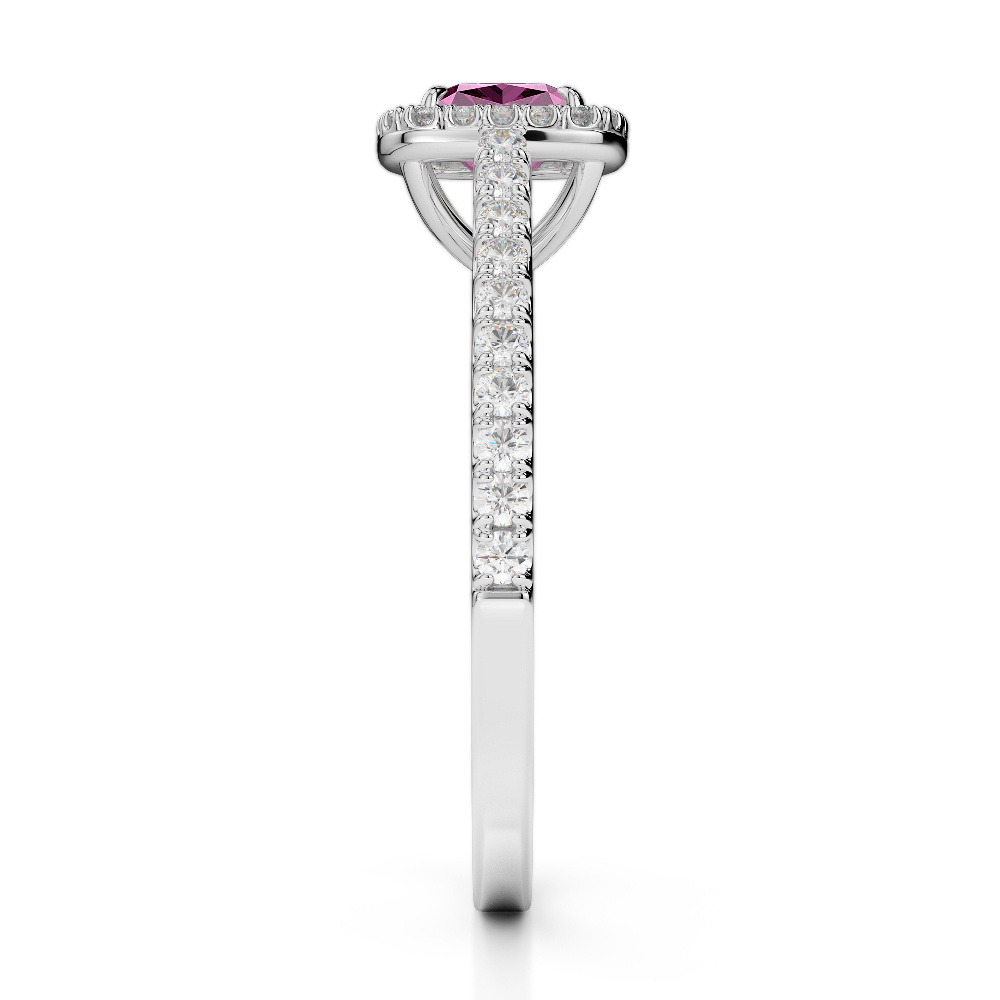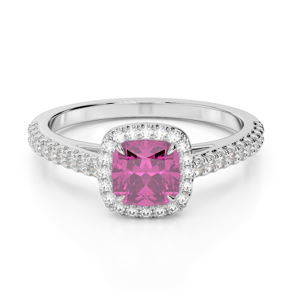 Indulge in the allure of our Cushion Cut Pink Sapphire And Diamond Engagement Ring, featuring a regal Pink Sapphire secured in a classic prong setting. A halo of sparkling diamonds enhances its brilliance, creating a captivating play of color and light.