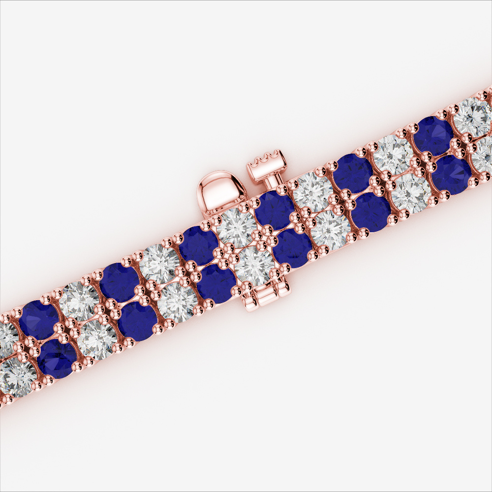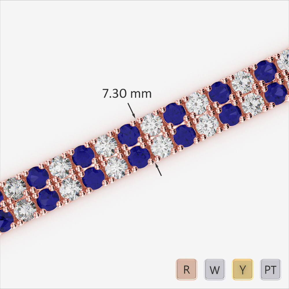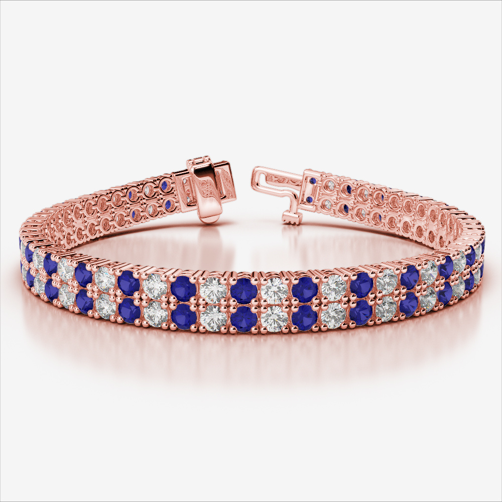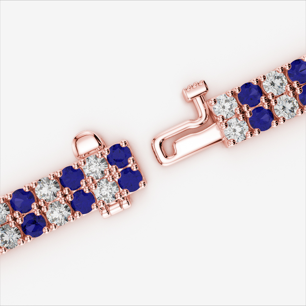 Presenting a distinguished piece of fine jewellery—the Double Row Prong Set Blue Sapphire and Diamond Bracelet. Featuring round-cut stones in secure prong settings, this bracelet offers a flawless balance of brilliance and craftsmanship. An ideal selection for significant occasions, it stands as a lasting symbol of elegance and refined taste.