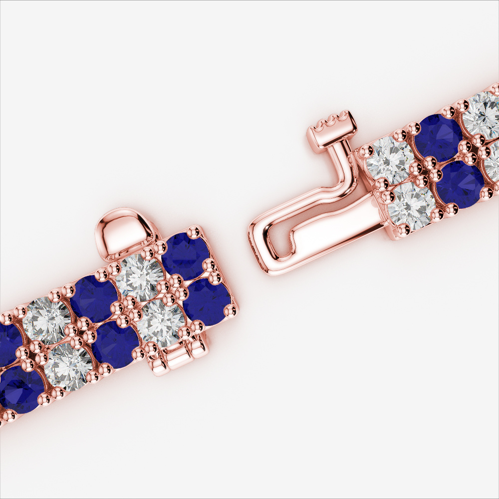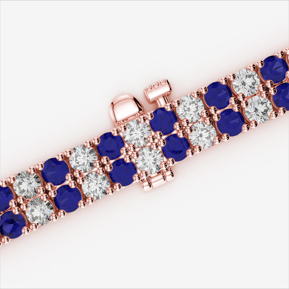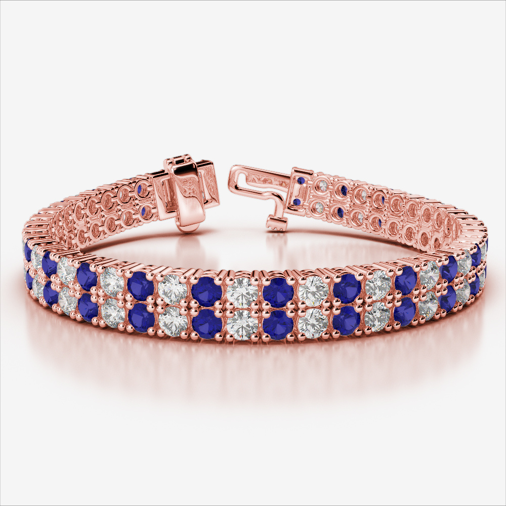 With its graceful composition, the Double Row Prong Set Blue Sapphire and diamond bracelet exemplifies formal elegance. Prong-set round-cut stones shine with distinction, making it an impeccable accessory for black-tie events, weddings, or executive occasions. A true celebration of refined artistry.