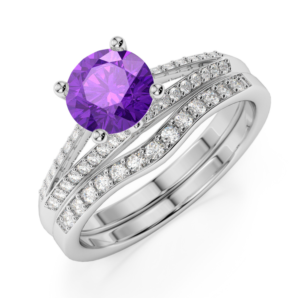 These stunning amethyst bridal set rings are perfect for those who adore diamonds that sparkle and shine. The bridal set features a round brilliant-cut diamond, further enhanced by additional diamonds. The shoulder is also adorned with an array of diamonds, all expertly set in a combination of prong and scallop settings for added elegance. The bridal set fits perfectly into the wedding ring, creating a stunning effect that provides interest and high impact. These naturally mined, conflict-free diamonds are beautifully designed to add comfort and style to your look.