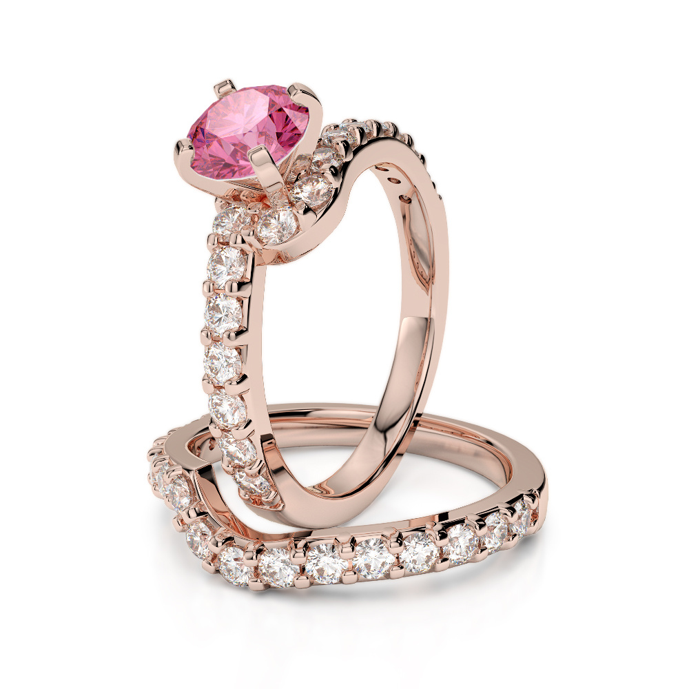 These stunning bridal set rings are a must-have for those who appreciate the sparkle of diamonds. The bridal set features a round brilliant-cut pink tourmaline, further complemented by additional diamonds. The shoulder is also adorned with an array of diamonds. The bridal set seamlessly fits into the wedding ring, creating a stunning effect that provides interest and high impact. The rings are studded with naturally mined, conflict-free diamonds, adding comfort and style to your look.