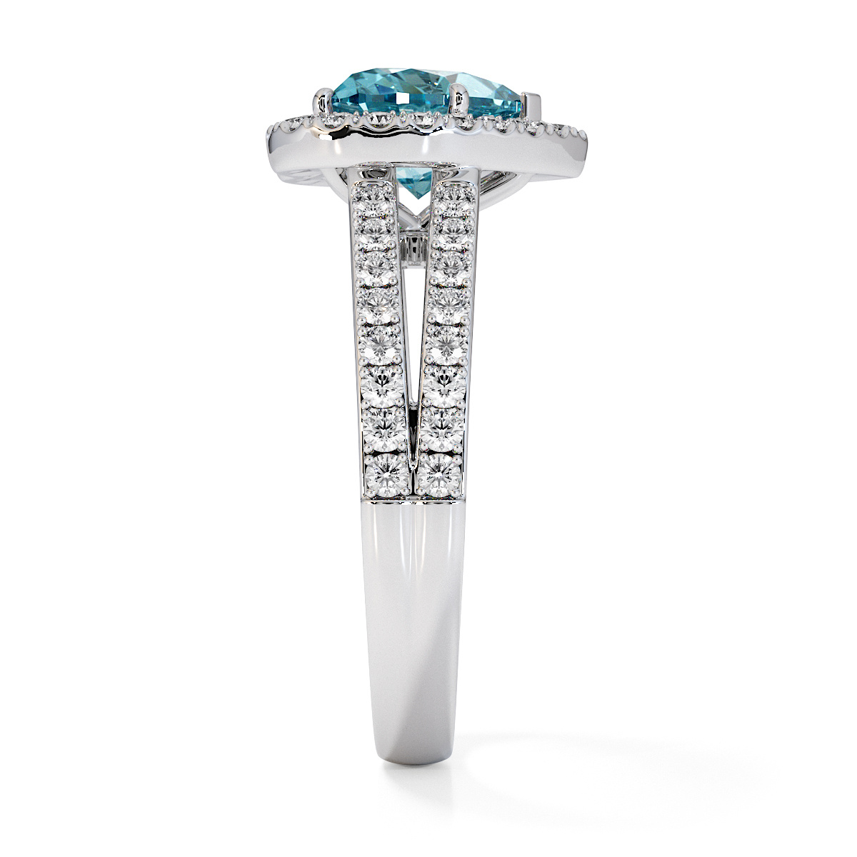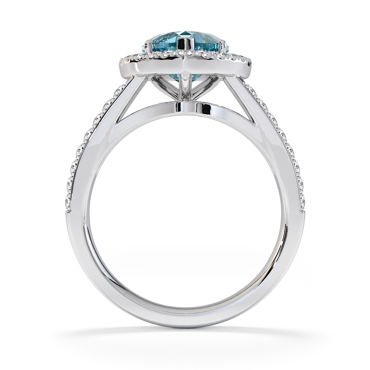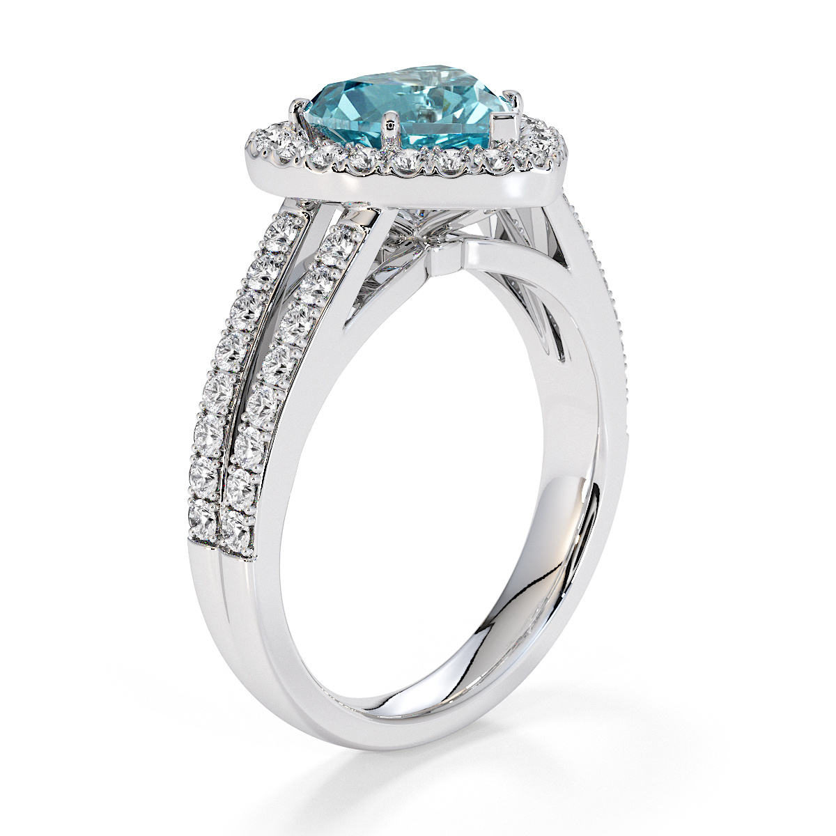We are presenting our stunning Heart cut Aquamarine and Diamond Engagement Ring, featuring a sparkling halo of round-cut diamonds delicately set in prongs.