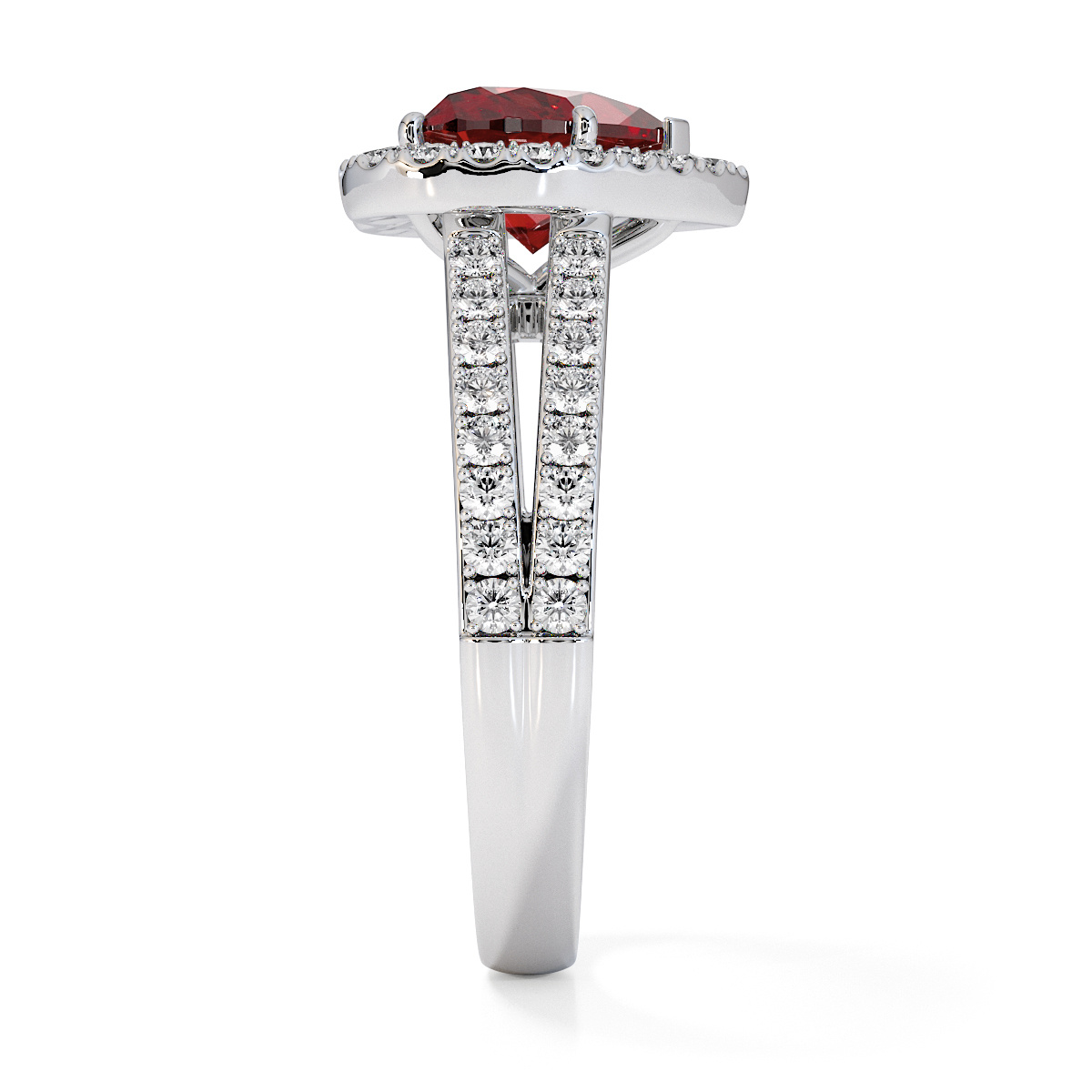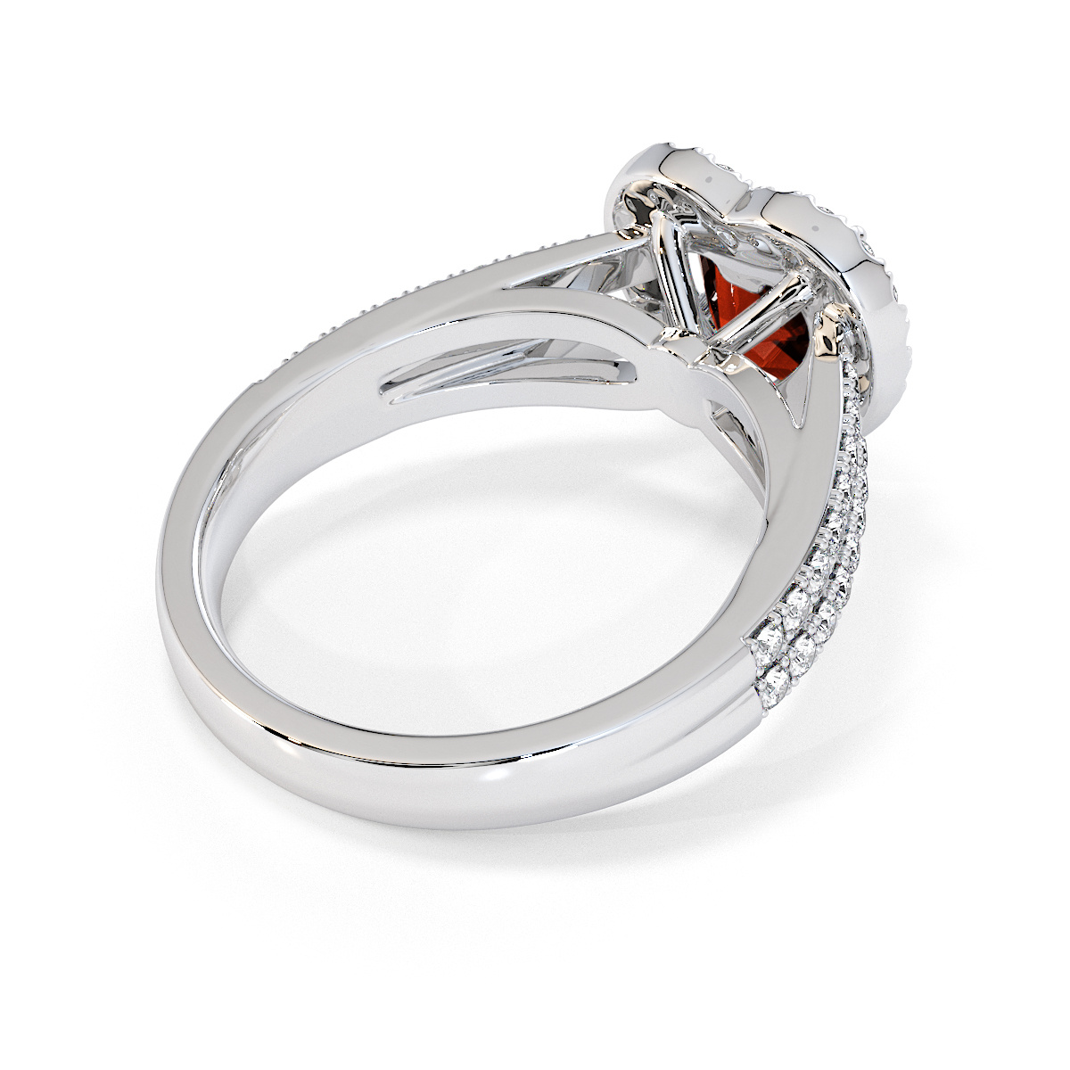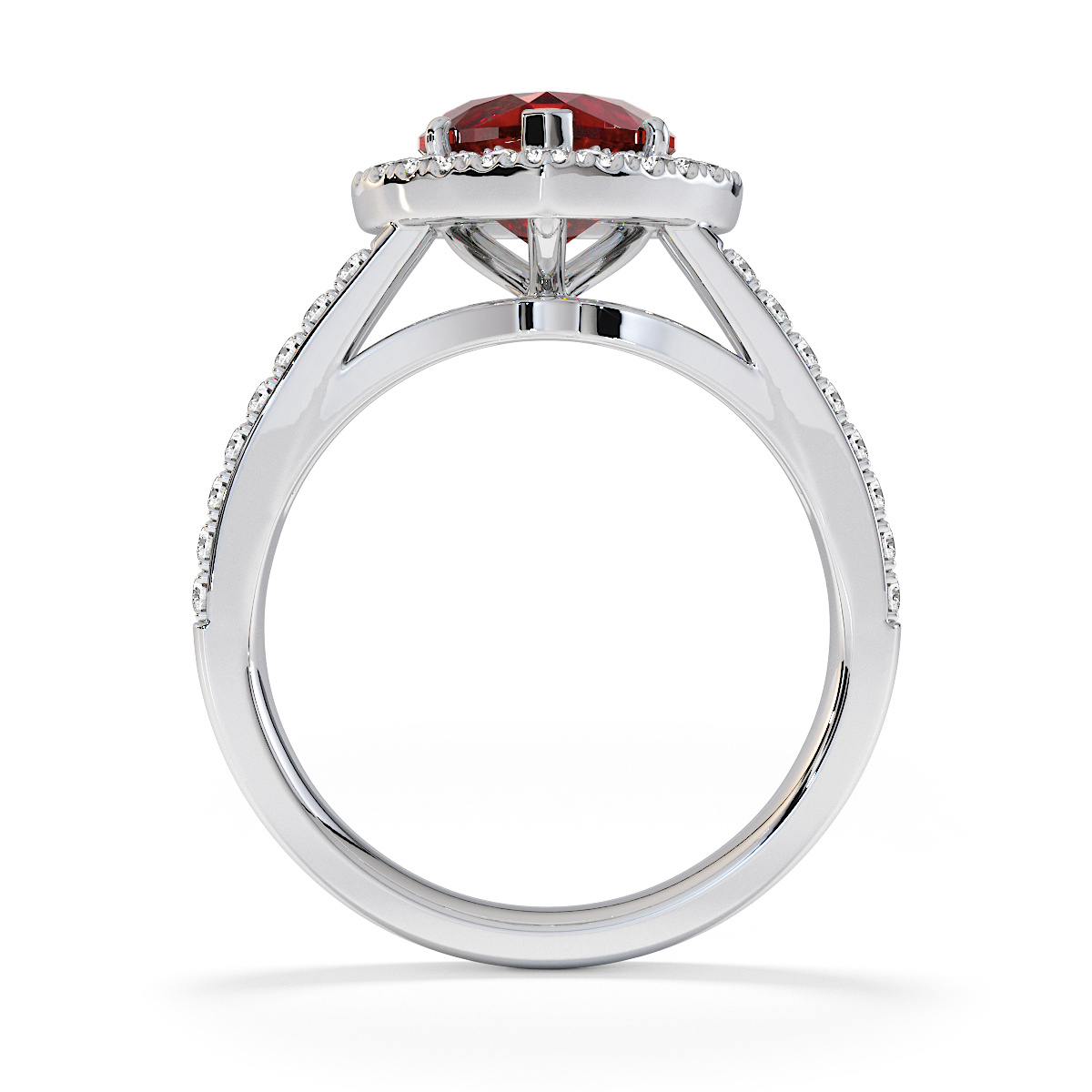 We are presenting our stunning Heart cut Garnet and Diamond Engagement Ring, featuring a sparkling halo of round-cut diamonds delicately set in prongs.