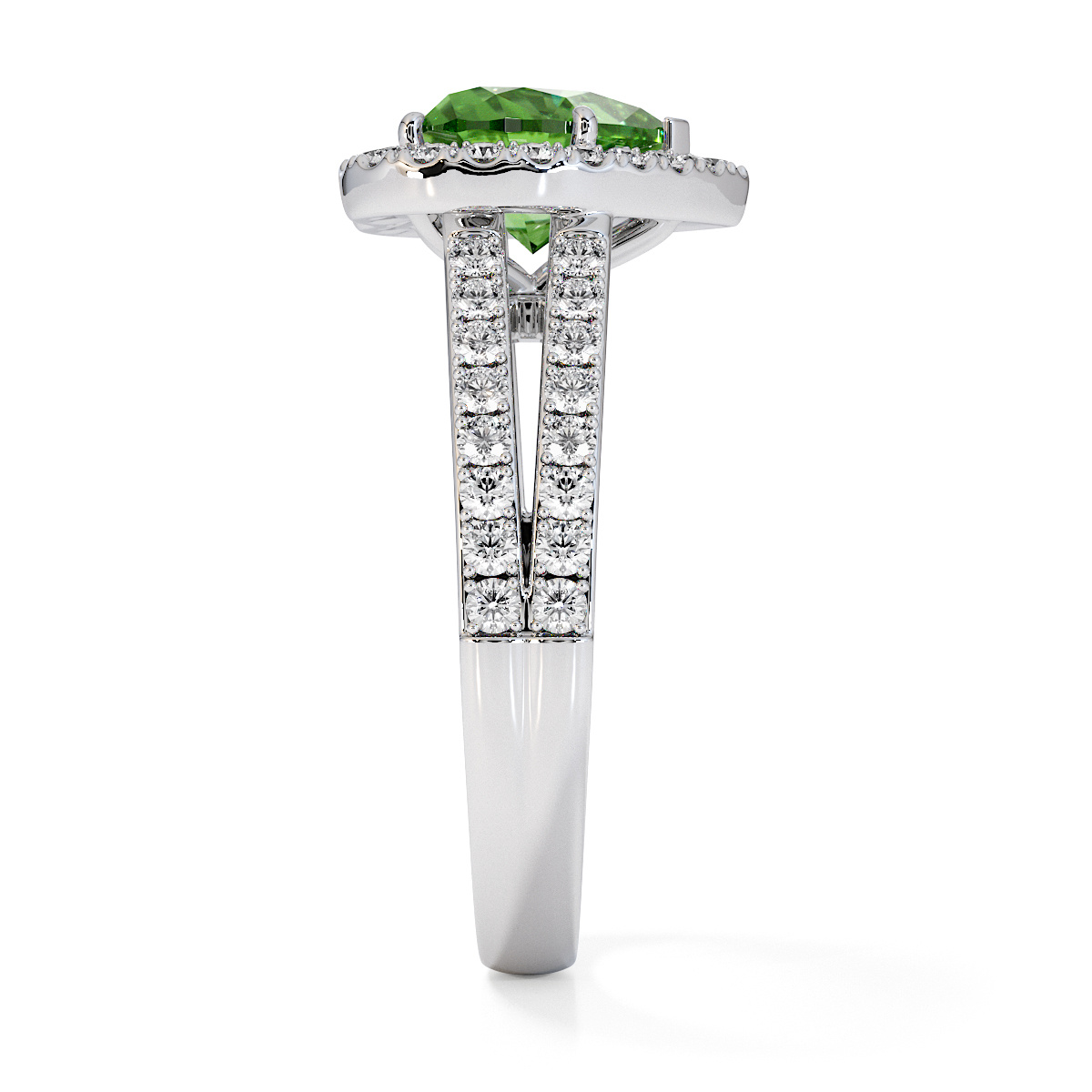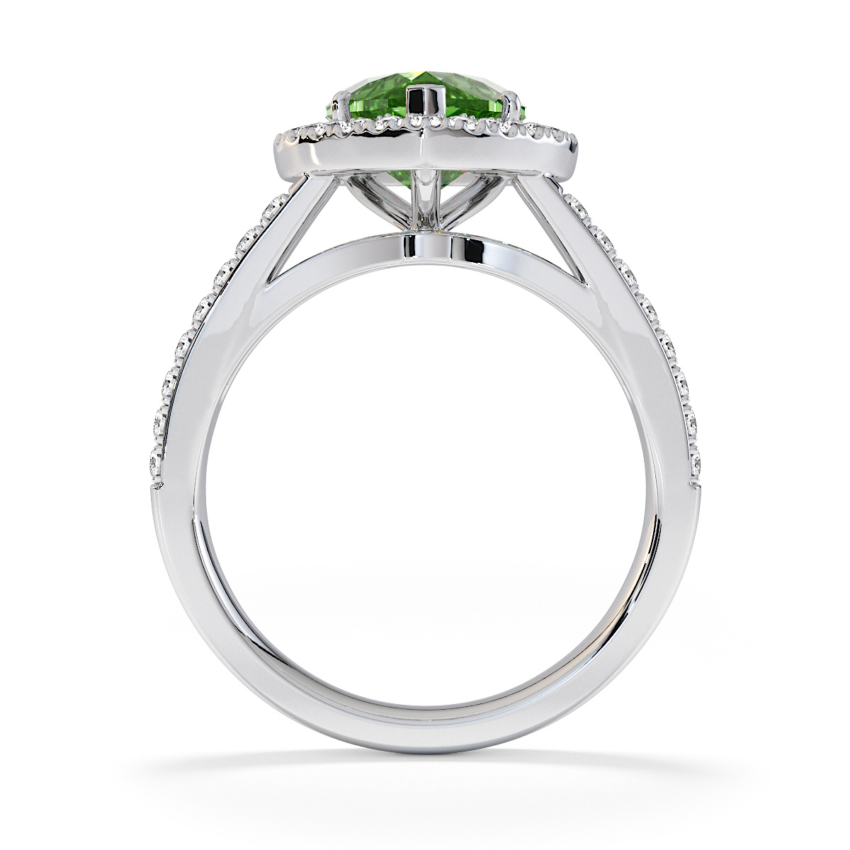 We are presenting our stunning Heart cut Green Tourmaline and Diamond Engagement Ring, featuring a sparkling halo of round-cut diamonds delicately set in prongs.