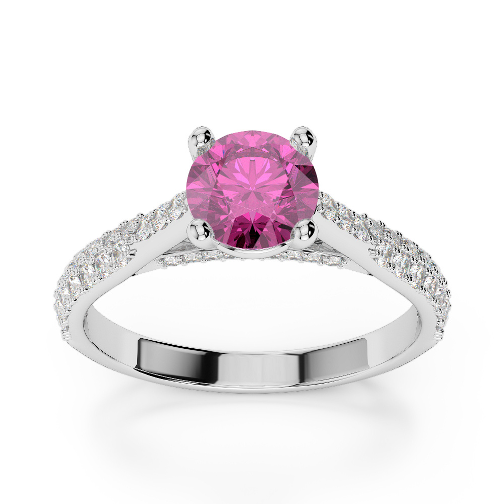 This exquisite Pink Sapphire And Diamond Engagement Ring features a stunning round brilliant cut diamond, expertly set in a classic prong setting to maximize its brilliance and sparkle. The prongs securely cradle the diamond while allowing optimal light exposure, enhancing its exceptional fire and clarity. As the radiant centerpiece of this timeless piece, the diamond beautifully symbolizes the eternal love and commitment shared between partners.