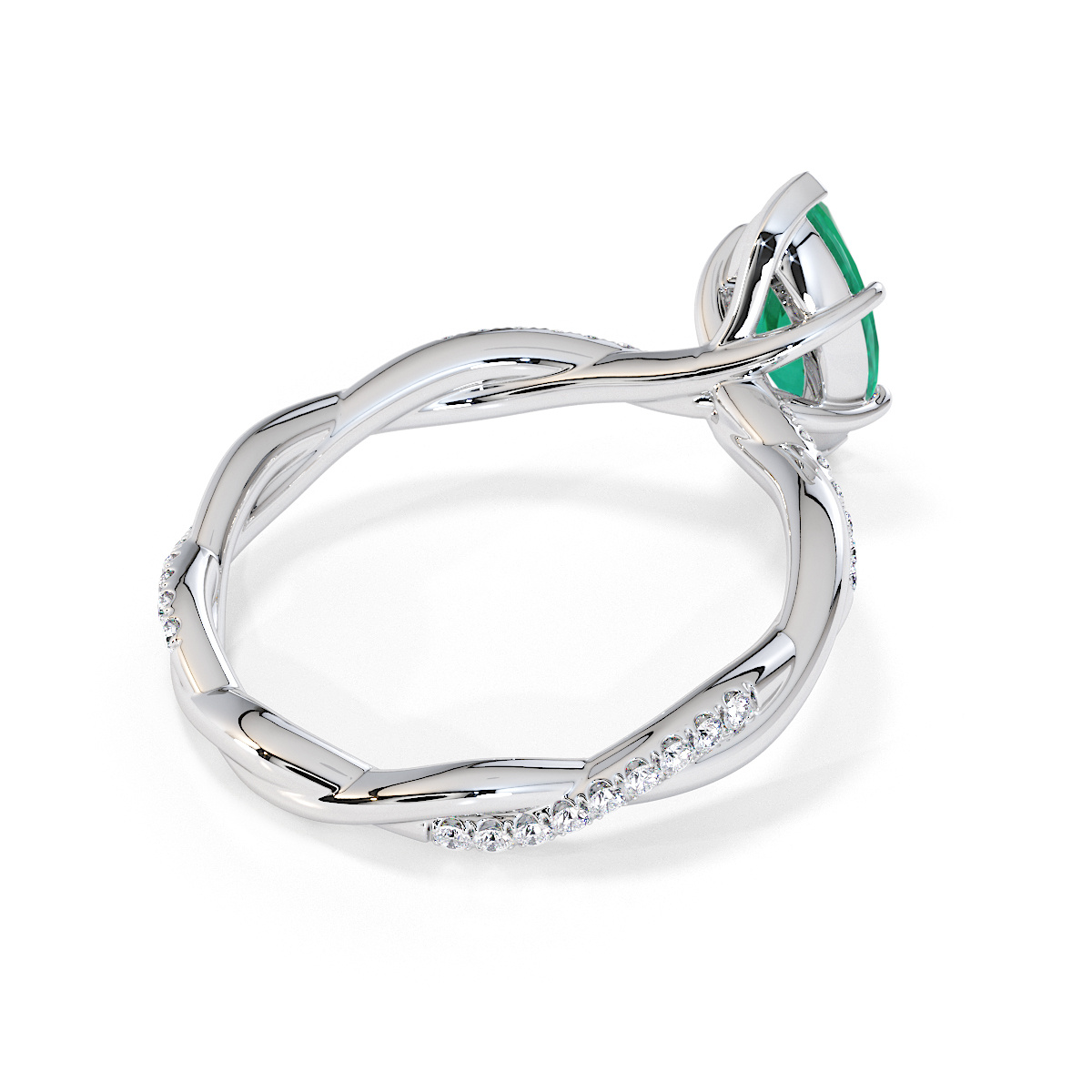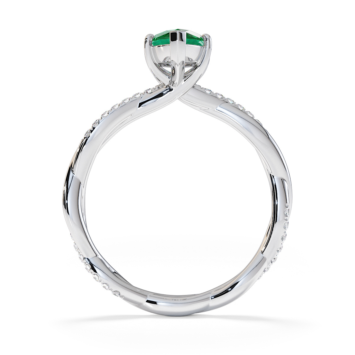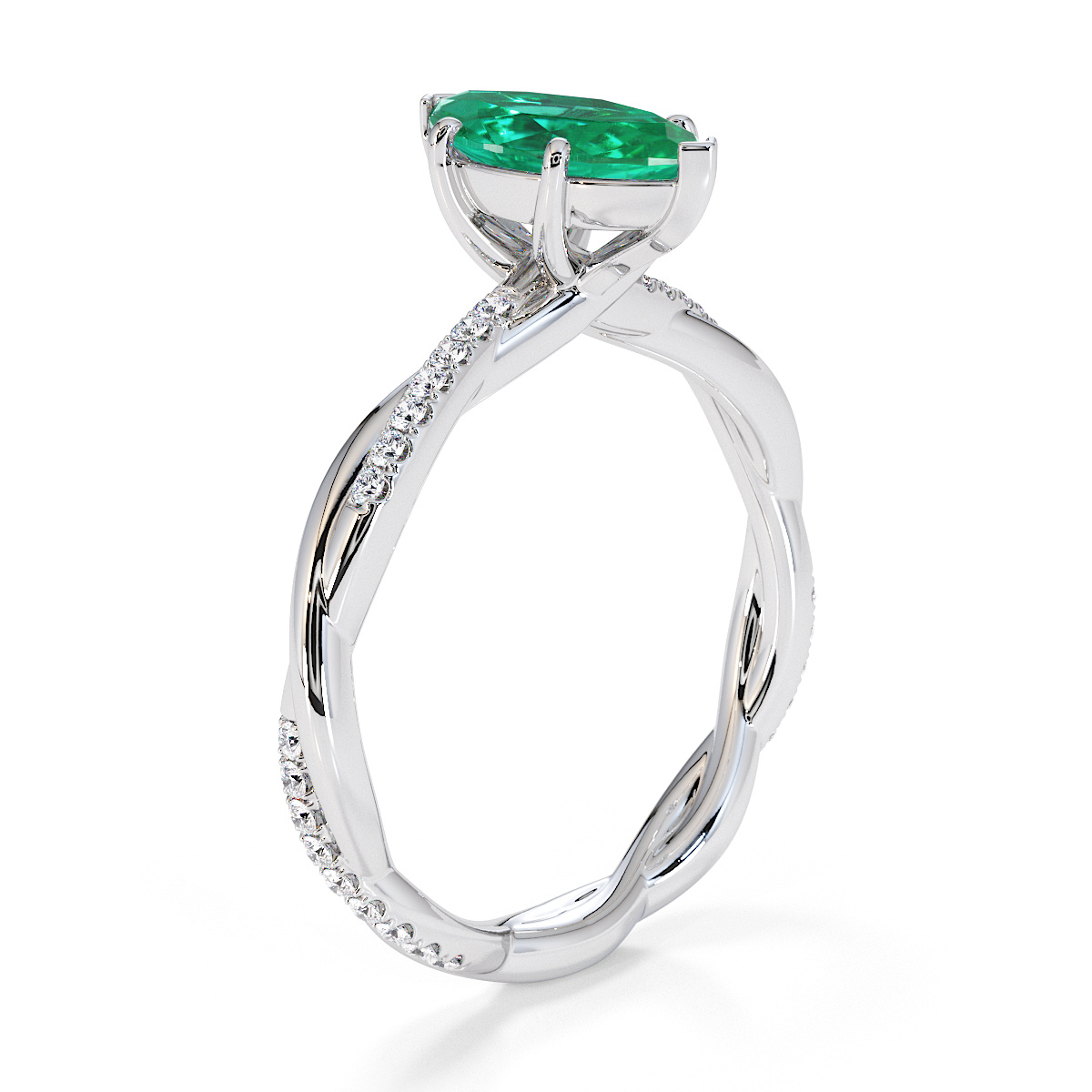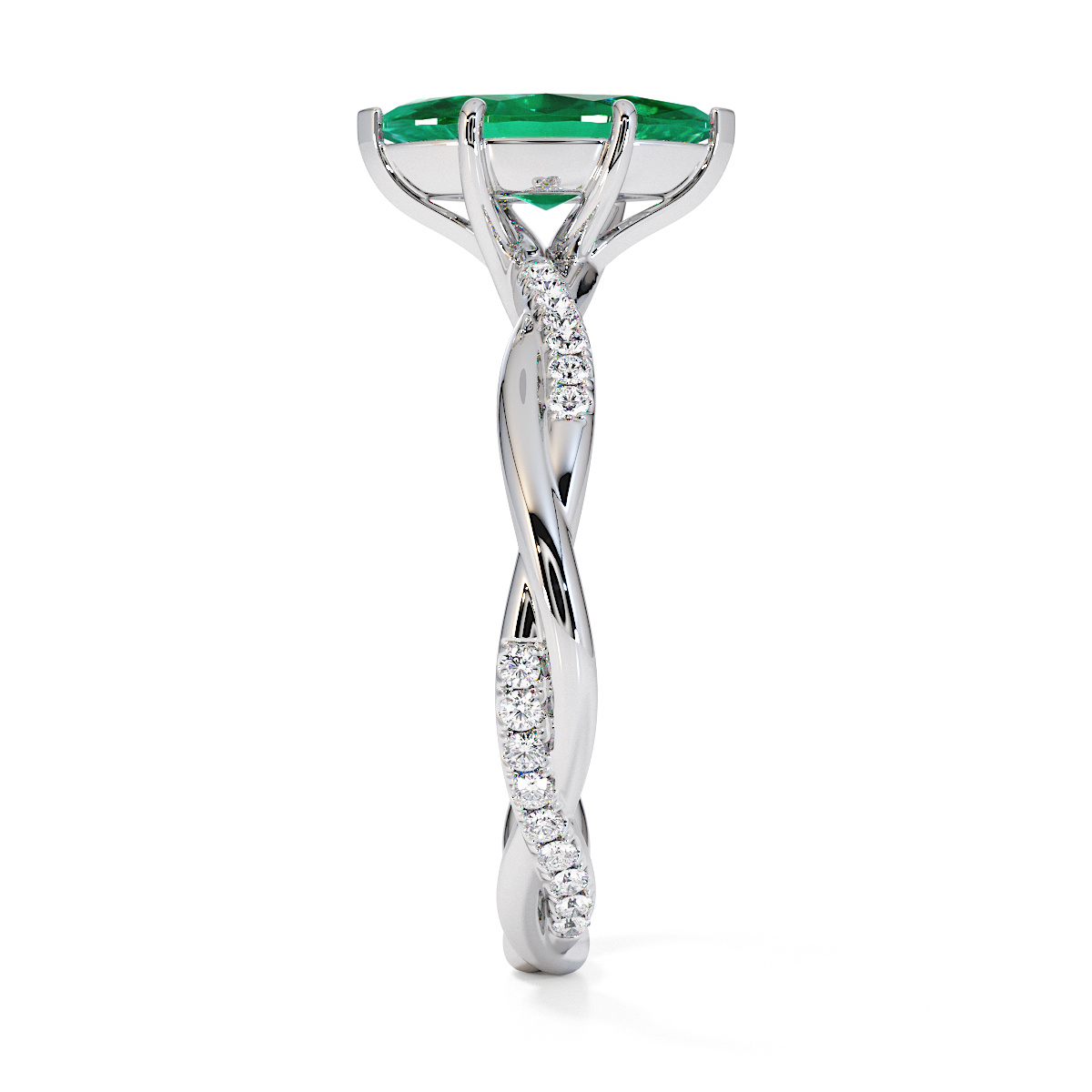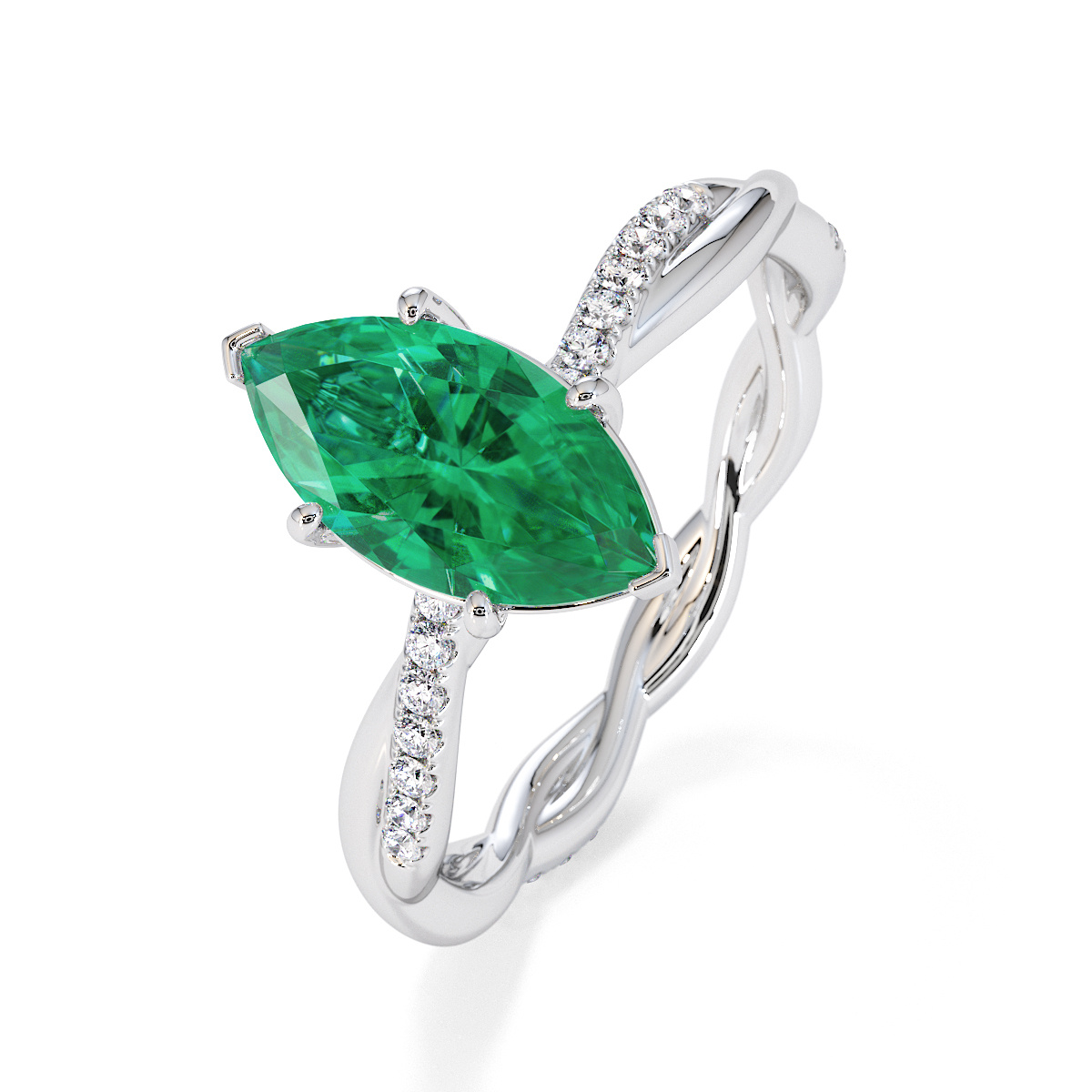 Presenting our stunning Marquise Cut Emerald and Diamond Engagement Ring. The ring is further adorned with prong-set diamonds running up the twisted shoulders. It perfectly complements the wedding ring of your choice.