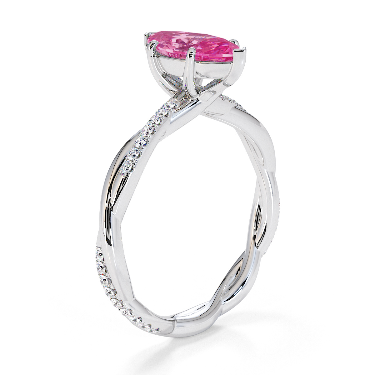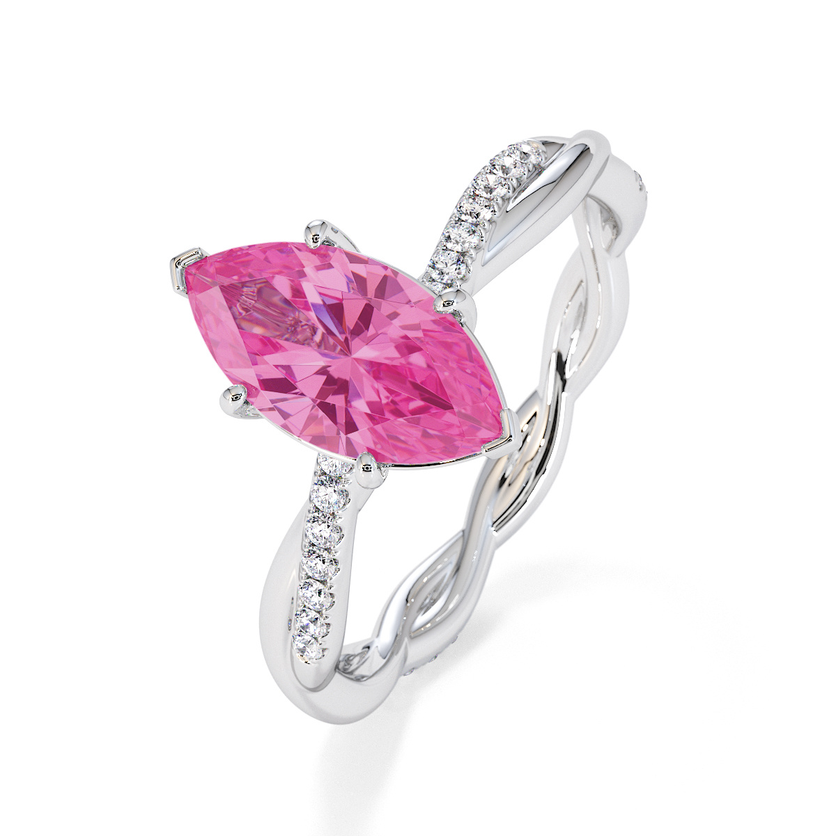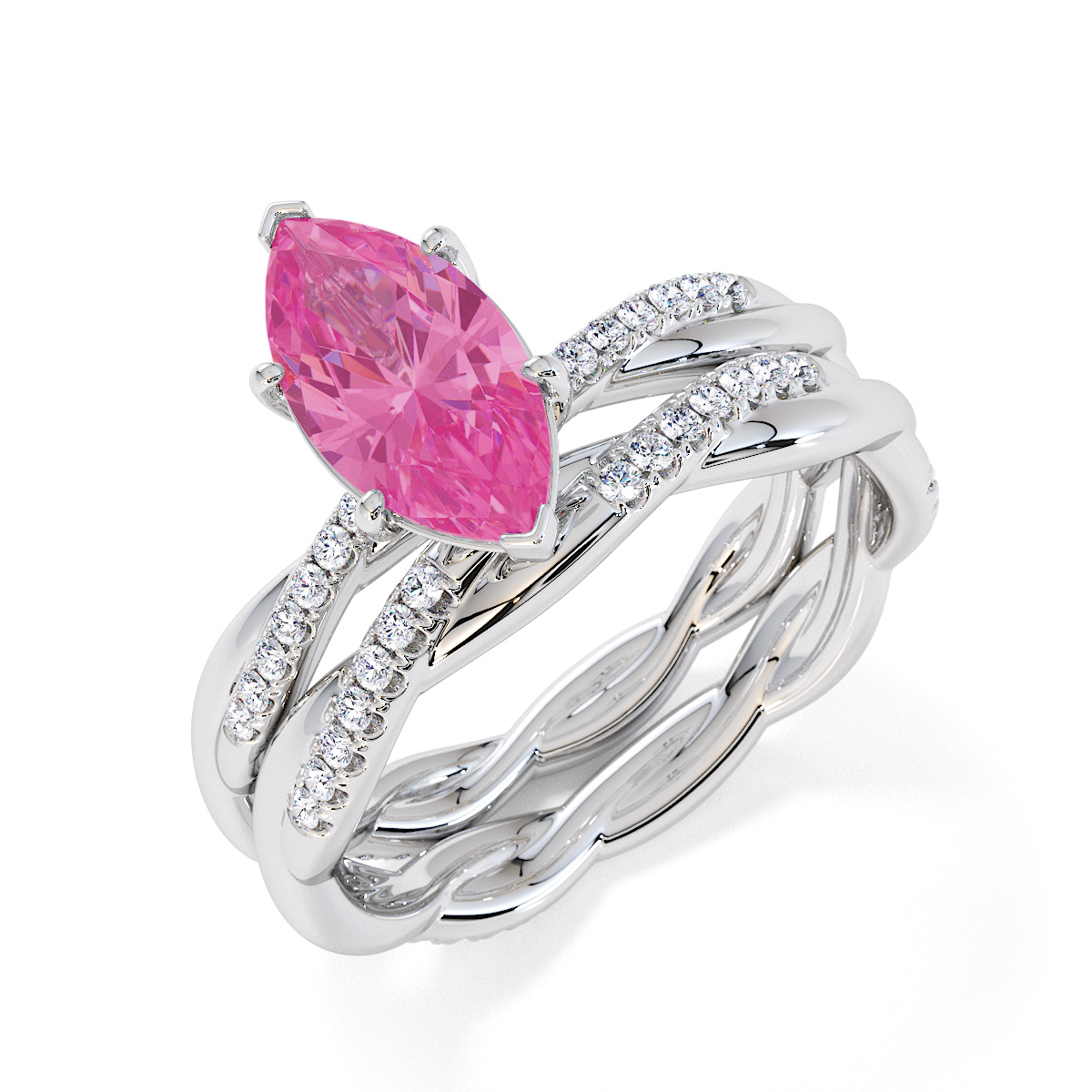 Presenting our stunning Marquise Cut Pink Sapphire and Diamond Engagement Ring. The ring is further adorned with prong-set diamonds running up the twisted shoulders. It perfectly complements the wedding ring of your choice.