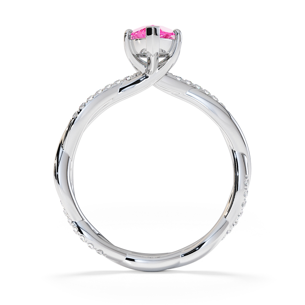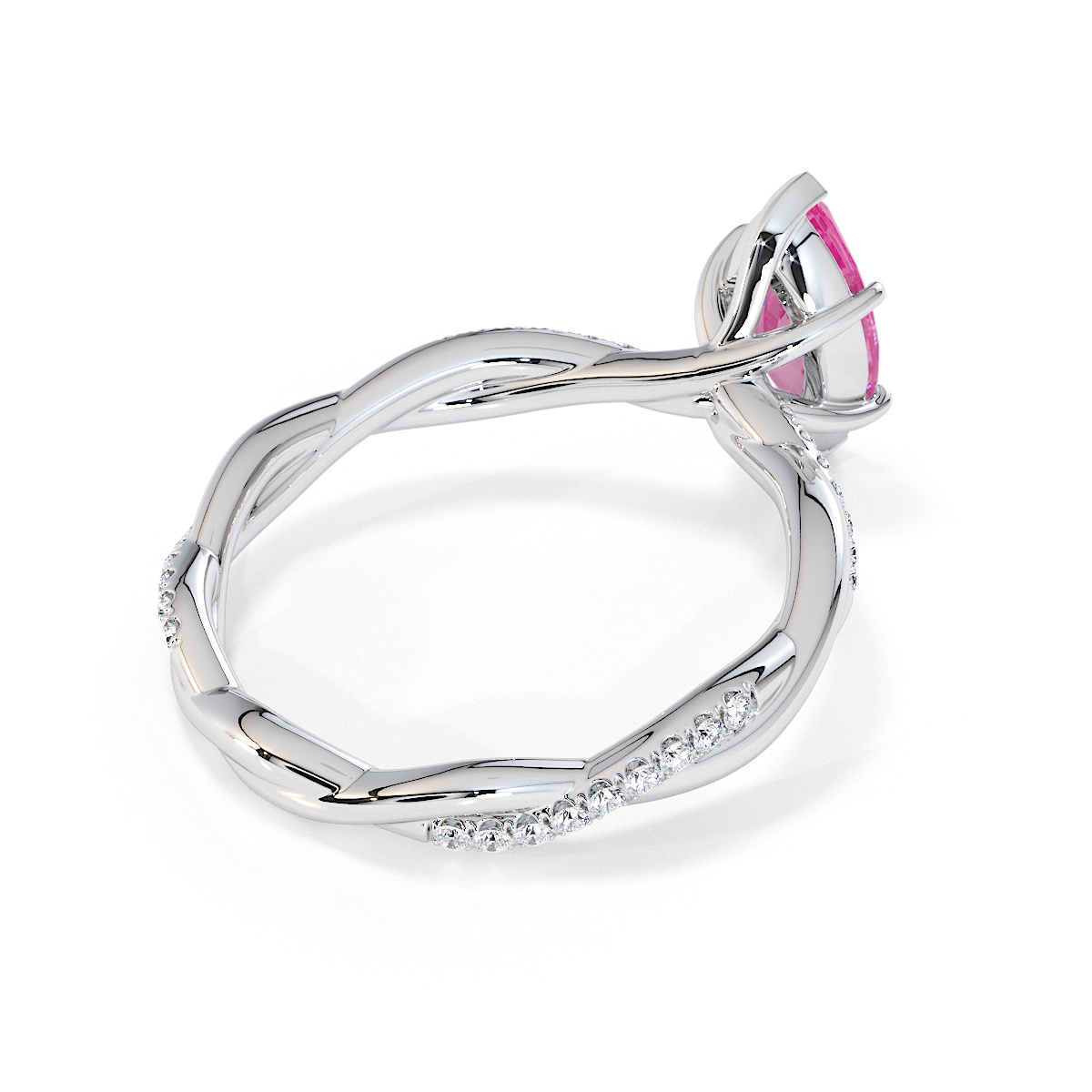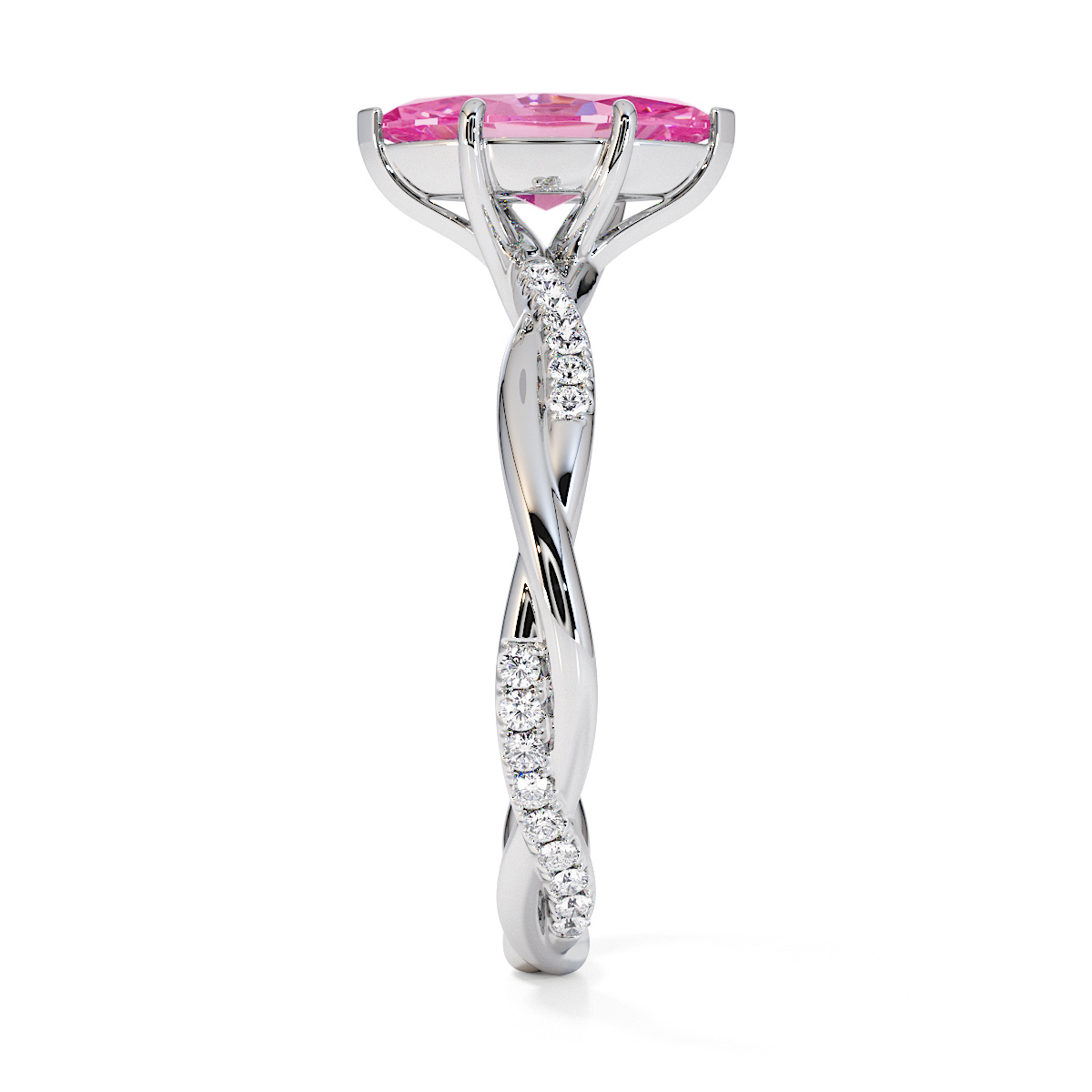 Presenting our stunning Marquise Cut Pink Sapphire and Diamond Engagement Ring. The ring is further adorned with prong-set diamonds running up the twisted shoulders. It perfectly complements the wedding ring of your choice.