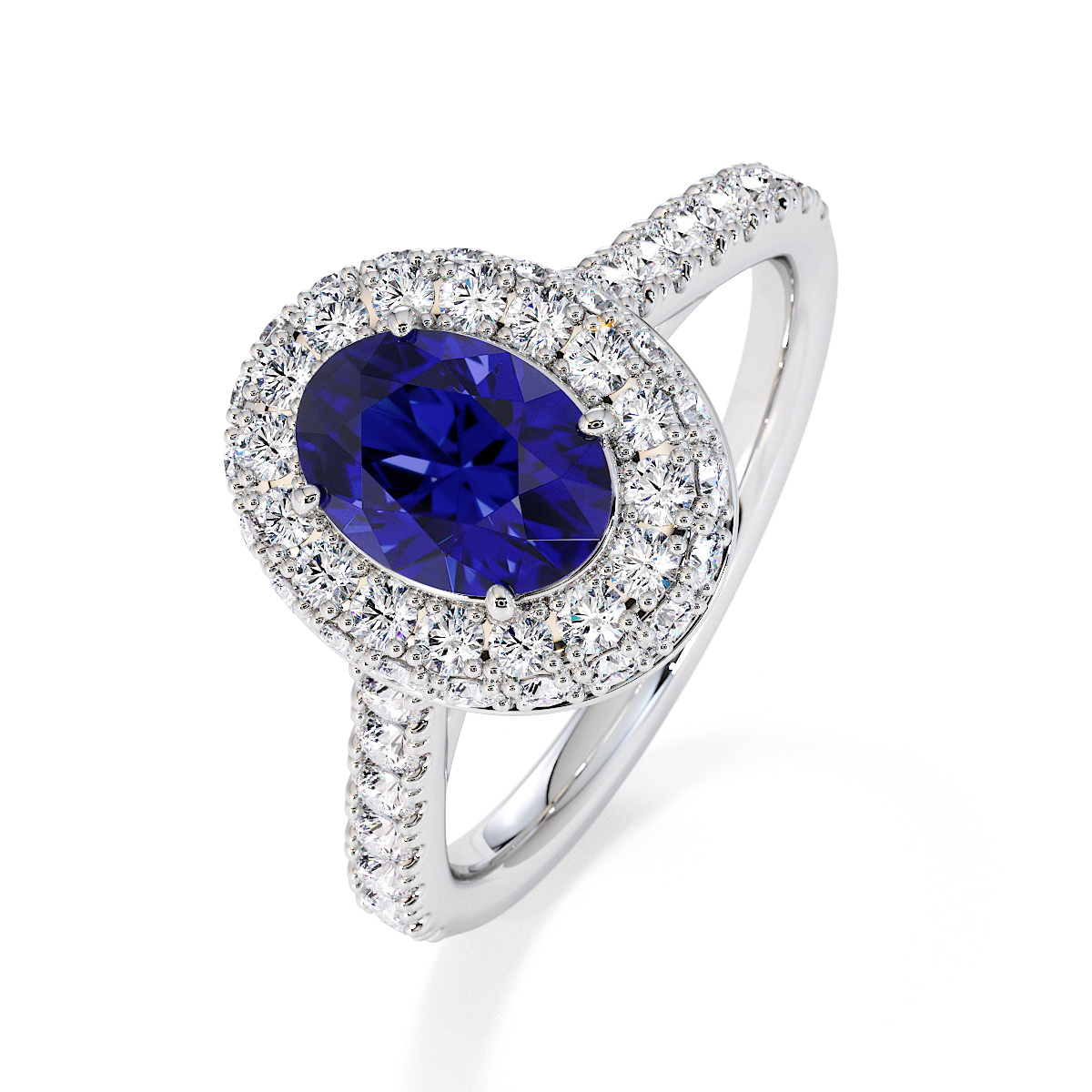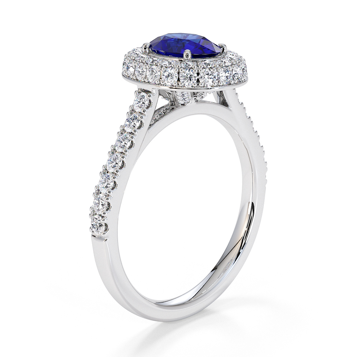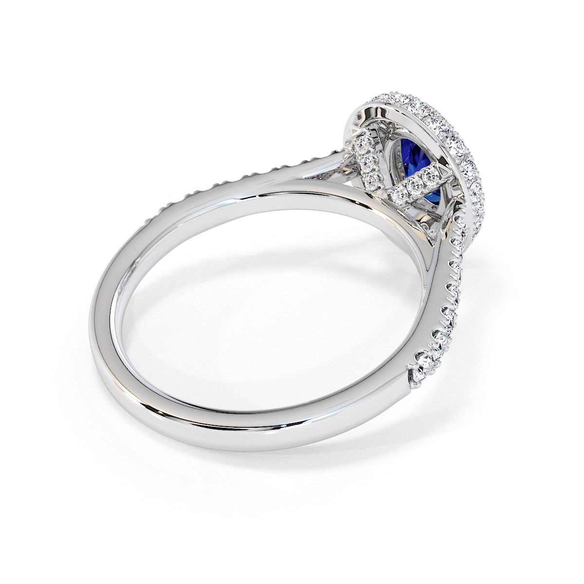 Featuring a gorgeous oval-shaped Blue Sapphire and Diamond Engagement Ring With Band, surrounded by a halo of round brilliant stones, The ring is further adorned with prong-set diamonds running up the shoulders. This engagement ring sits beautifully with the wedding ring of your choice.