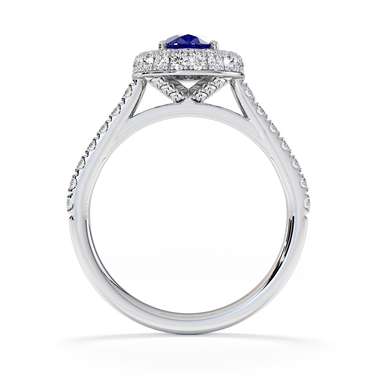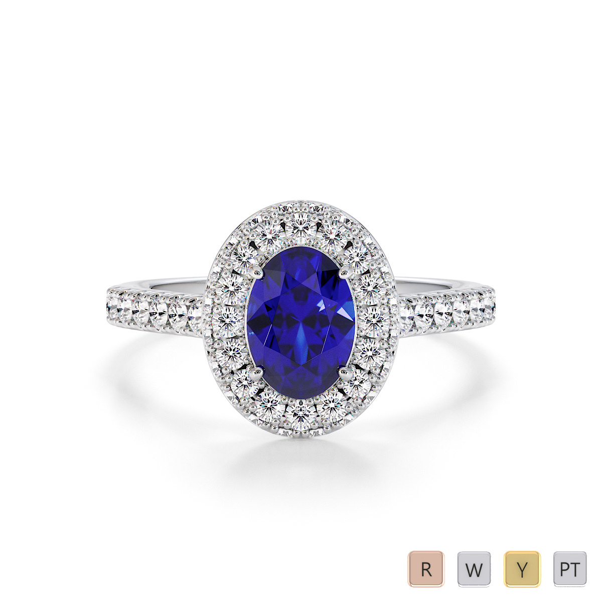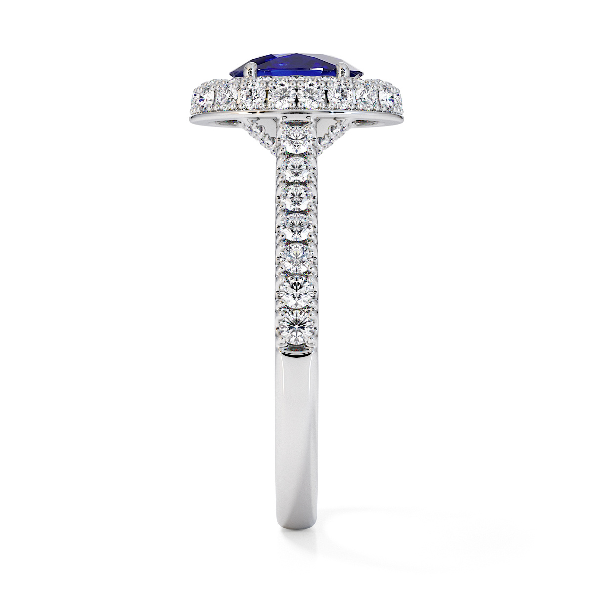Featuring a gorgeous oval-shaped Blue Sapphire and Diamond Engagement Ring With Band, surrounded by a halo of round brilliant stones, The ring is further adorned with prong-set diamonds running up the shoulders. This engagement ring sits beautifully with the wedding ring of your choice.