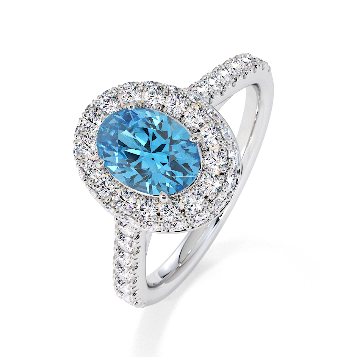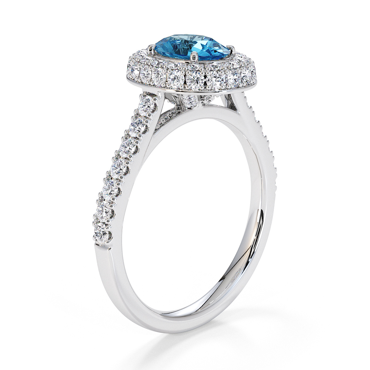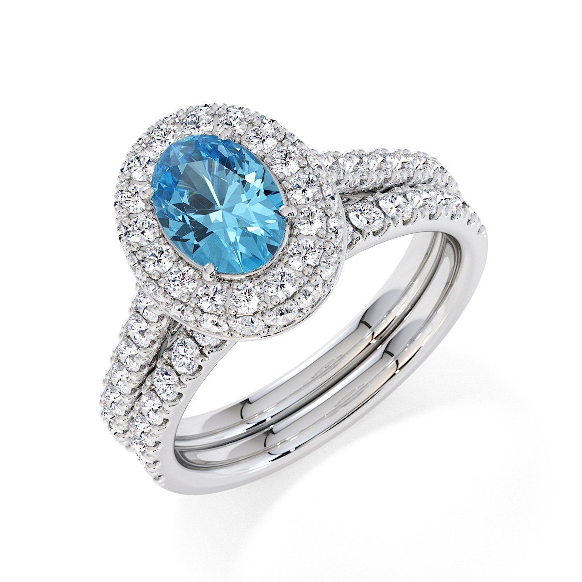 Featuring a gorgeous oval-shaped Blue Topaz and Diamond Engagement Ring, surrounded by a halo of round brilliant stones, The ring is further adorned with prong-set diamonds running up the shoulders. This engagement ring sits beautifully with the wedding ring of your choice.