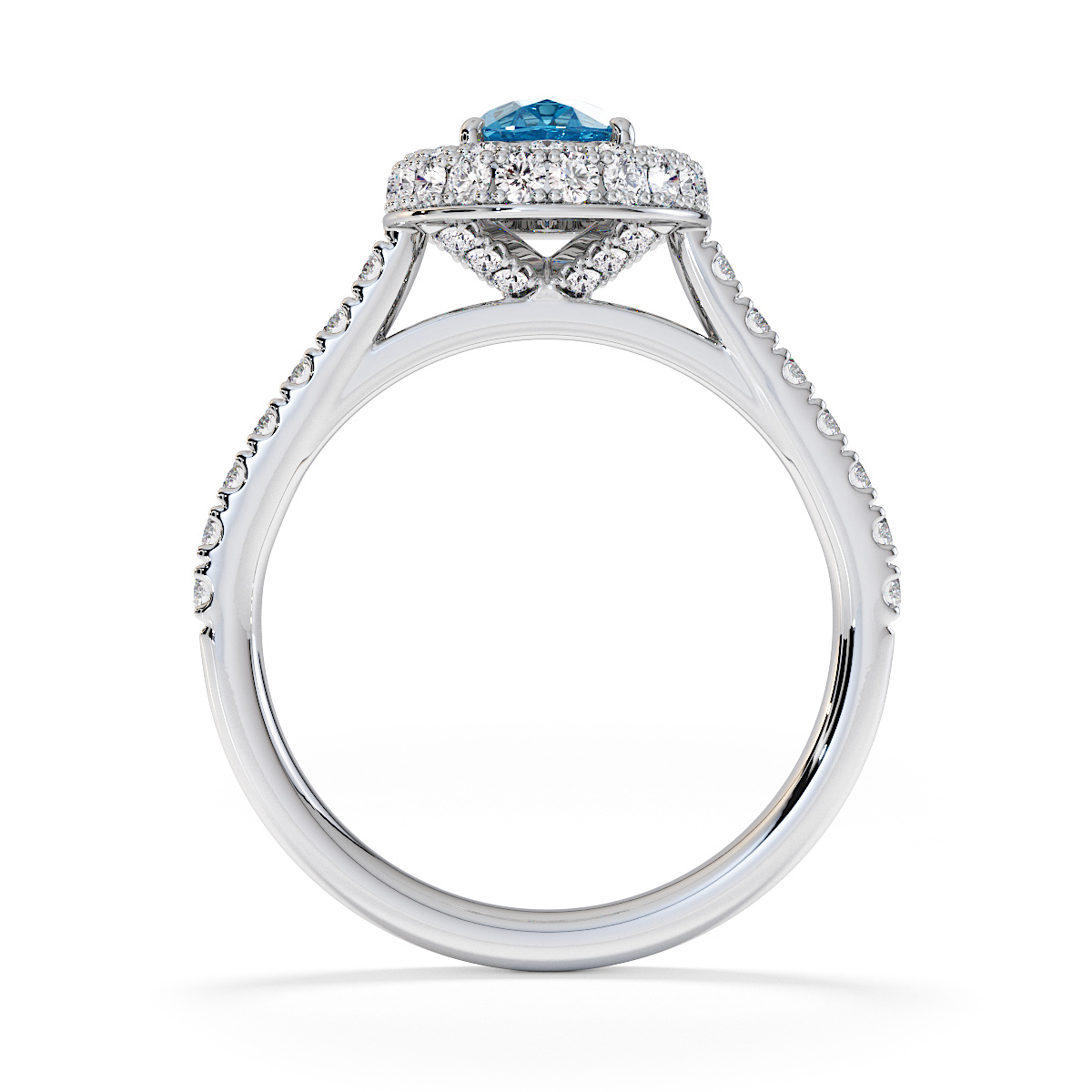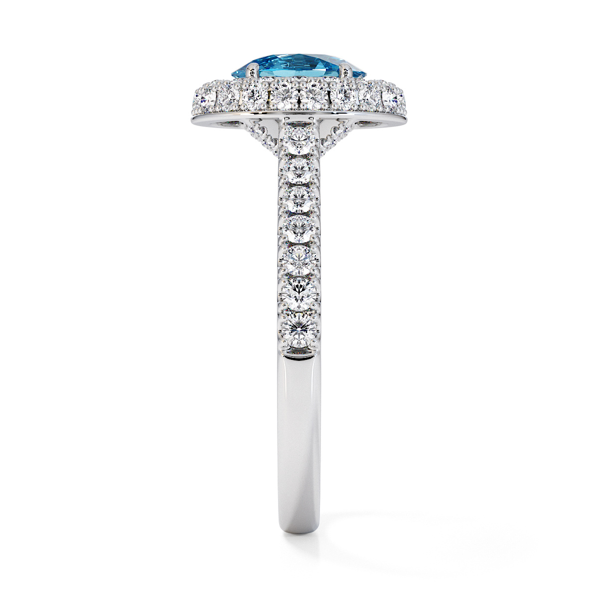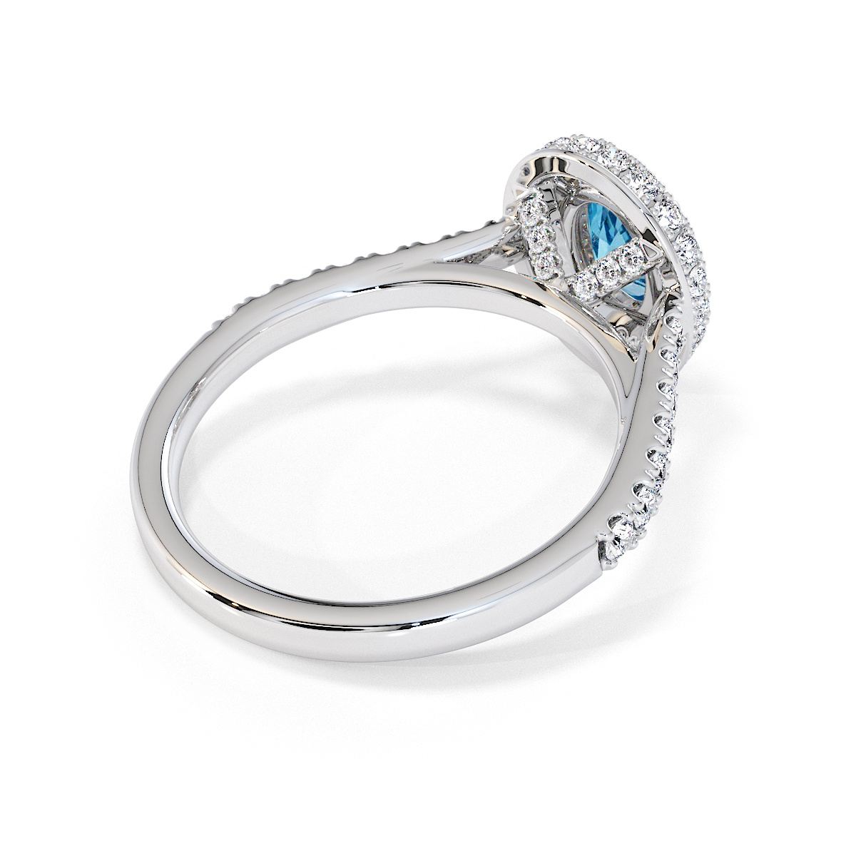 Featuring a gorgeous oval-shaped Blue Topaz and Diamond Engagement Ring, surrounded by a halo of round brilliant stones, The ring is further adorned with prong-set diamonds running up the shoulders. This engagement ring sits beautifully with the wedding ring of your choice.