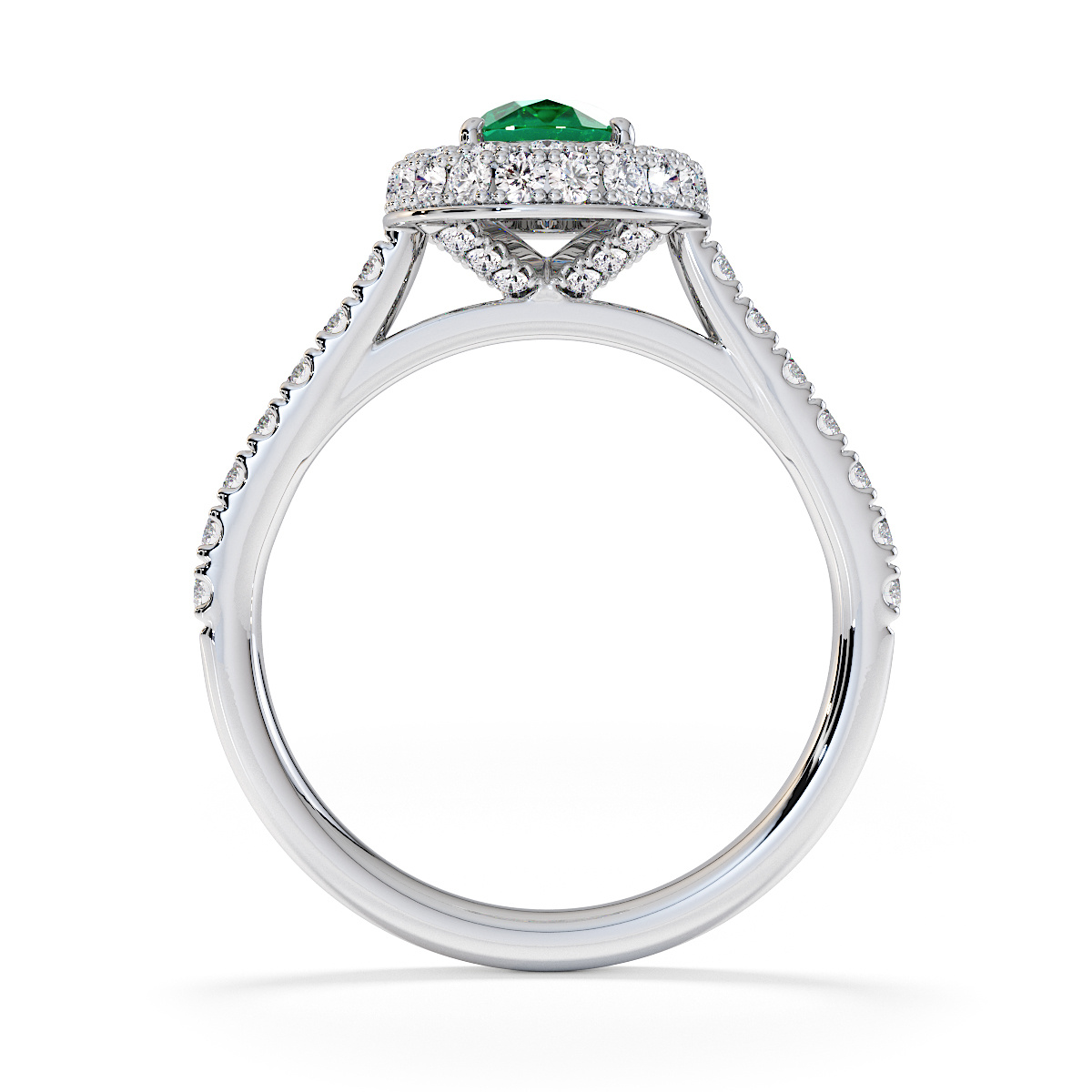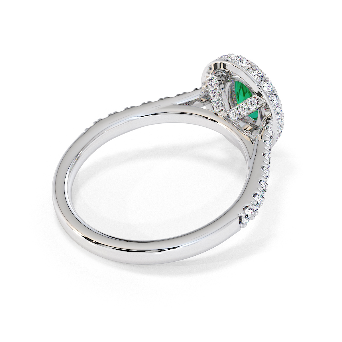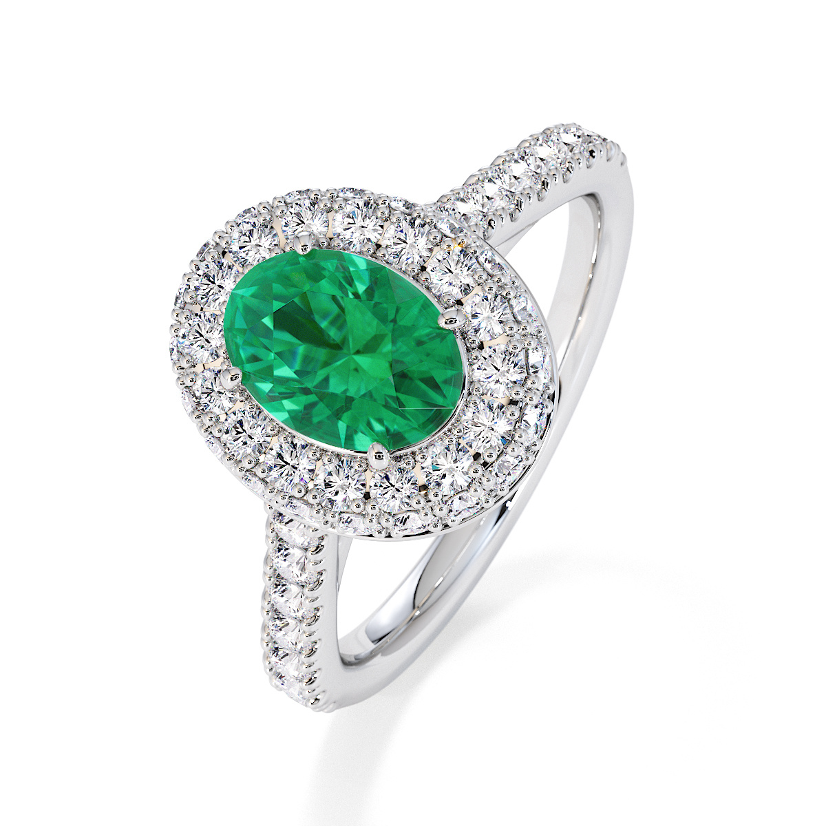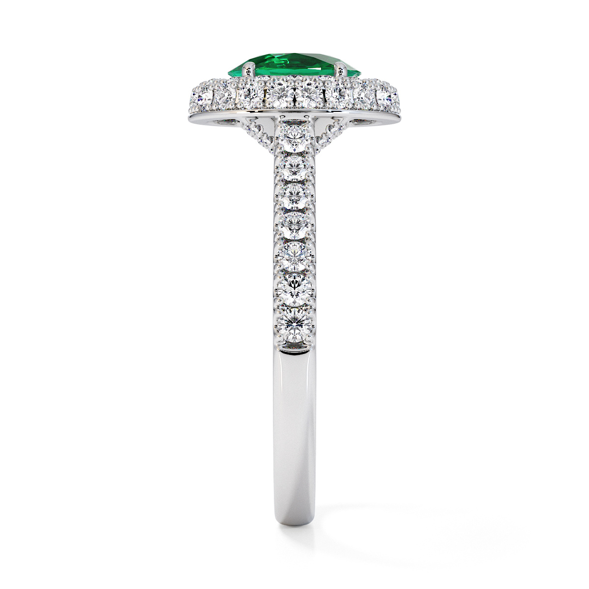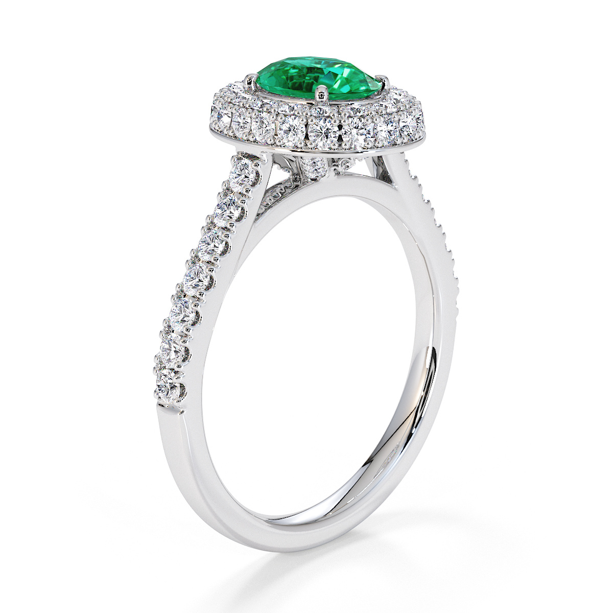 Featuring a gorgeous oval-shaped Emerald and Diamond Engagement Ring, surrounded by a halo of round brilliant stones, The ring is further adorned with prong-set diamonds running up the shoulders. This engagement ring sits beautifully with the wedding ring of your choice.