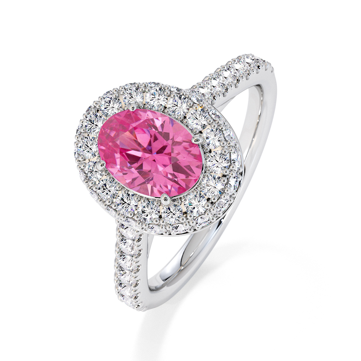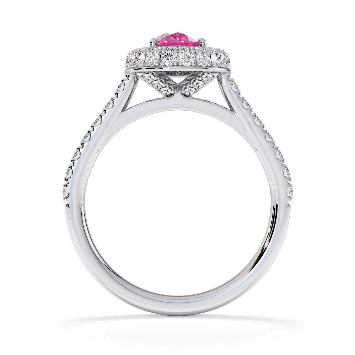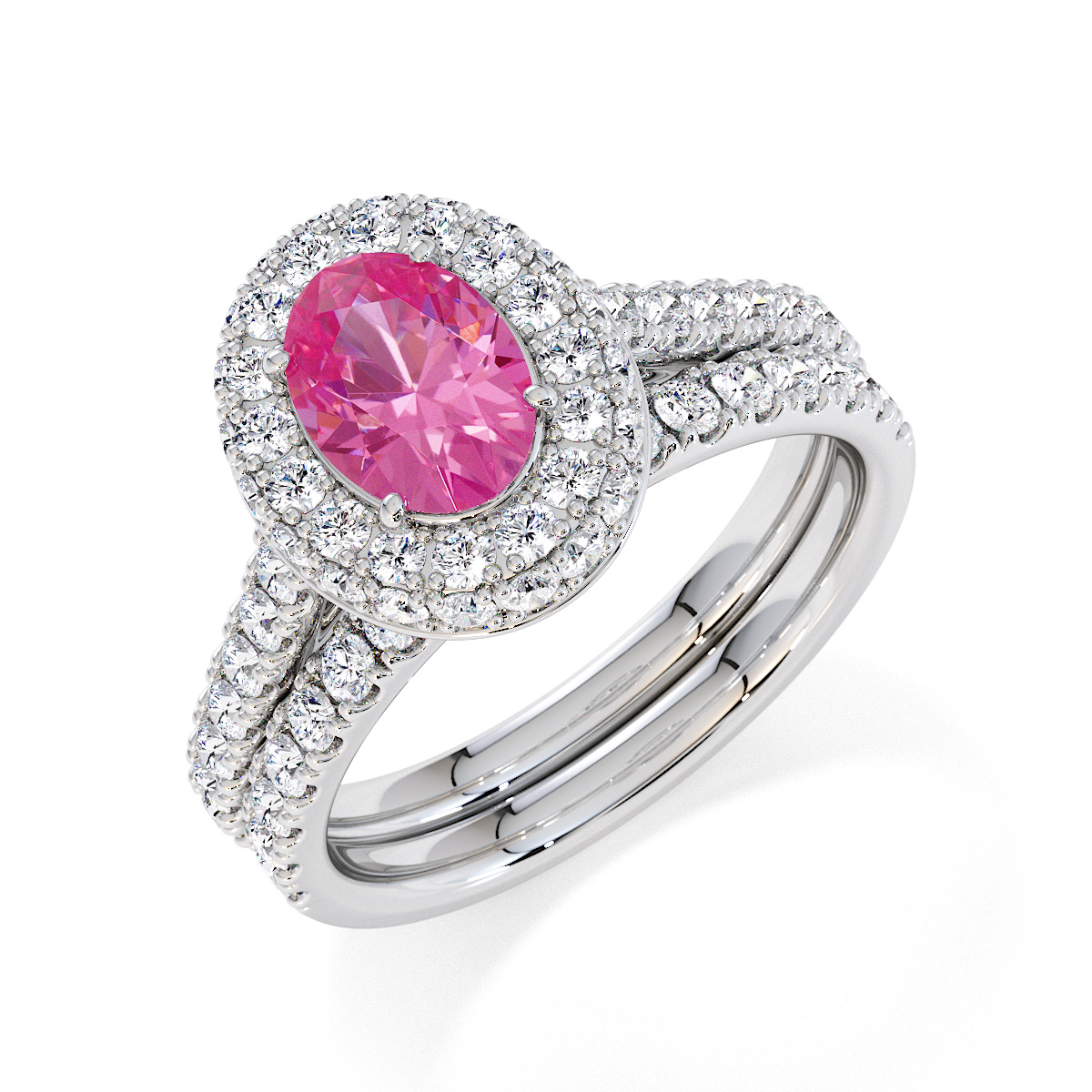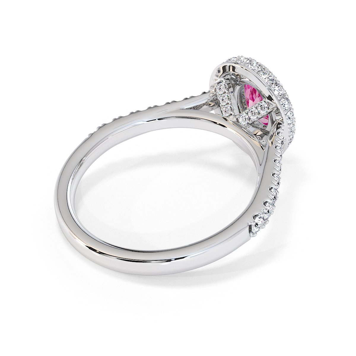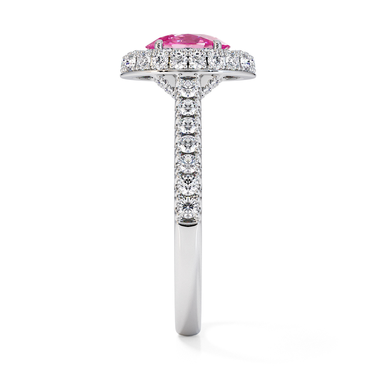 Featuring a gorgeous oval-shaped Pink Sapphire and Diamond Engagement Ring, surrounded by a halo of round brilliant stones, The ring is further adorned with prong-set diamonds running up the shoulders. This engagement ring sits beautifully with the wedding ring of your choice.