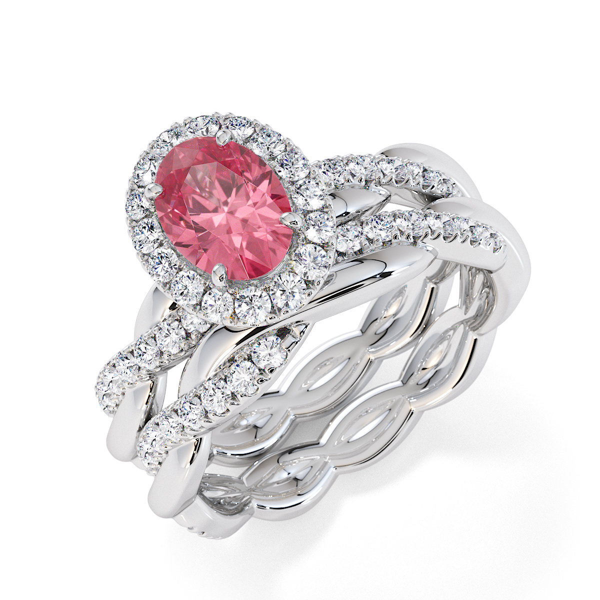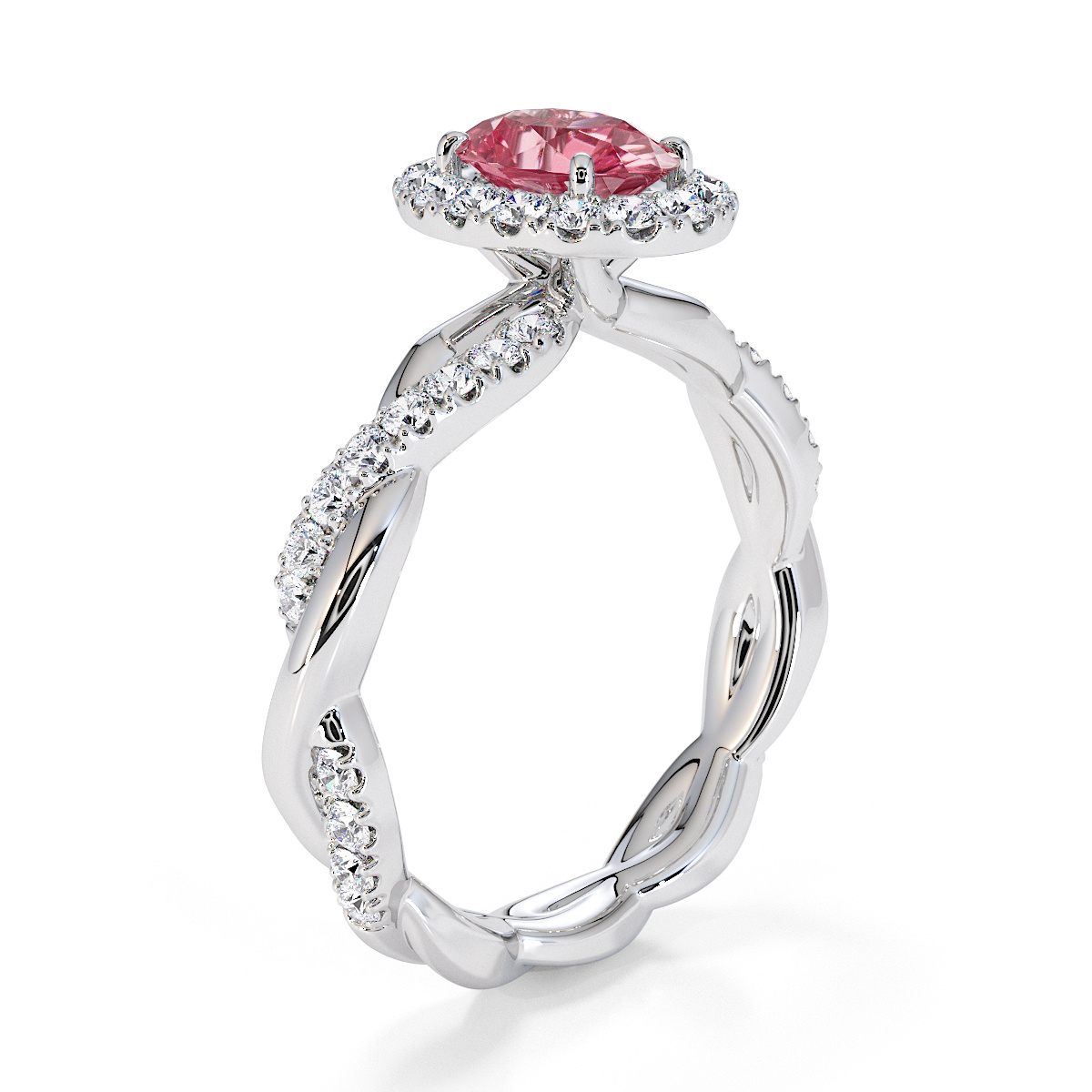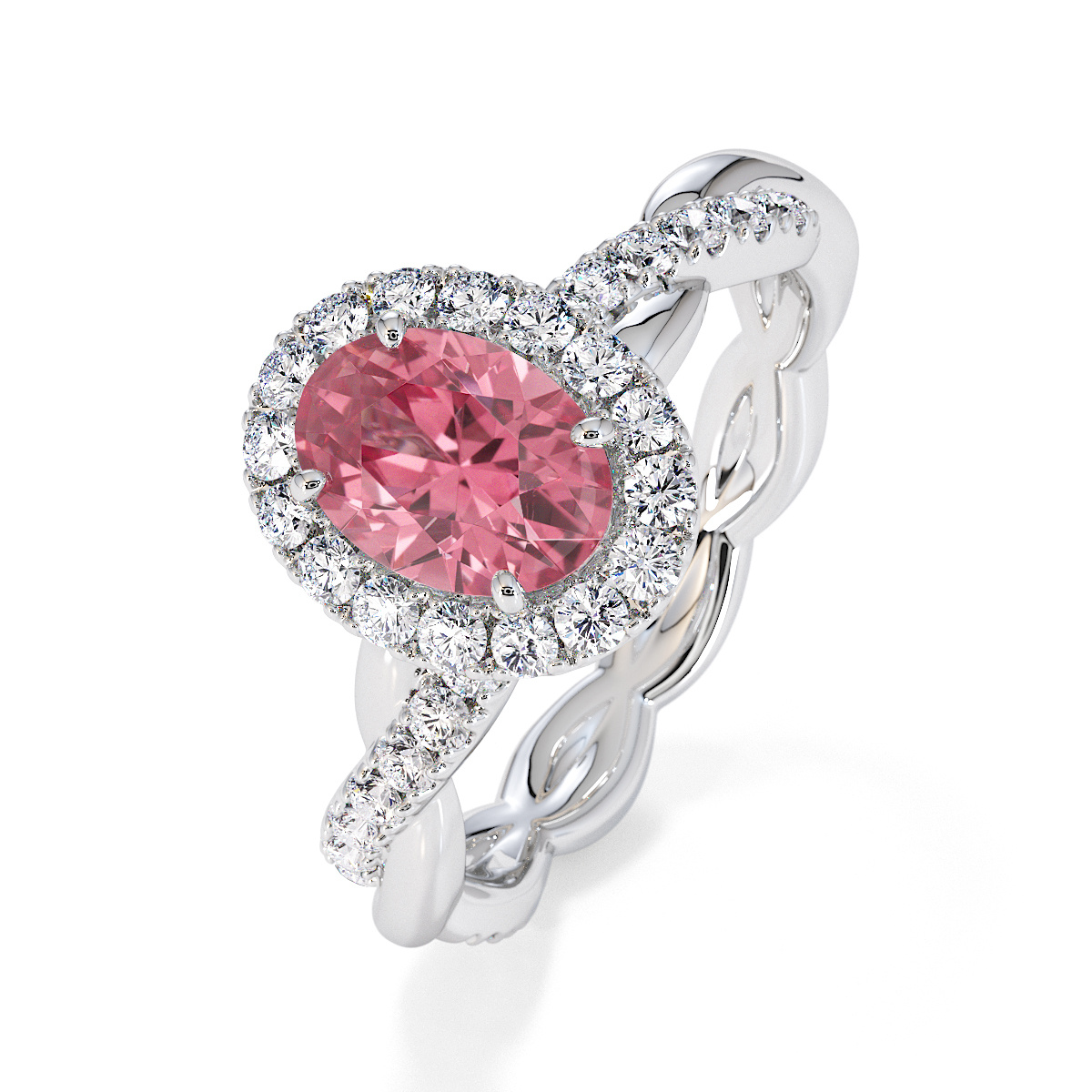 Featuring a gorgeous oval-shaped Pink Tourmaline and Diamond Engagement Ring surrounded by a halo of round brilliant stones, the ring is further adorned with prong-set diamonds running up the twisted shoulders. This engagement ring beautifully complements the wedding ring of your choice.