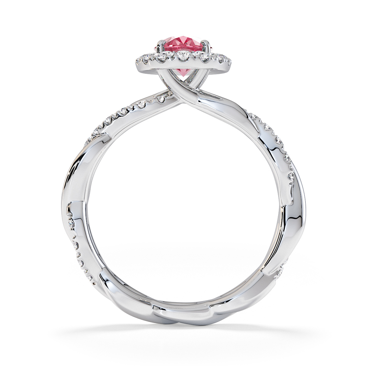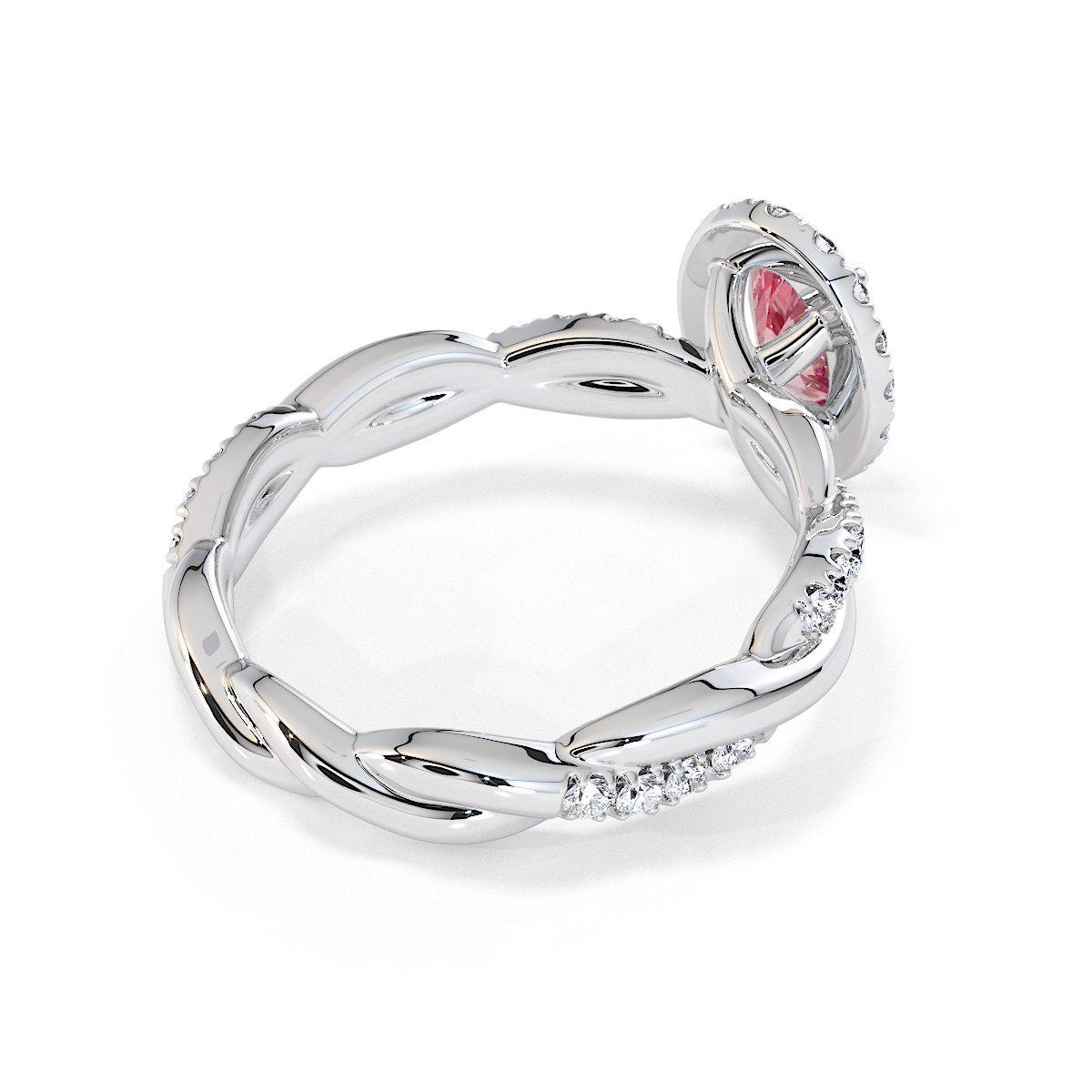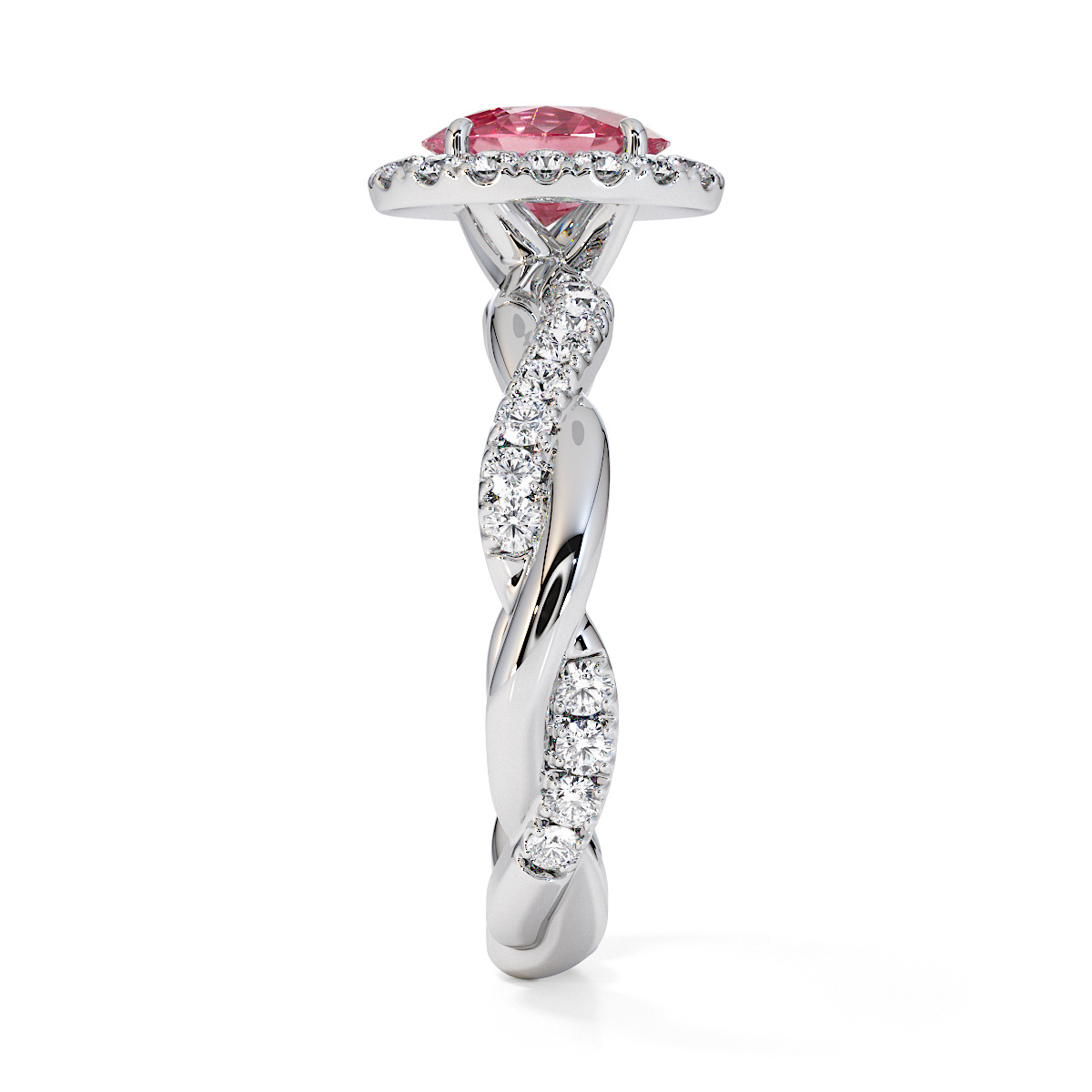Featuring a gorgeous oval-shaped Pink Tourmaline and Diamond Engagement Ring surrounded by a halo of round brilliant stones, the ring is further adorned with prong-set diamonds running up the twisted shoulders. This engagement ring beautifully complements the wedding ring of your choice.