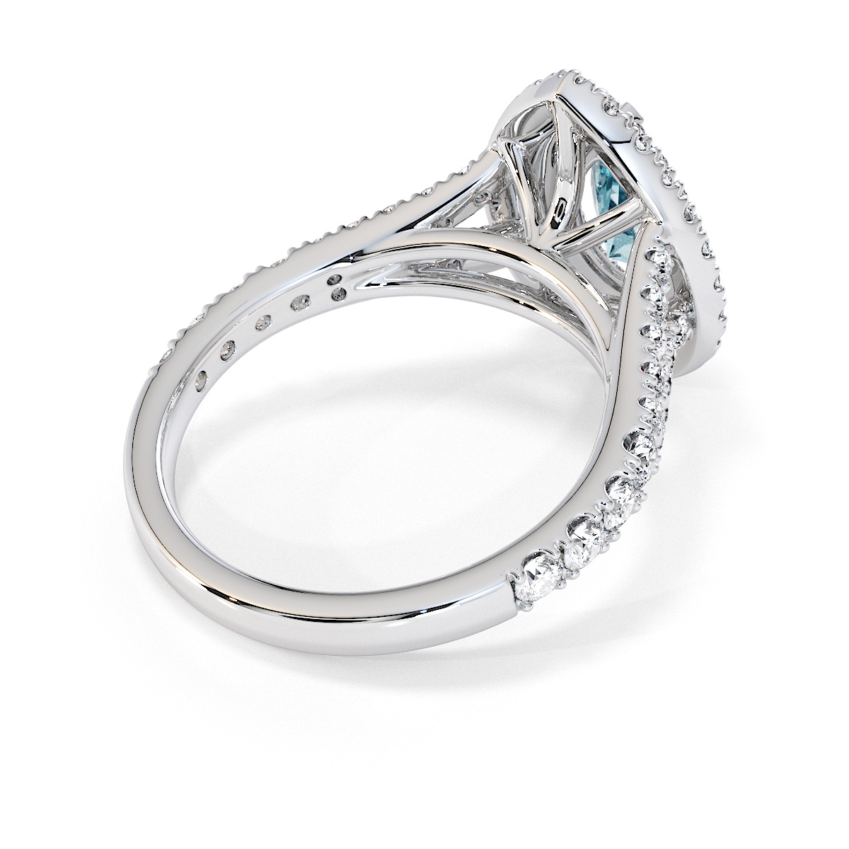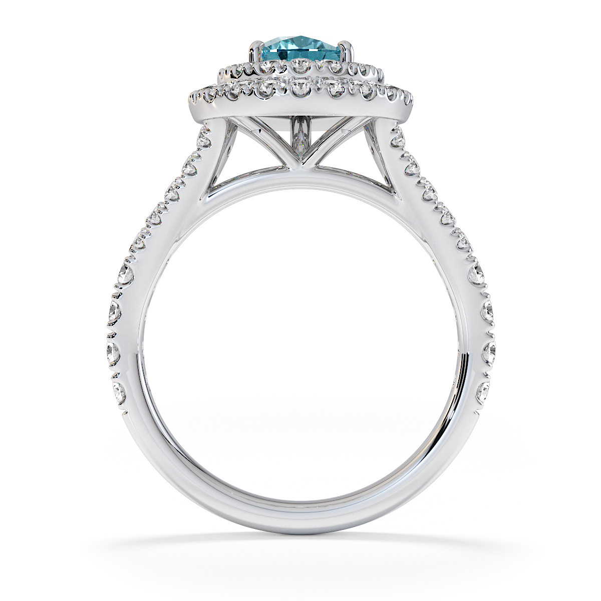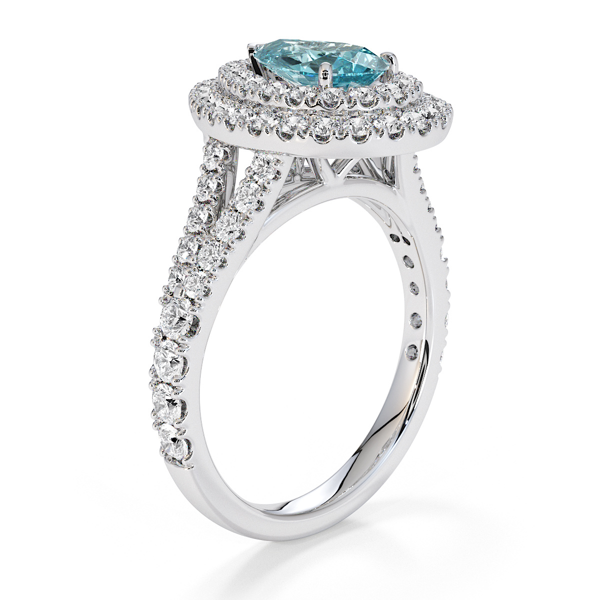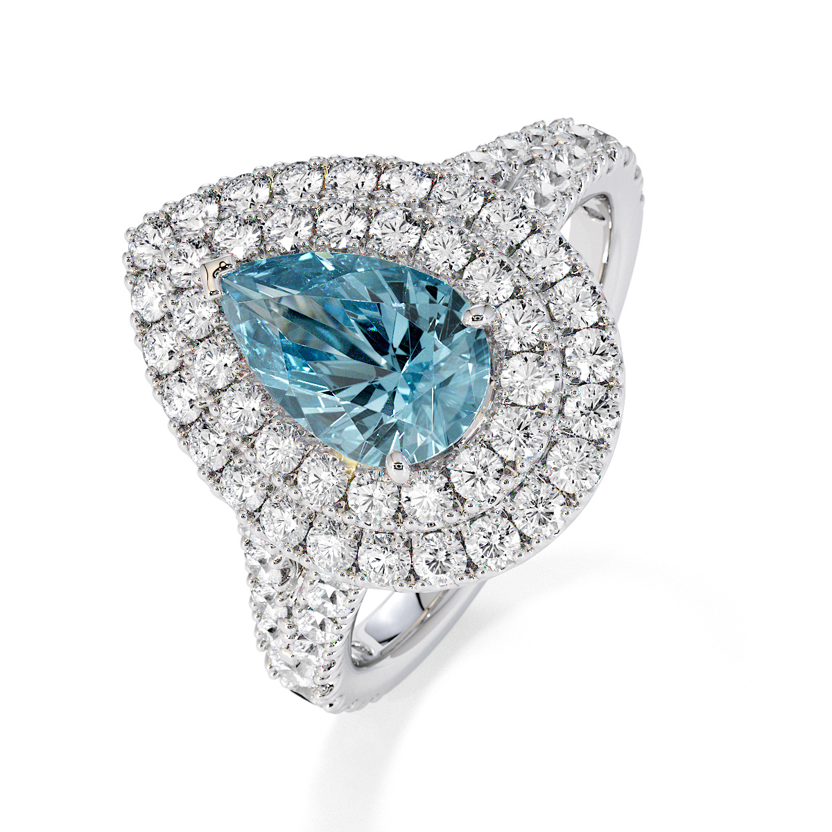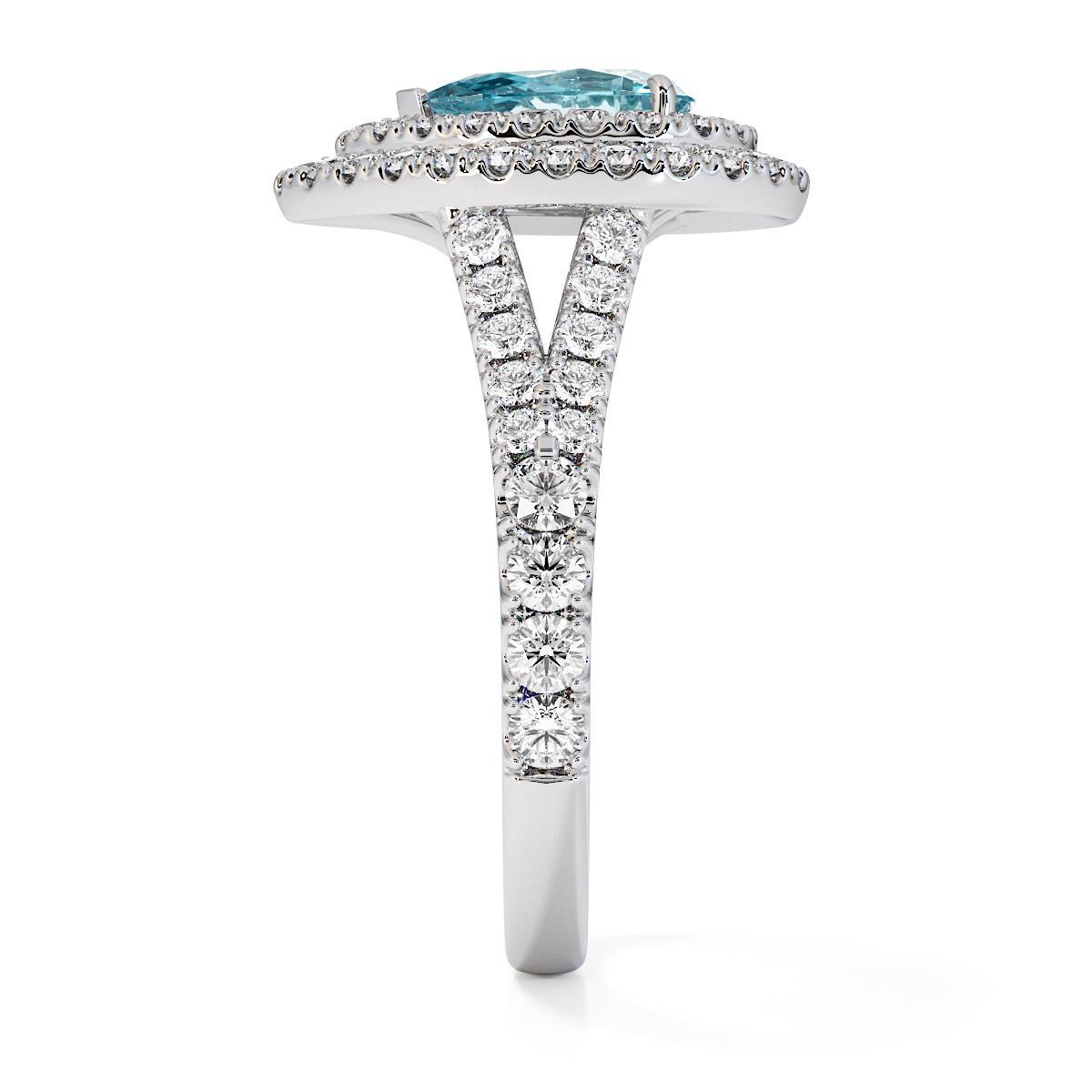 Featuring a gorgeous pear-shaped Aquamarine and Diamond Engagement Ring surrounded by a double halo of round brilliant stones, the ring is further adorned with prong-set diamonds running up the split shank shoulders. This engagement ring beautifully complements the wedding ring of your choice.