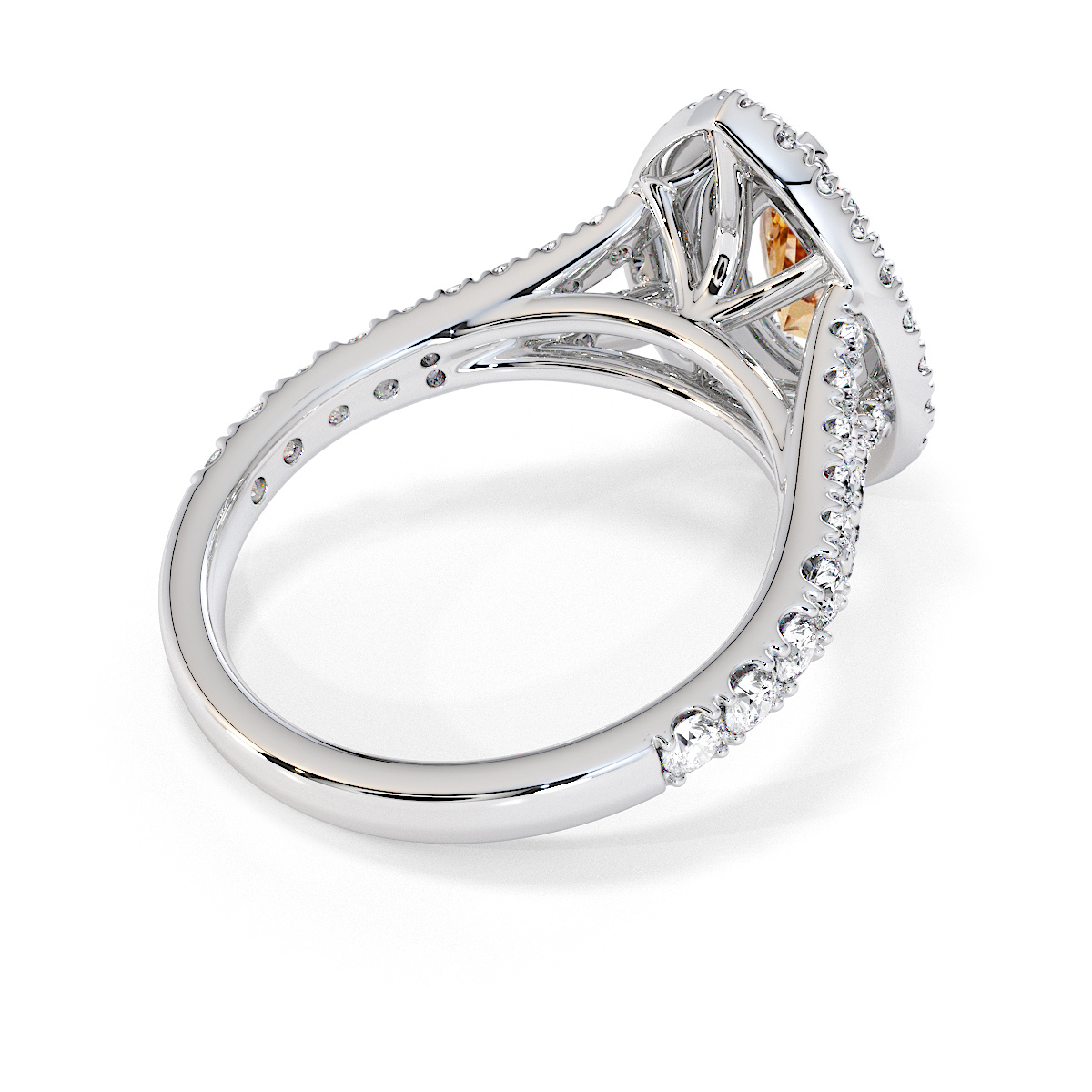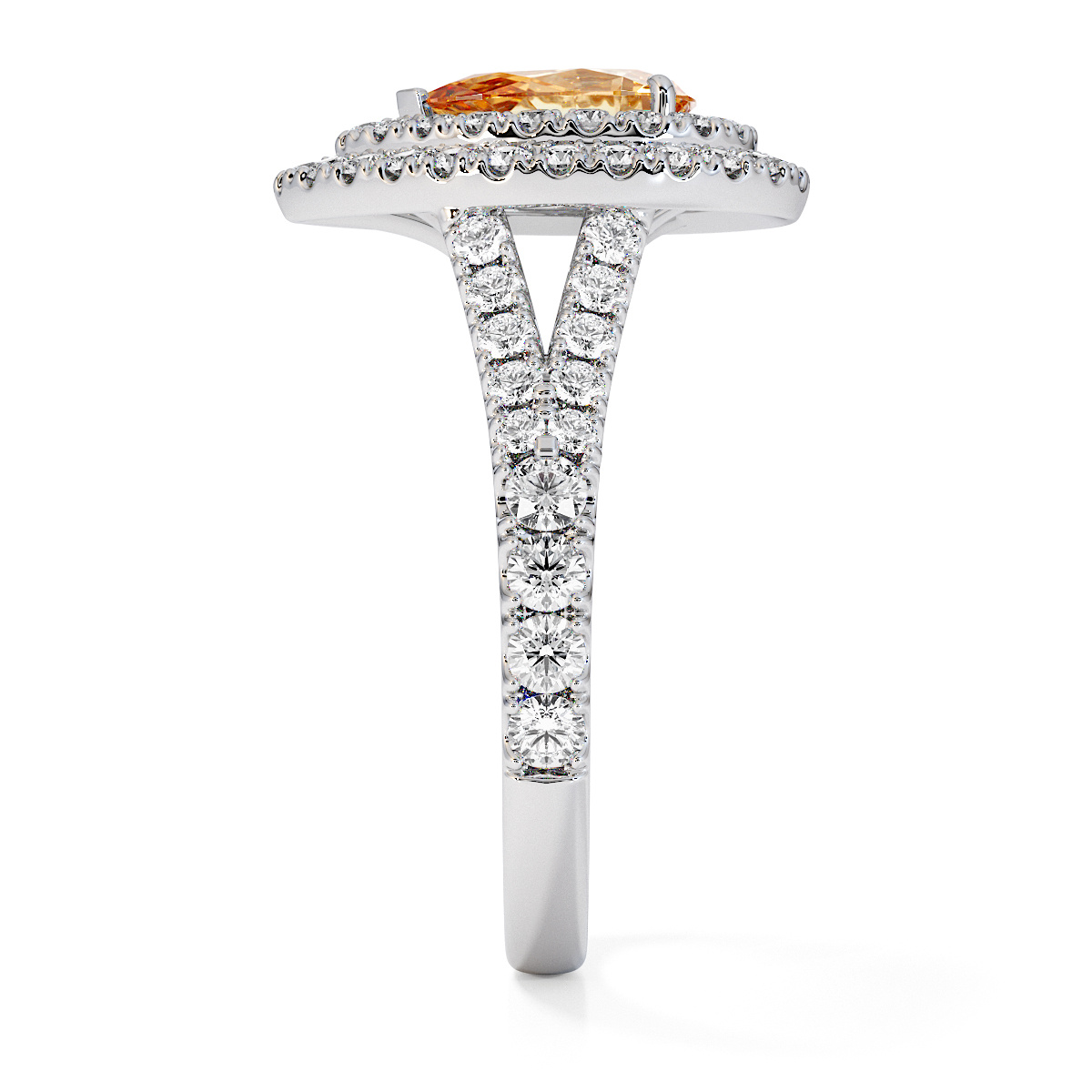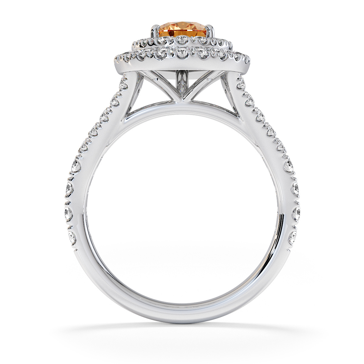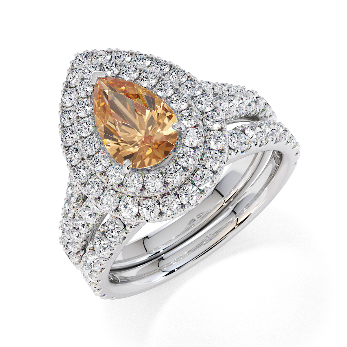 Featuring a gorgeous pear-shaped Citrine and Diamond Engagement Ring surrounded by a double halo of round brilliant stones, the ring is further adorned with prong-set diamonds running up the split shank shoulders. This engagement ring beautifully complements the wedding ring of your choice.