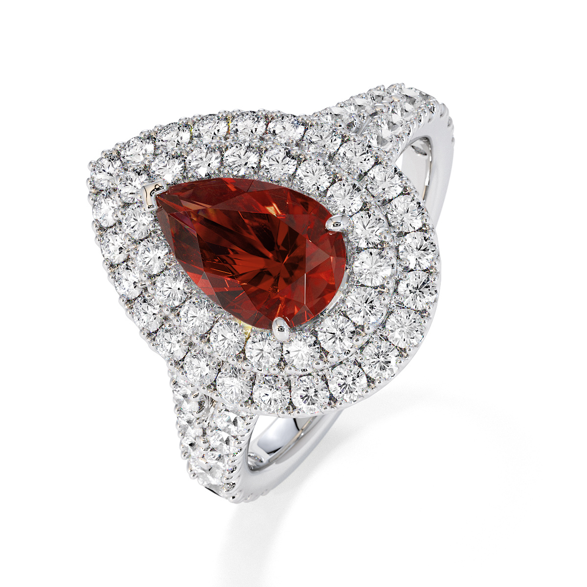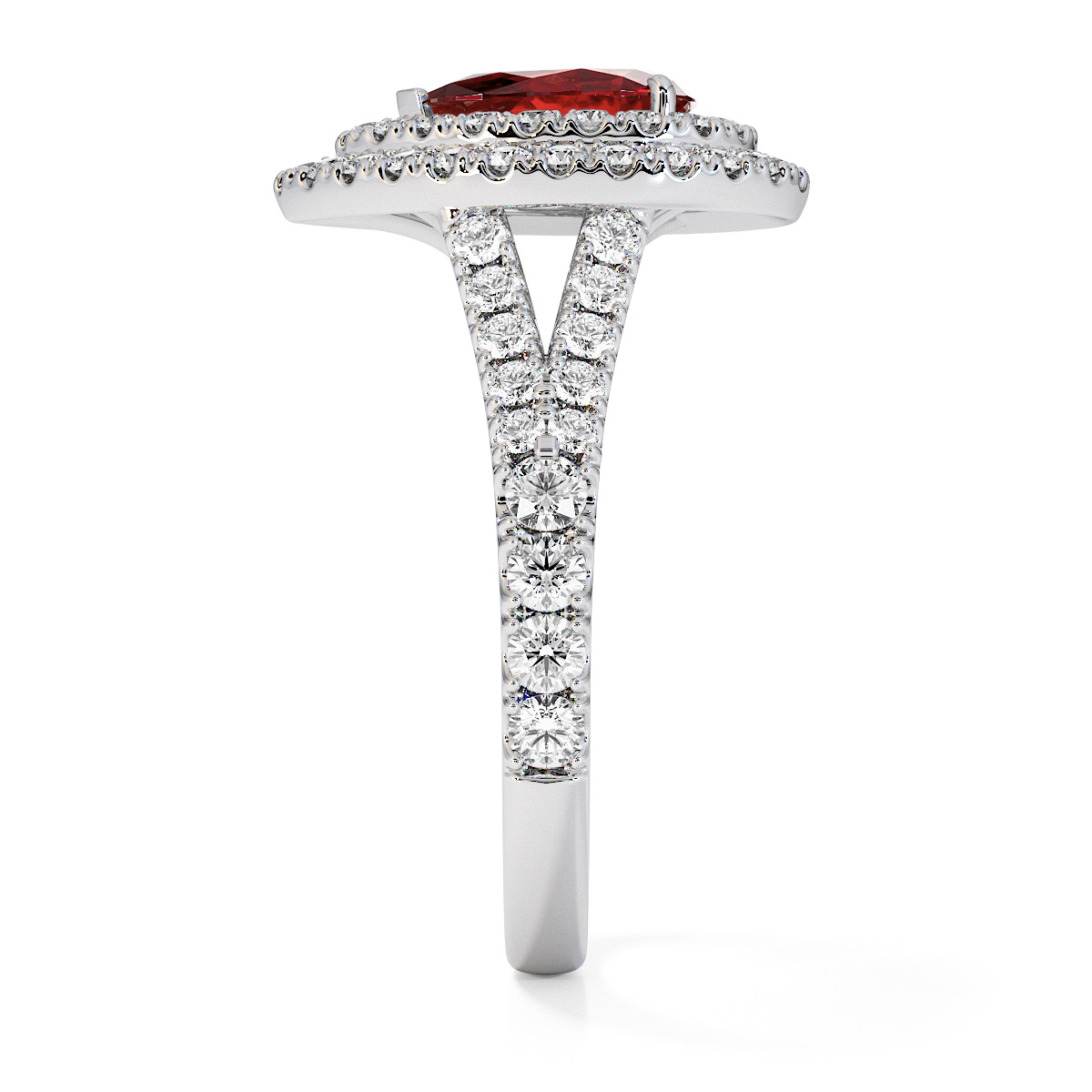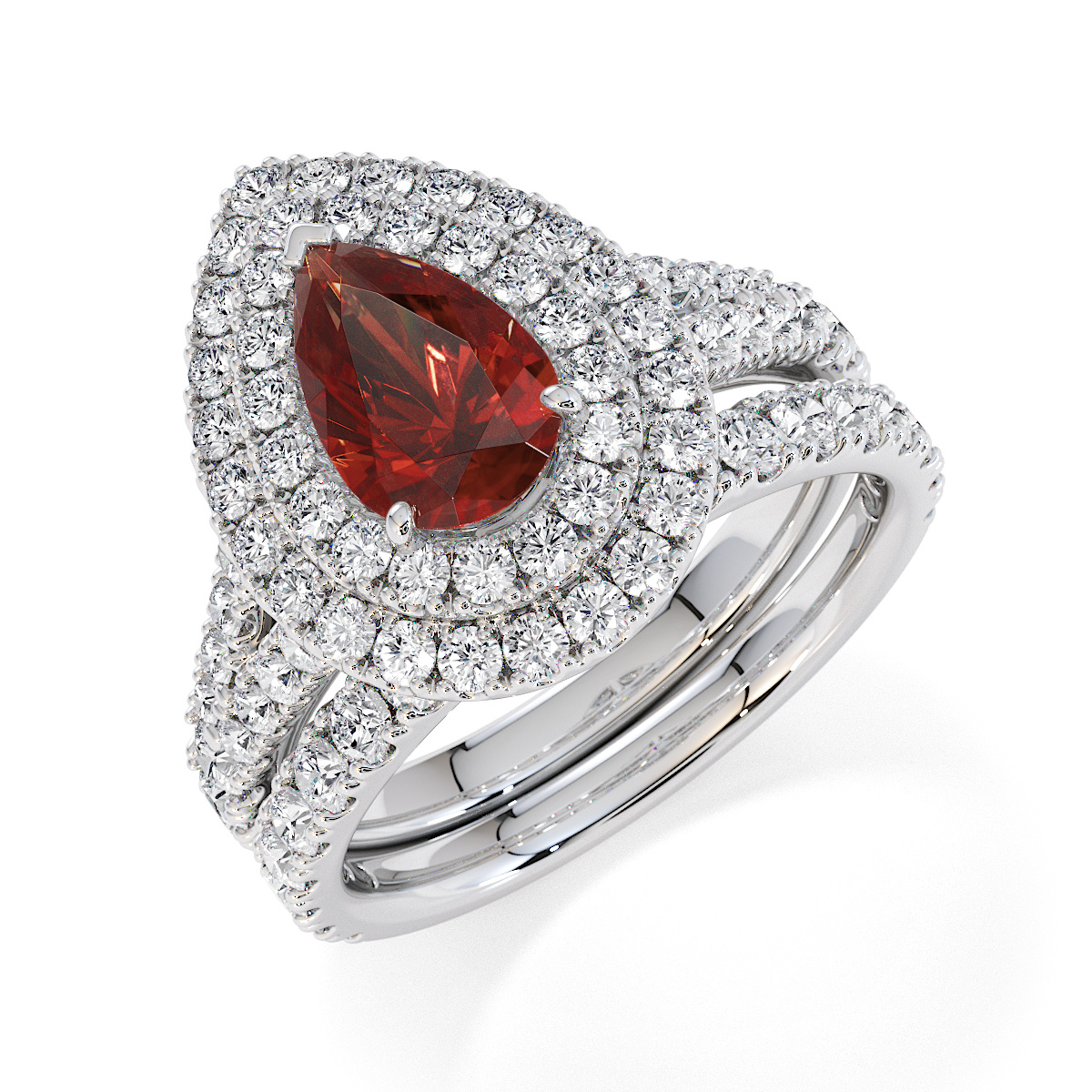 Featuring a gorgeous pear-shaped Garnet and Diamond Engagement Ring surrounded by a double halo of round brilliant stones, the ring is further adorned with prong-set diamonds running up the split shank shoulders. This engagement ring beautifully complements the wedding ring of your choice.