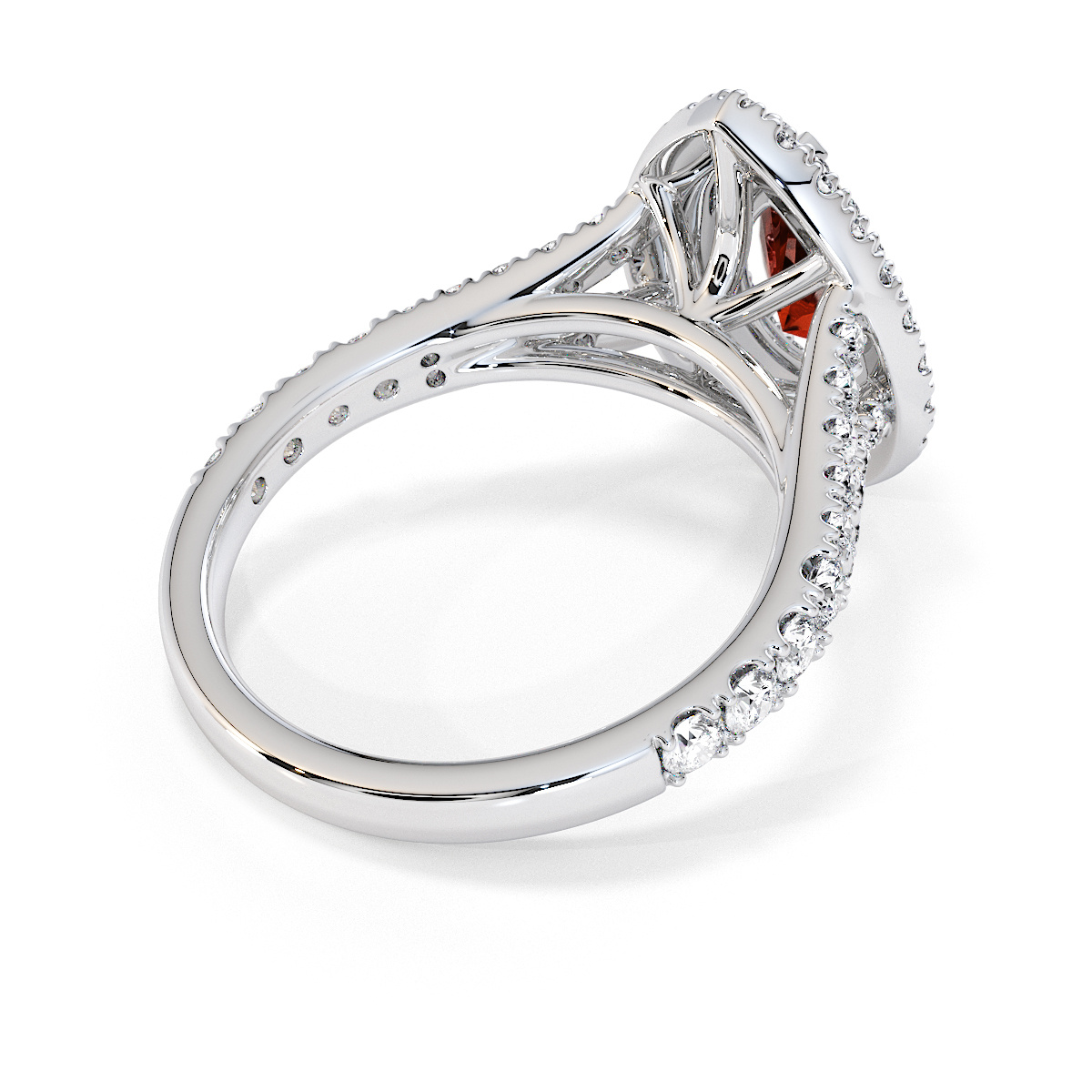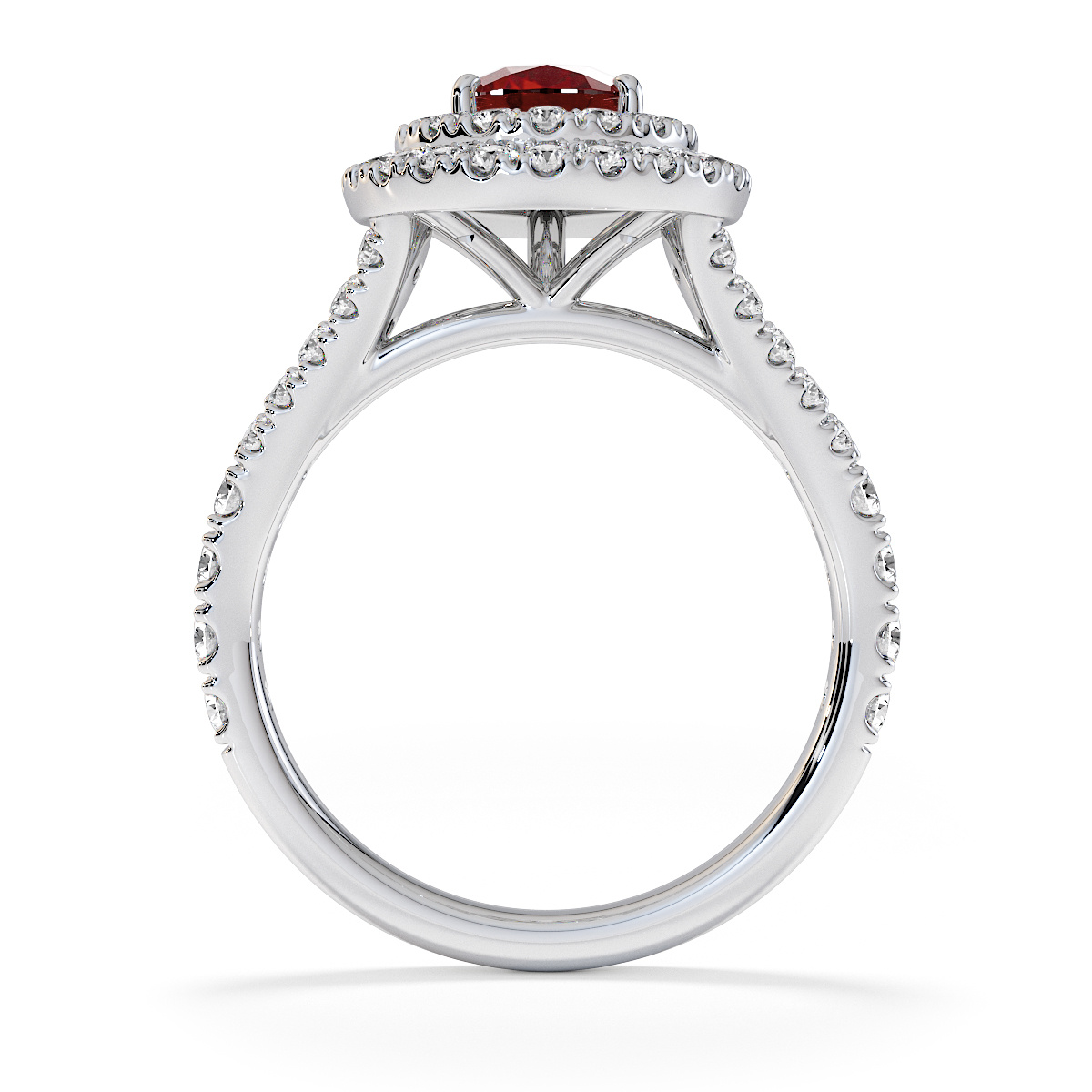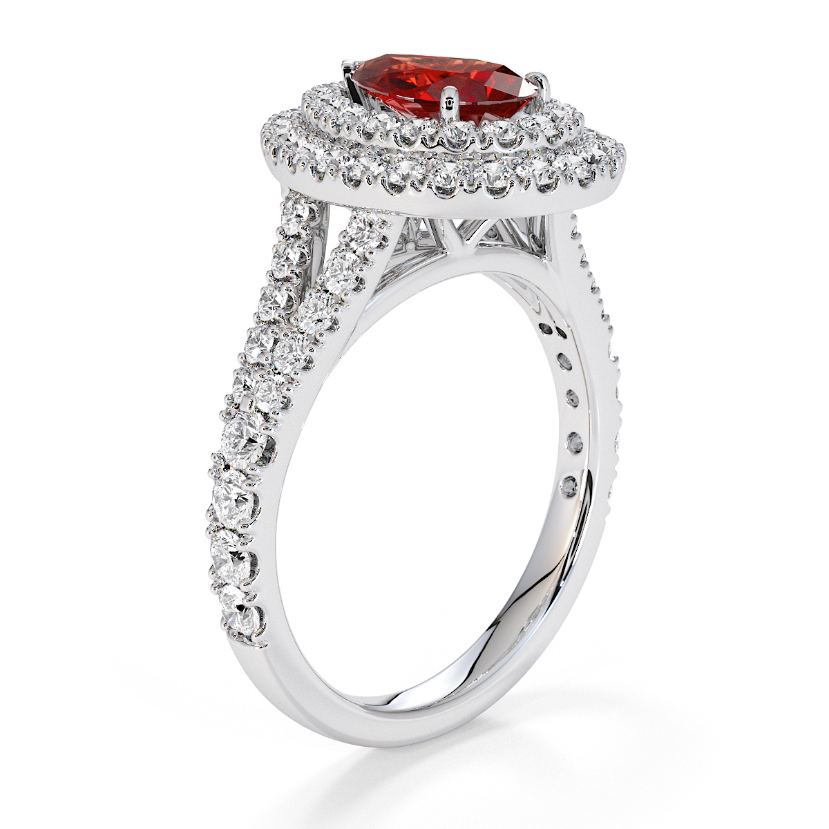 Featuring a gorgeous pear-shaped Garnet and Diamond Engagement Ring surrounded by a double halo of round brilliant stones, the ring is further adorned with prong-set diamonds running up the split shank shoulders. This engagement ring beautifully complements the wedding ring of your choice.
