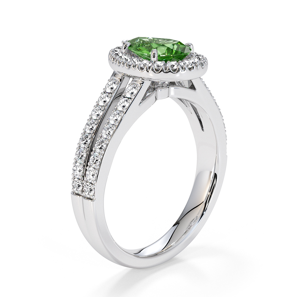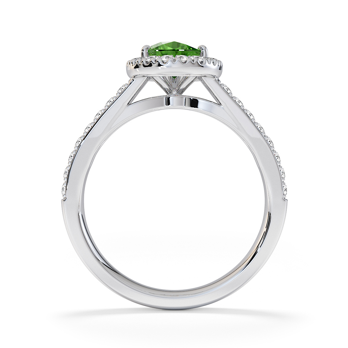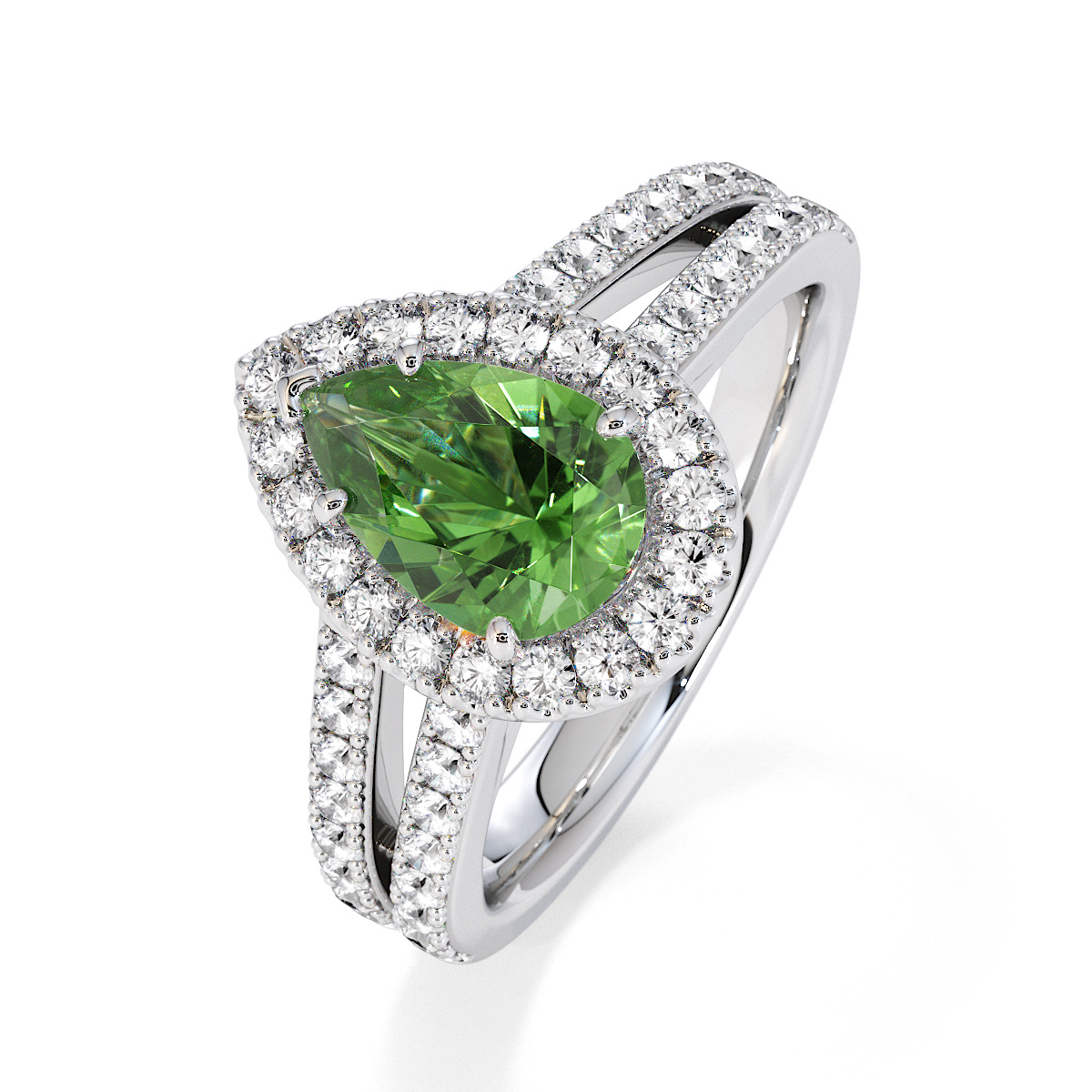 Featuring a gorgeous pear-shaped Green Tourmaline and Diamond Engagement Ring surrounded by a halo of round brilliant stones, the ring is further adorned with prong-set diamonds running up the split shank shoulders. This engagement ring beautifully complements the wedding ring of your choice.