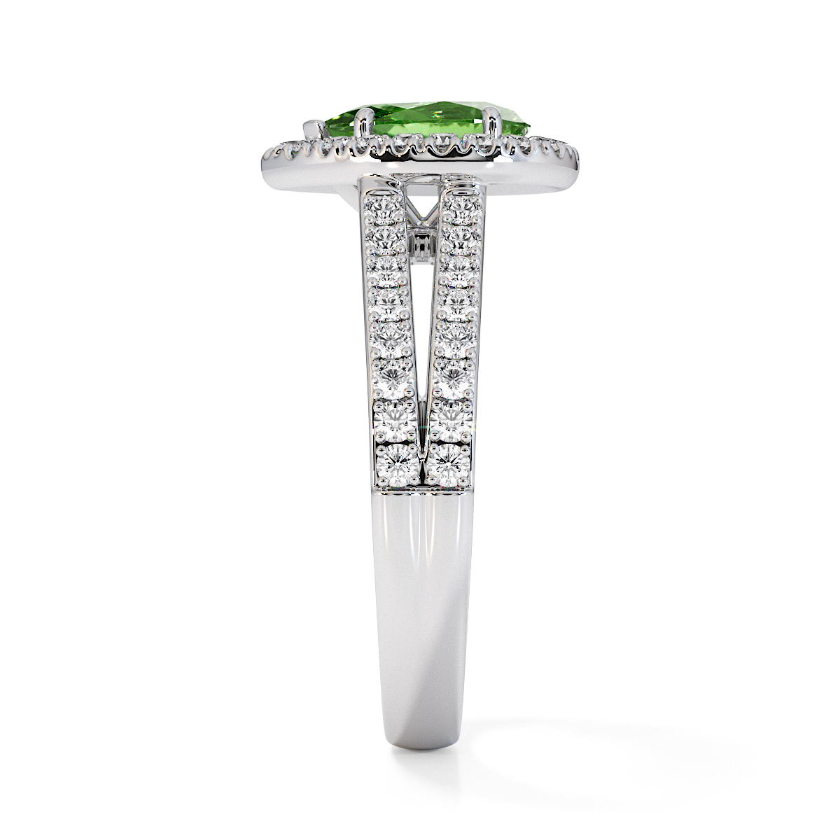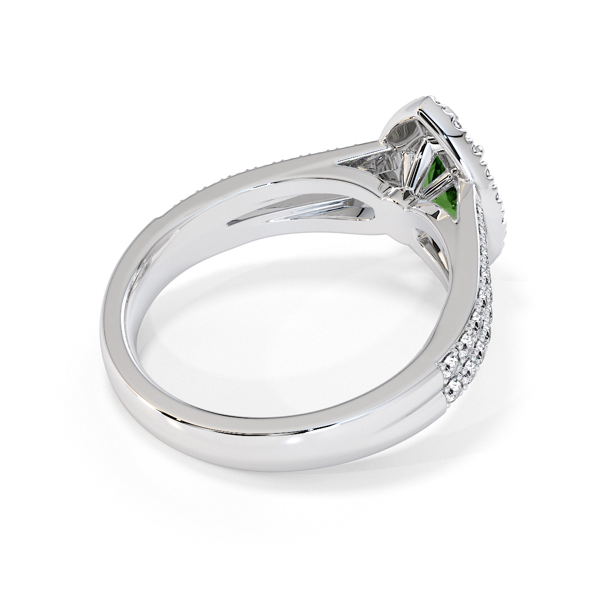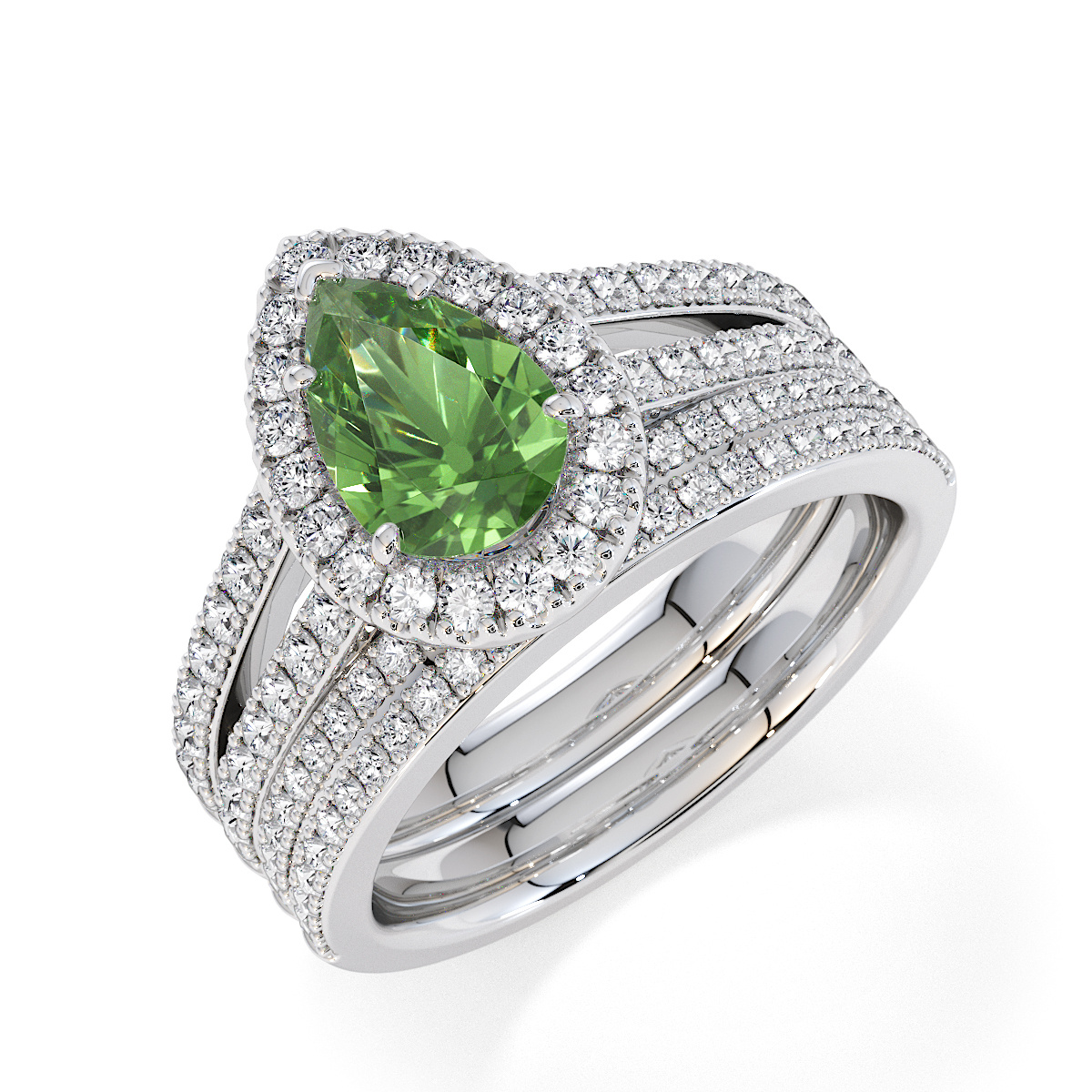 Featuring a gorgeous pear-shaped Green Tourmaline and Diamond Engagement Ring surrounded by a halo of round brilliant stones, the ring is further adorned with prong-set diamonds running up the split shank shoulders. This engagement ring beautifully complements the wedding ring of your choice.