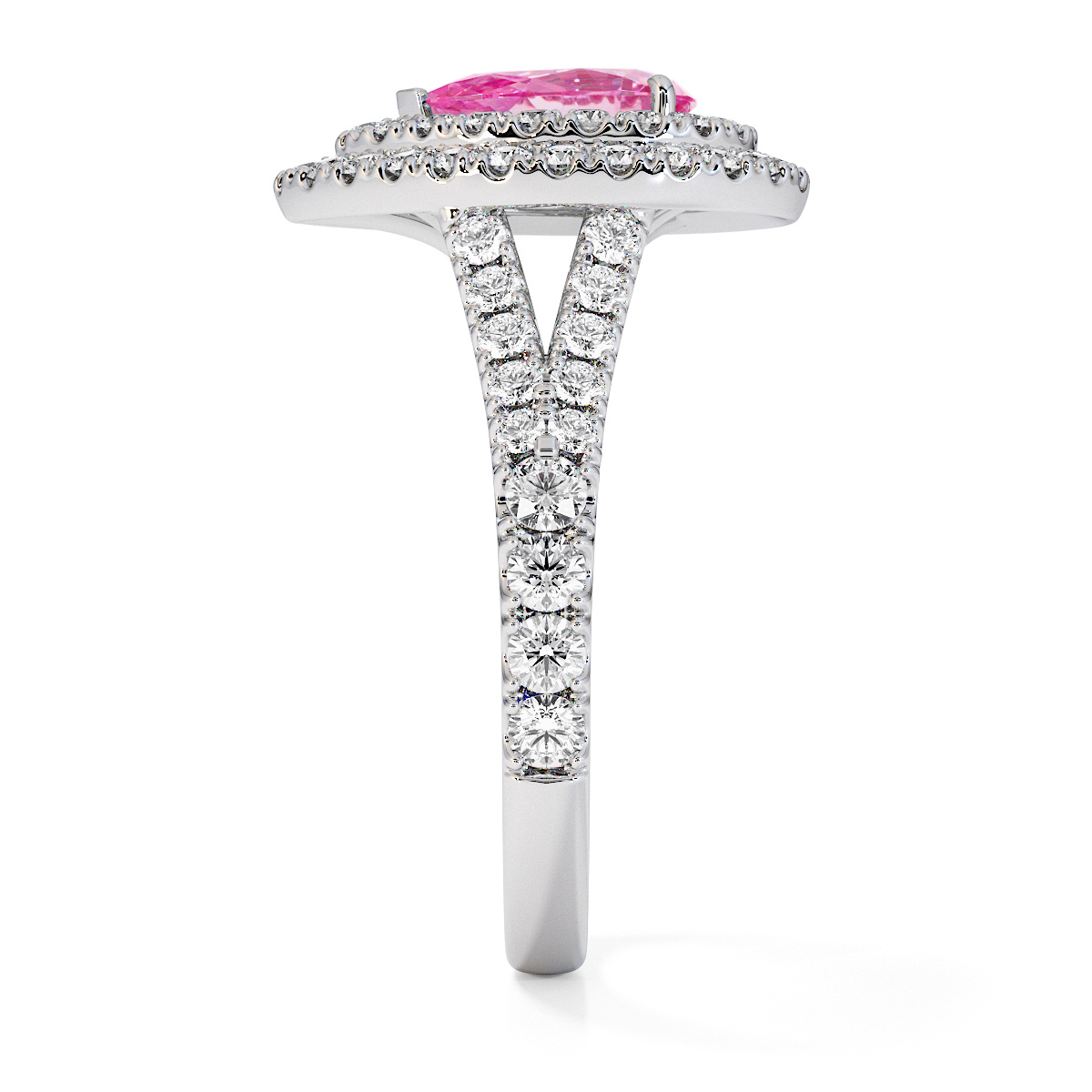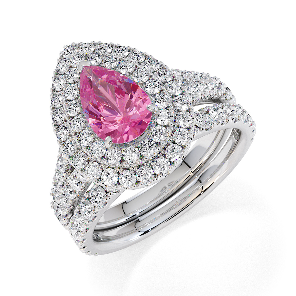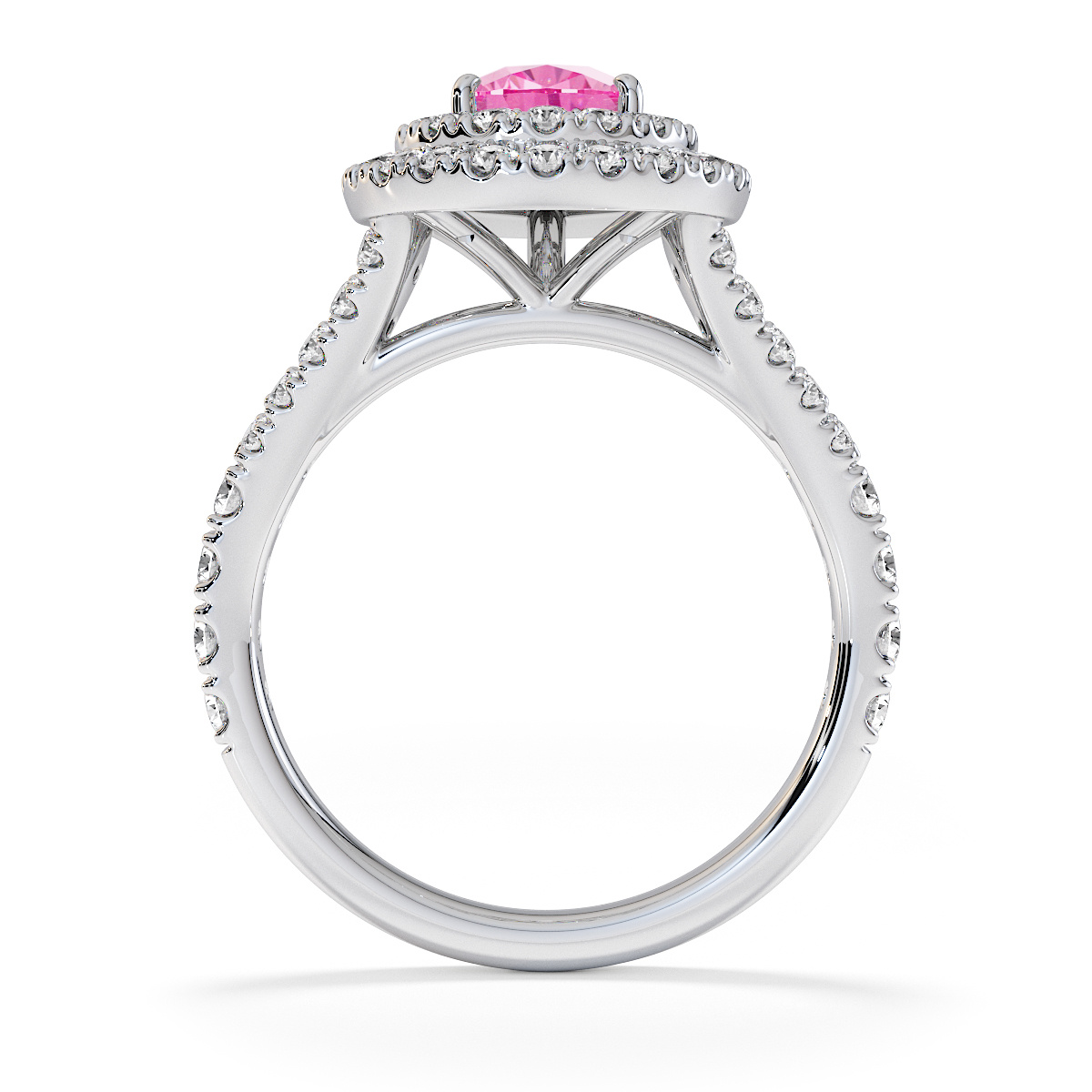 Featuring a gorgeous pear-shaped Pink Sapphire and Diamond Engagement Ring surrounded by a double halo of round brilliant stones, the ring is further adorned with prong-set diamonds running up the split shank shoulders. This engagement ring beautifully complements the wedding ring of your choice.