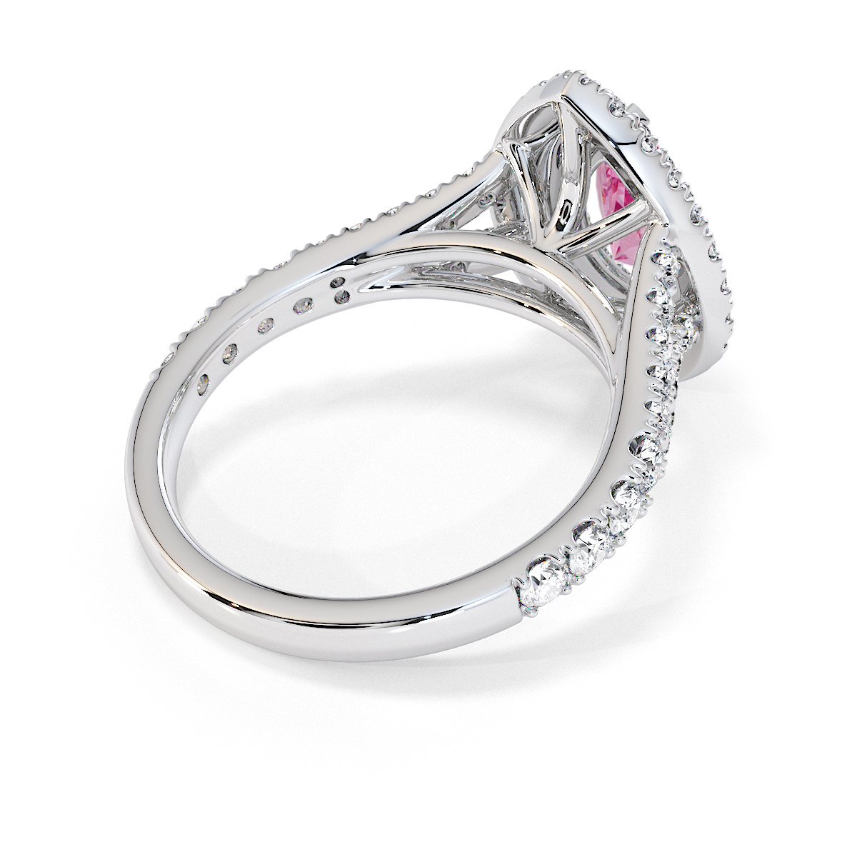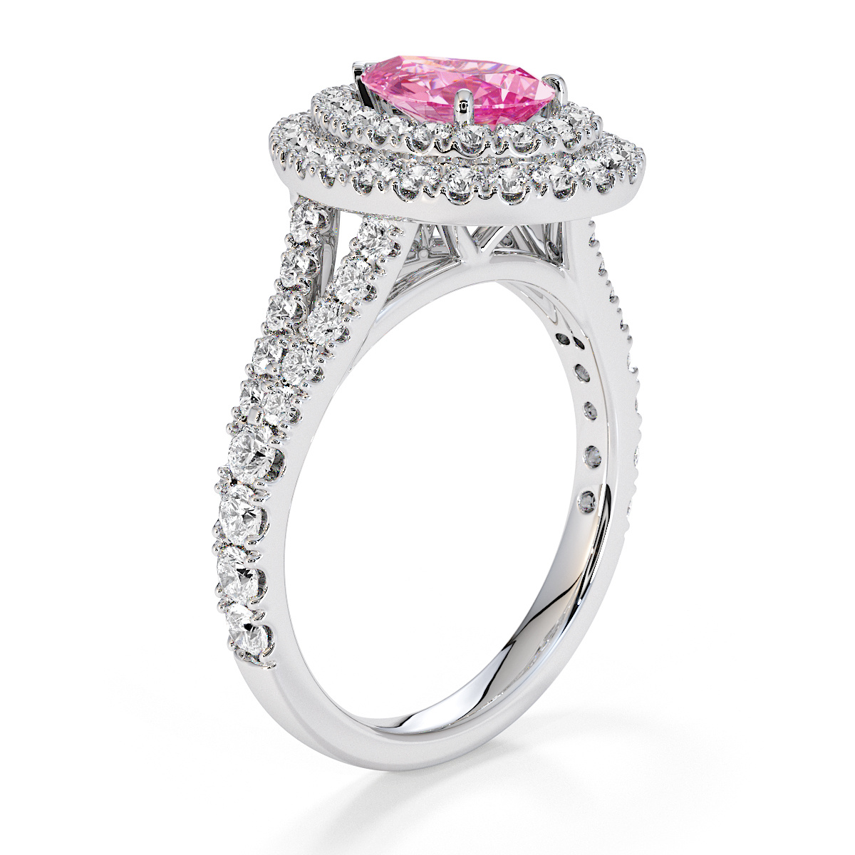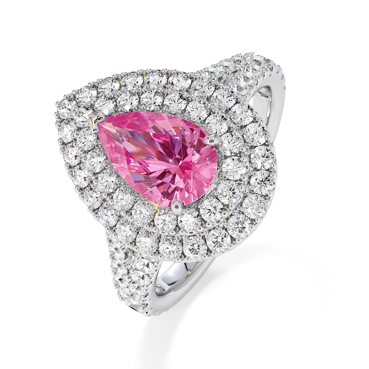 Featuring a gorgeous pear-shaped Pink Sapphire and Diamond Engagement Ring surrounded by a double halo of round brilliant stones, the ring is further adorned with prong-set diamonds running up the split shank shoulders. This engagement ring beautifully complements the wedding ring of your choice.