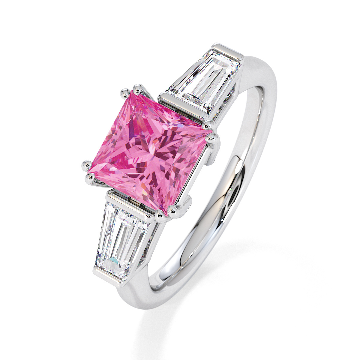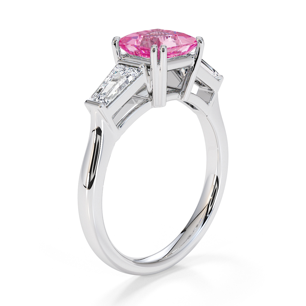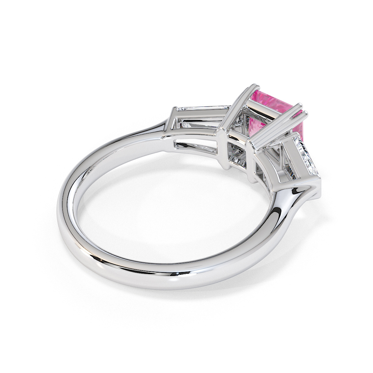 Introducing our exquisite Princess Cut Pink Sapphire and Diamond Engagement Ring, featuring elegant side-tapered baguette diamonds intricately prong-set.