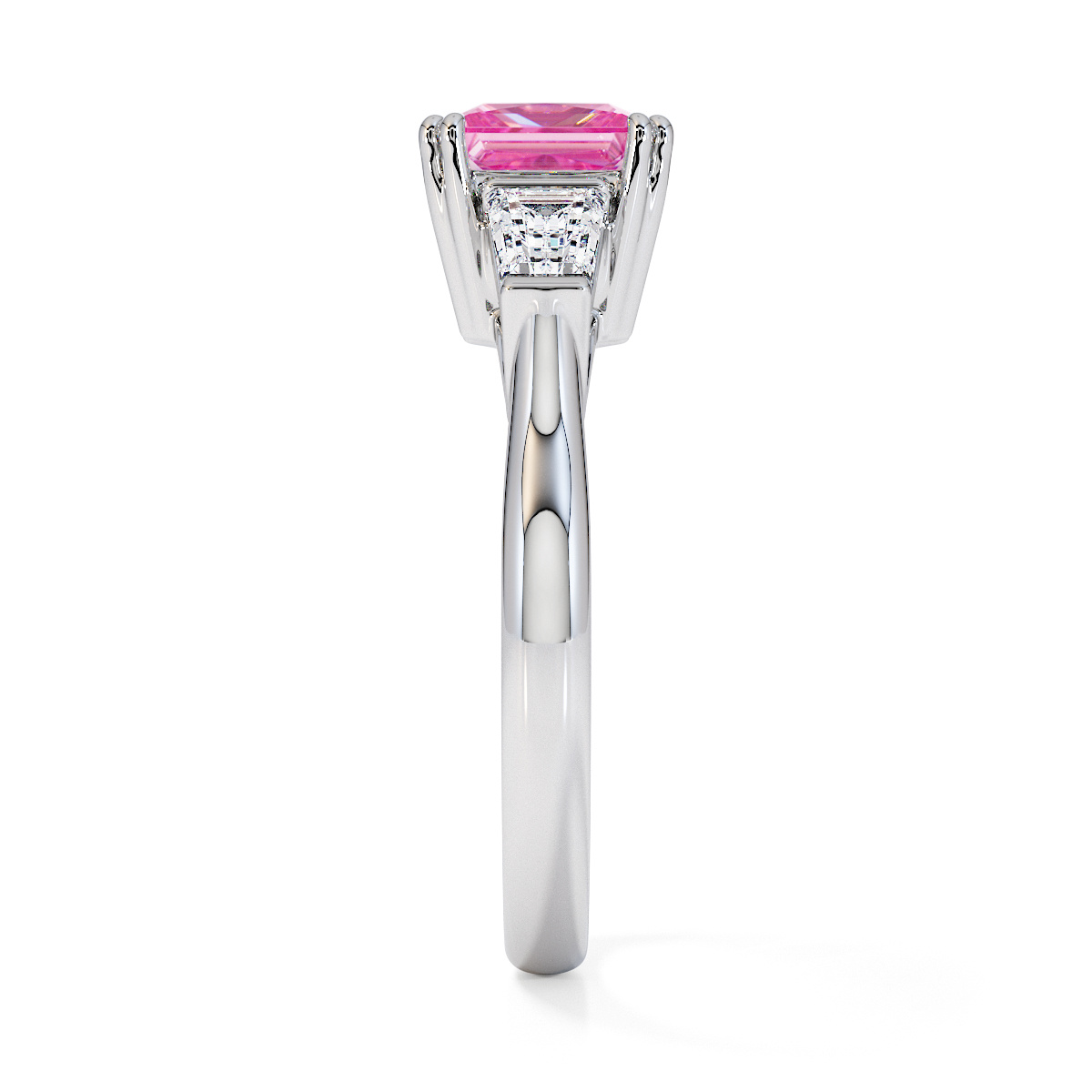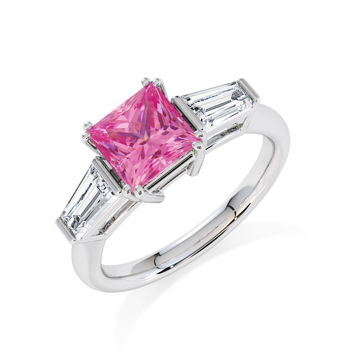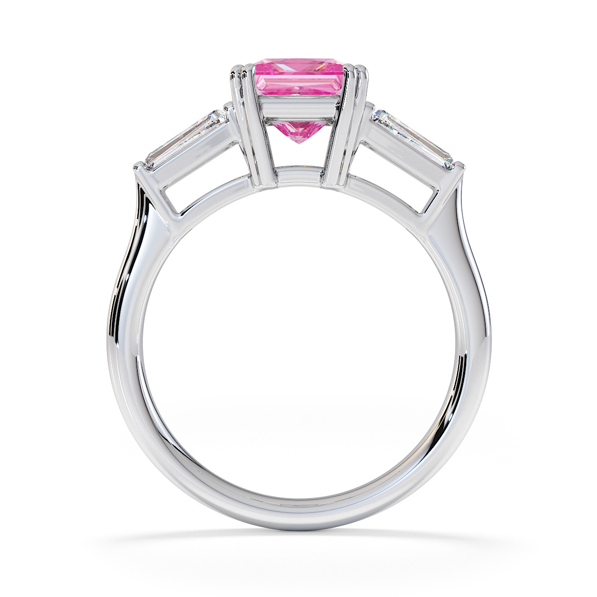 Introducing our exquisite Princess Cut Pink Sapphire and Diamond Engagement Ring, featuring elegant side-tapered baguette diamonds intricately prong-set.