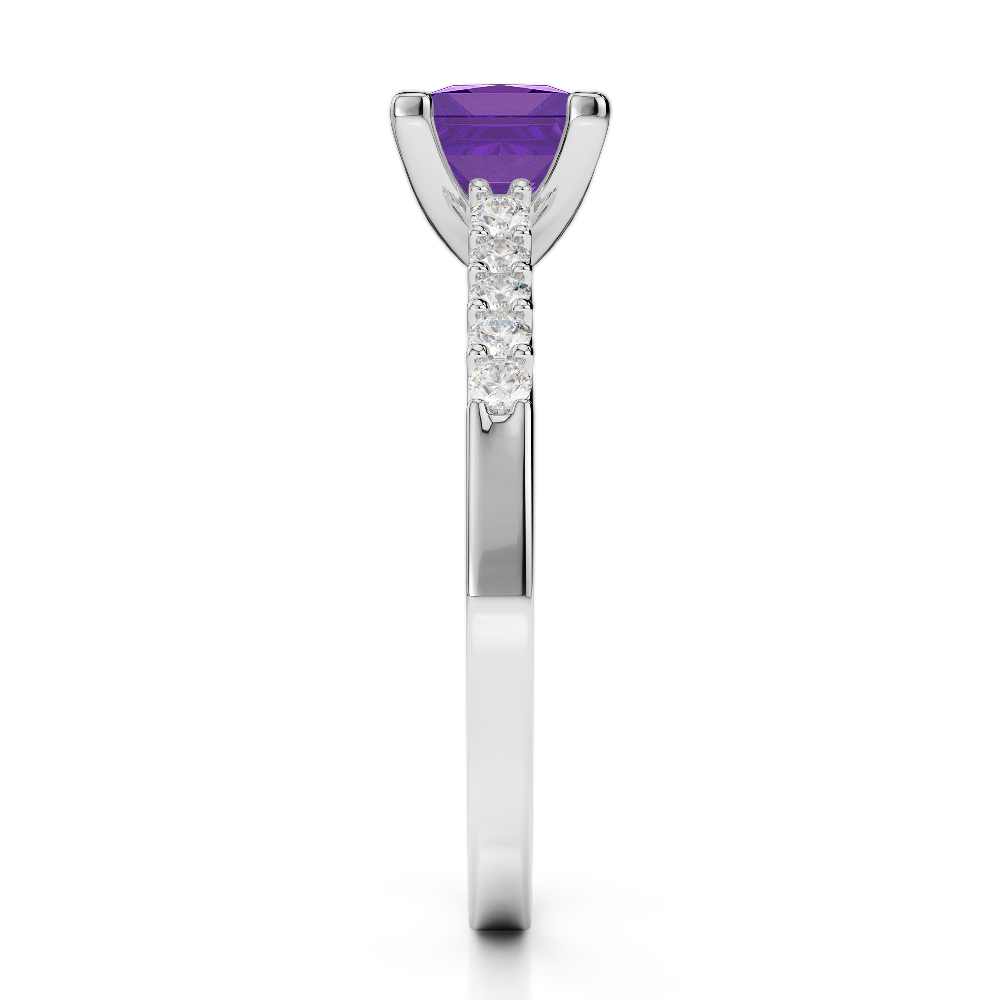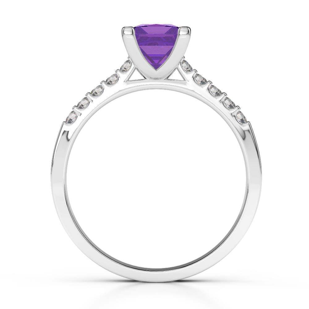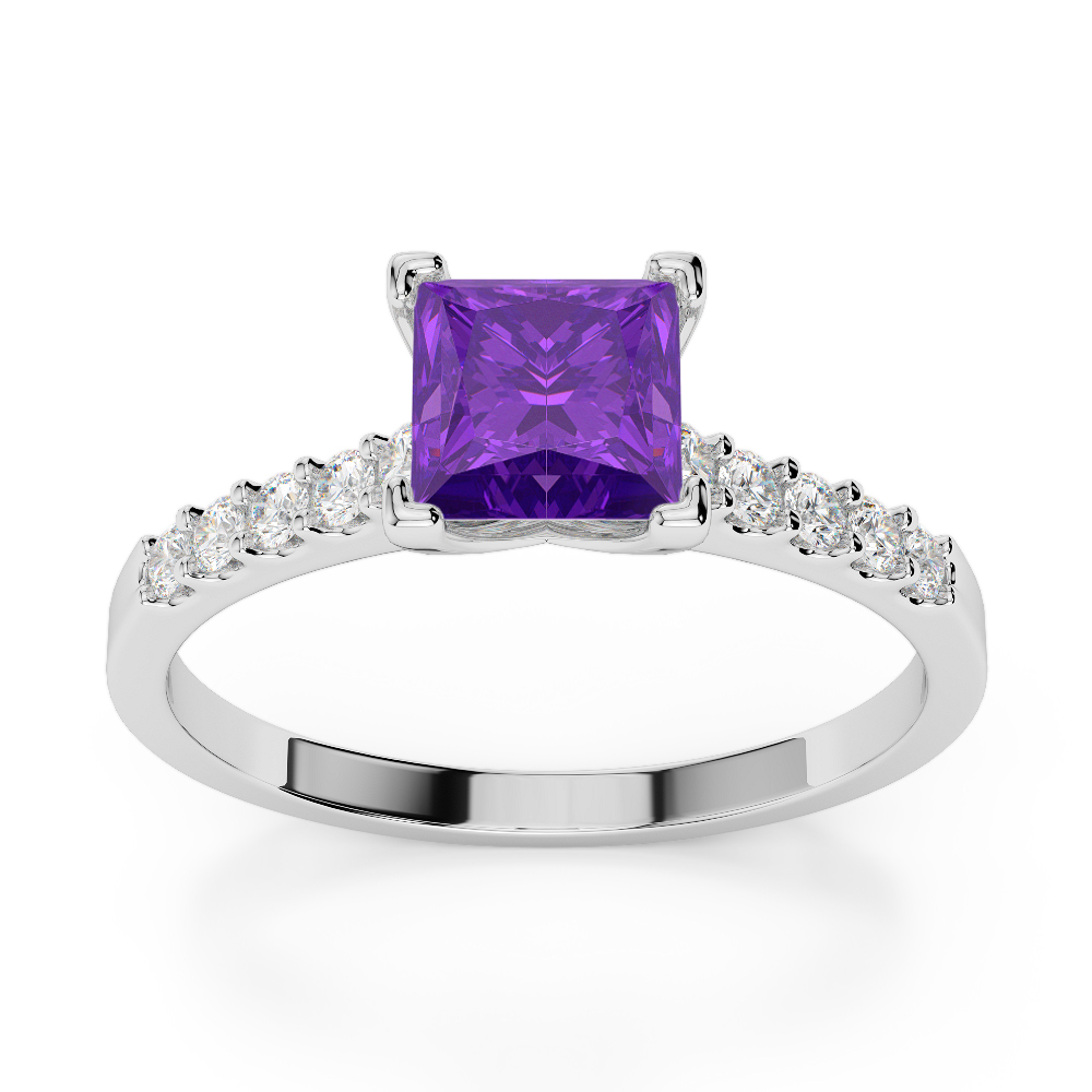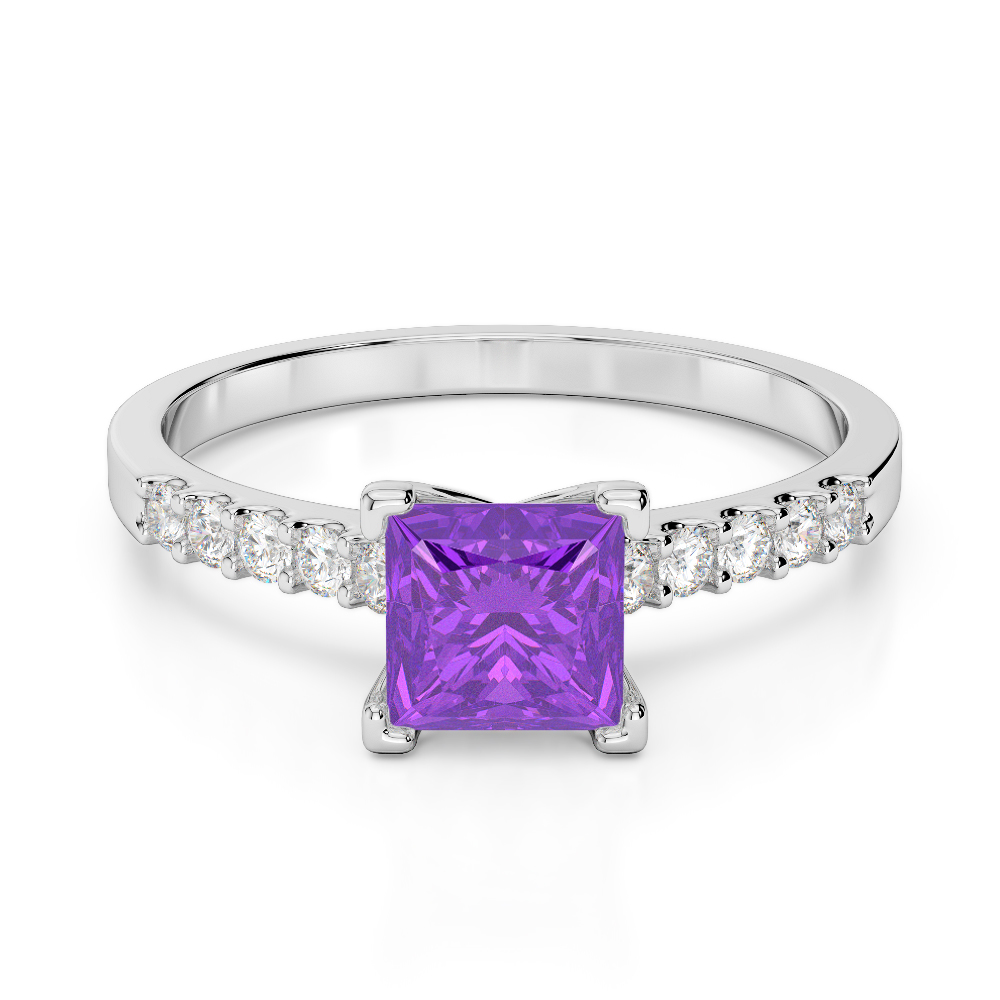 Indulge in the elegance of our Princess Cut Amethyst And Diamond Engagement Ring, showcasing a vibrant Amethyst secured in a refined prong setting that elevates the stone to maximize light and brilliance. Surrounded by sparkling diamonds, it radiates brilliance and timeless charm.
