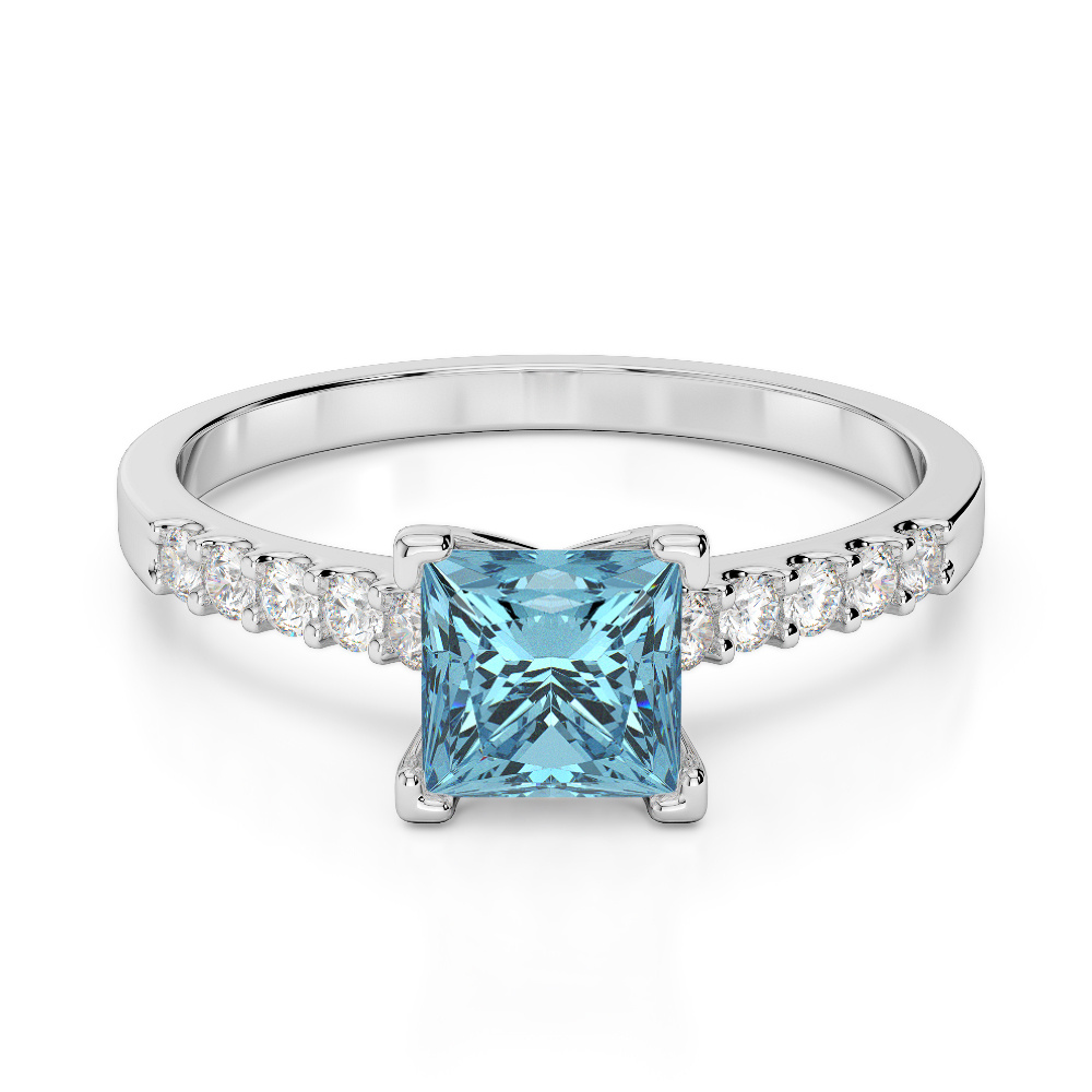 Indulge in the elegance of our Princess Cut Aquamarine And Diamond Engagement Ring, showcasing a vibrant Aquamarine secured in a refined prong setting that elevates the stone to maximize light and brilliance. Surrounded by sparkling diamonds, it radiates brilliance and timeless charm.