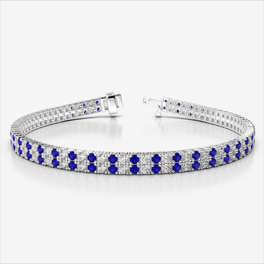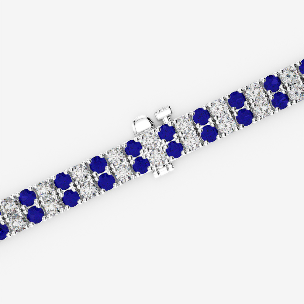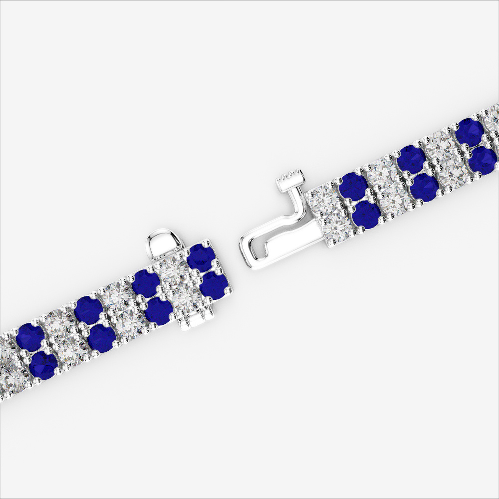 Adorn yourself with this dazzling Double Row Prong Set Blue Sapphire and diamond bracelet, where classic beauty meets modern finesse. Round-cut stones set in delicate prongs sparkle effortlessly, creating a luxurious piece suited for weddings, anniversaries, or everyday grace. A keepsake to treasure, it symbolises love and elegance in one elegant design.