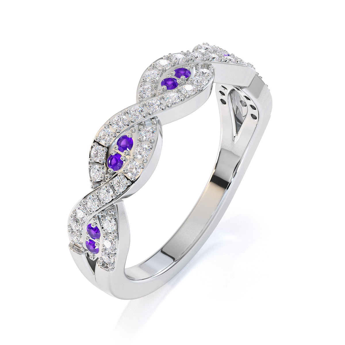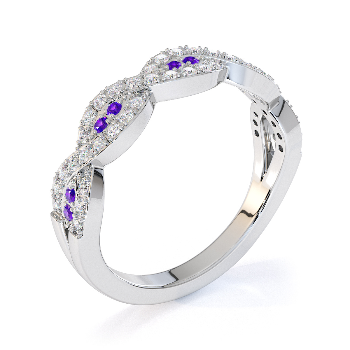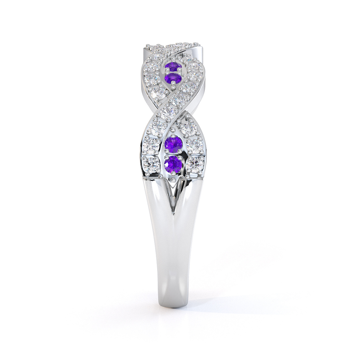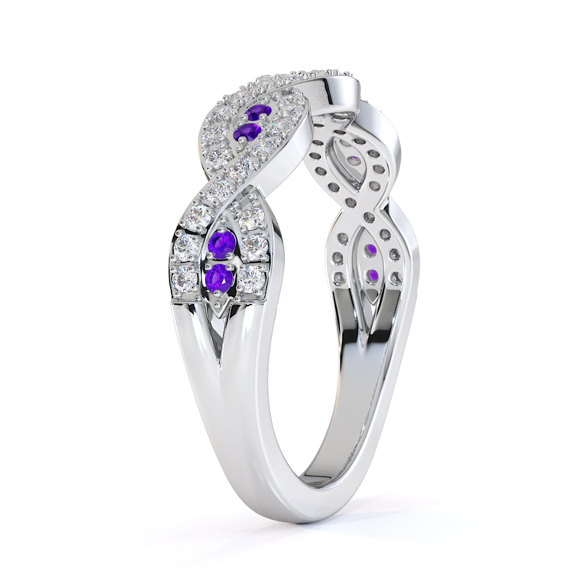 This exquisite half eternity ring features a stunning combination of diamonds and amethysts, set in a classic prong setting. The timeless design of this ring makes it a perfect choice for symbolising everlasting love and commitment. Crafted with precision and attention to detail, this ring is sure to be a cherished piece for years to come.