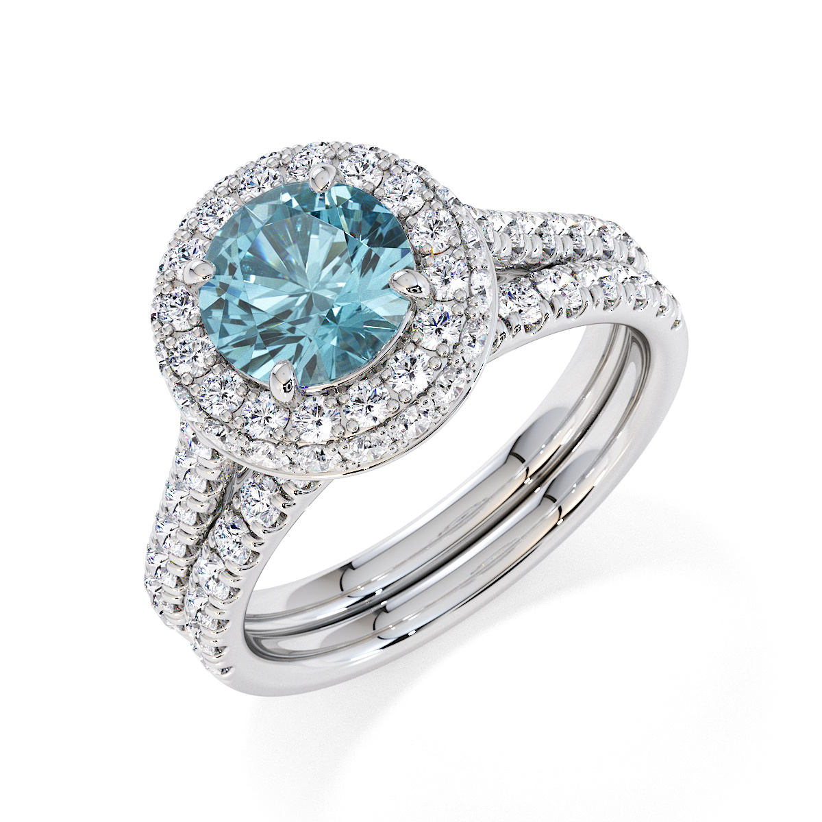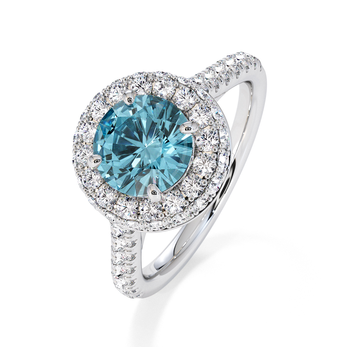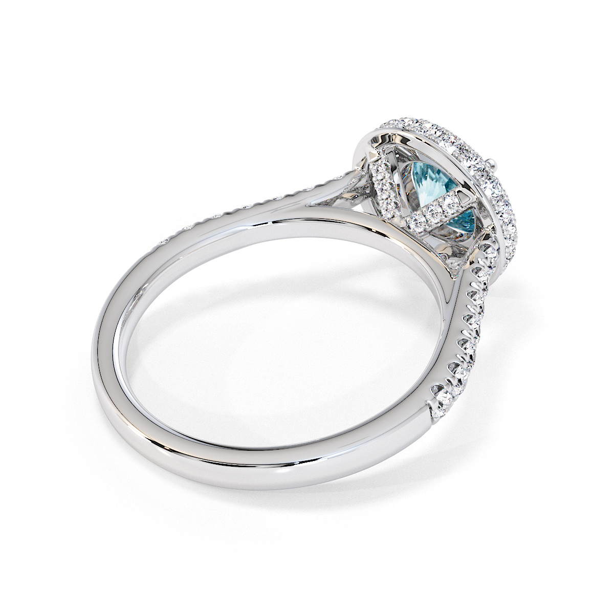 We are presenting our stunning round cut Aquamarine and Diamond Engagement Ring, showcasing a halo design and prong-set stones for exceptional brilliance.