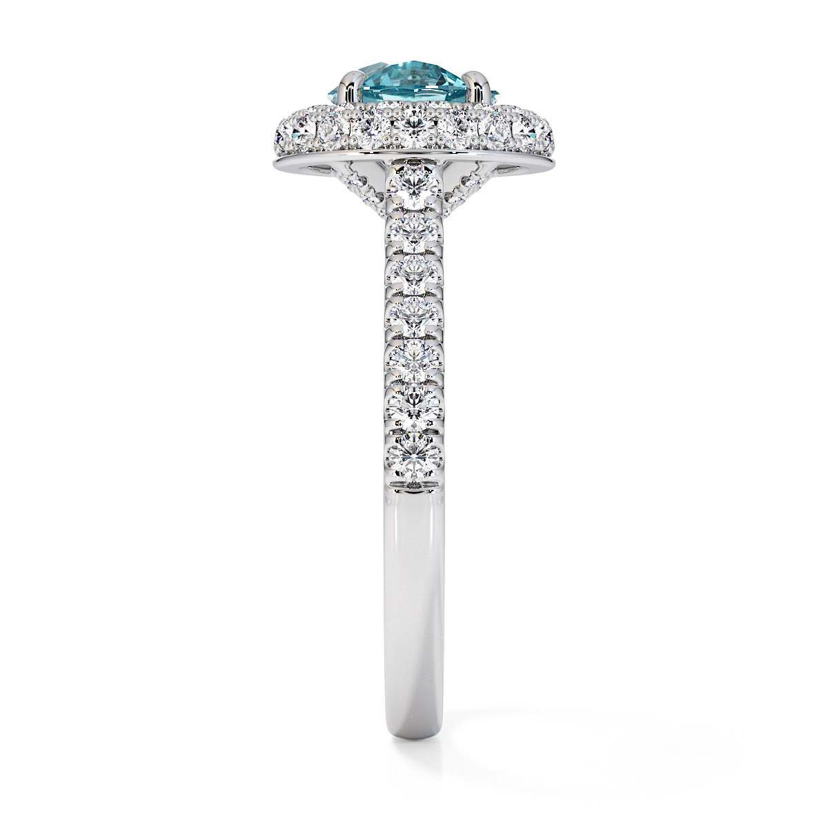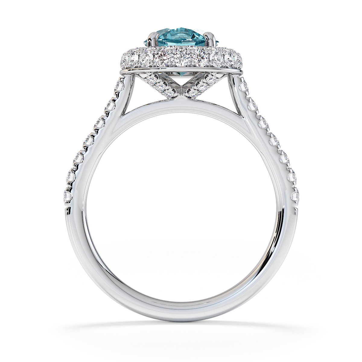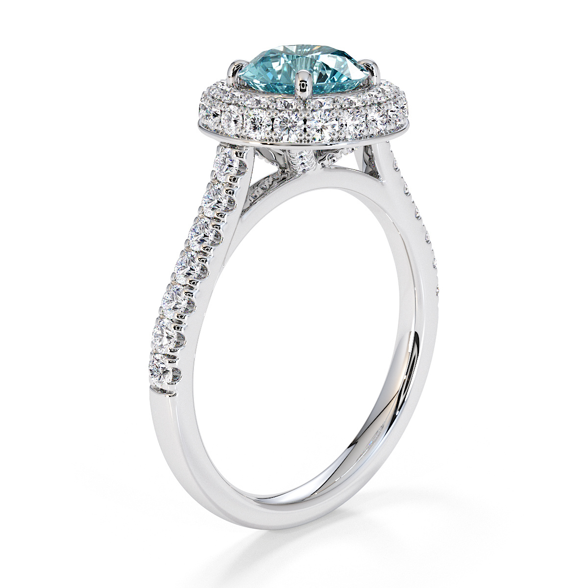 We are presenting our stunning round cut Aquamarine and Diamond Engagement Ring, showcasing a halo design and prong-set stones for exceptional brilliance.