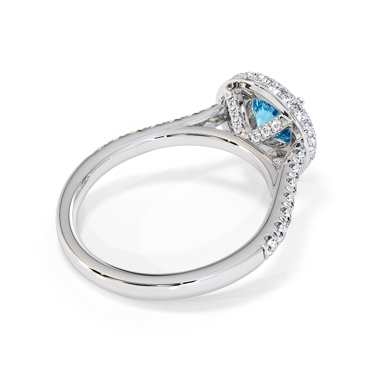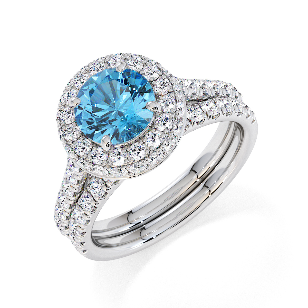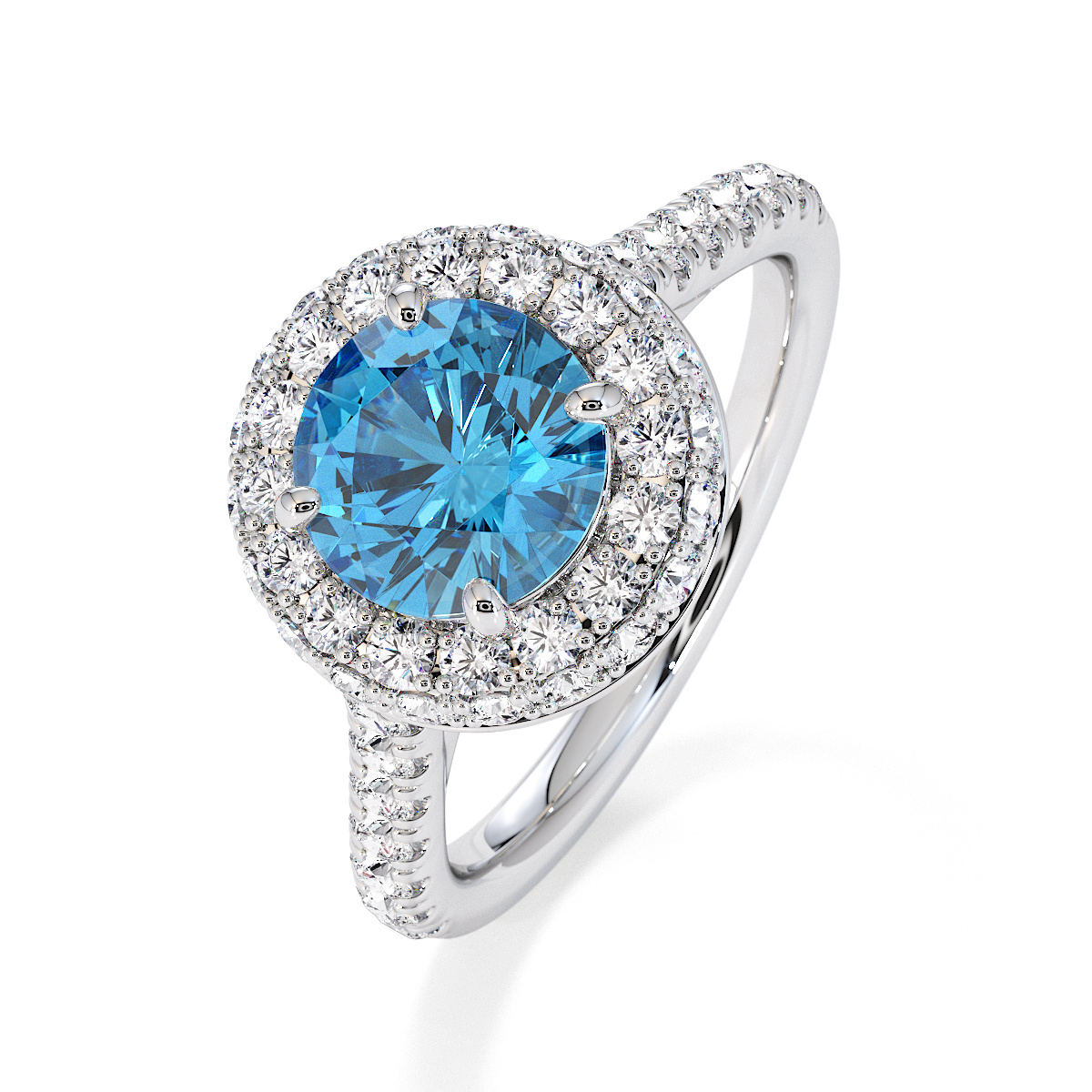 We are presenting our stunning round cut Blue Topaz and Diamond Engagement Ring, showcasing a halo design and prong-set stones for exceptional brilliance.