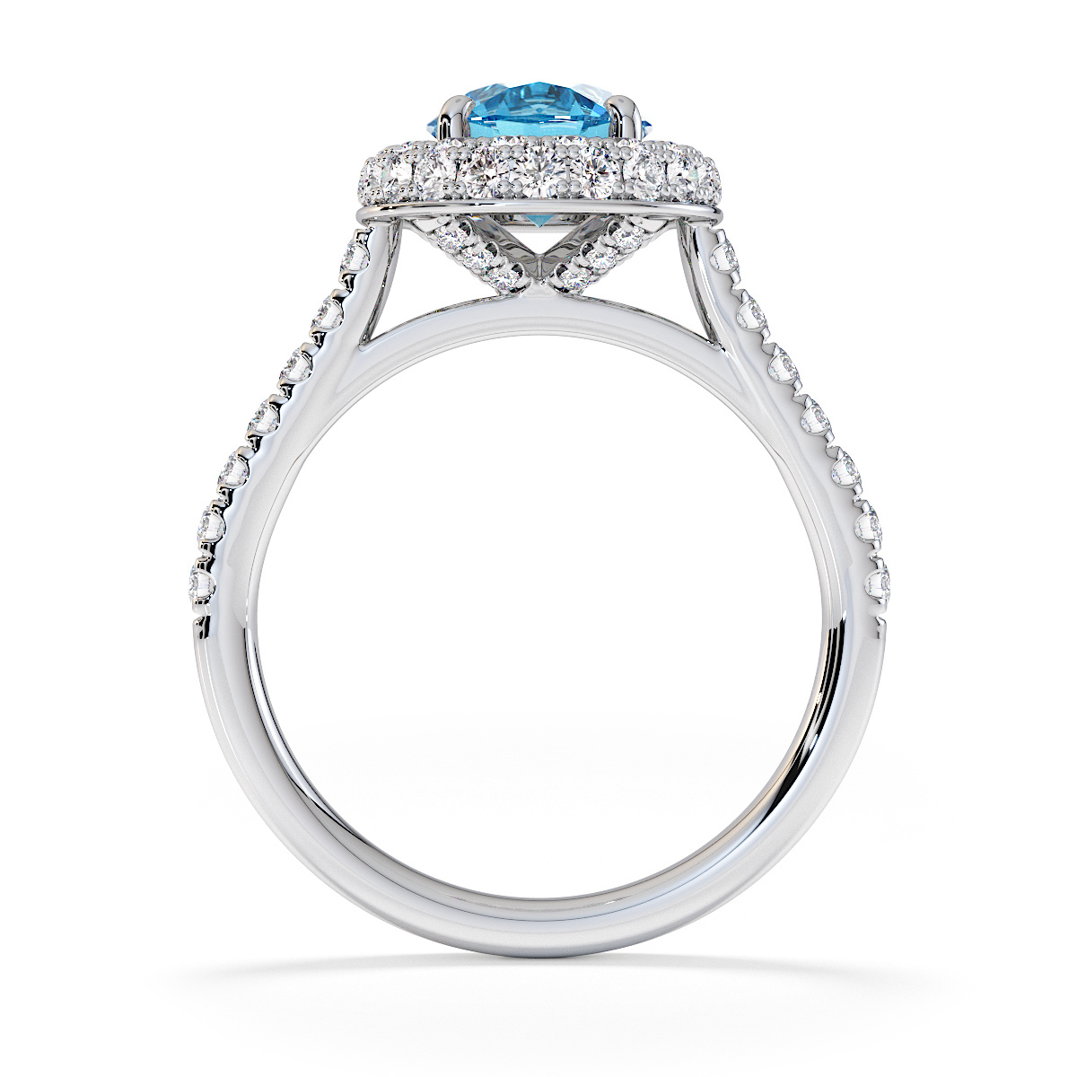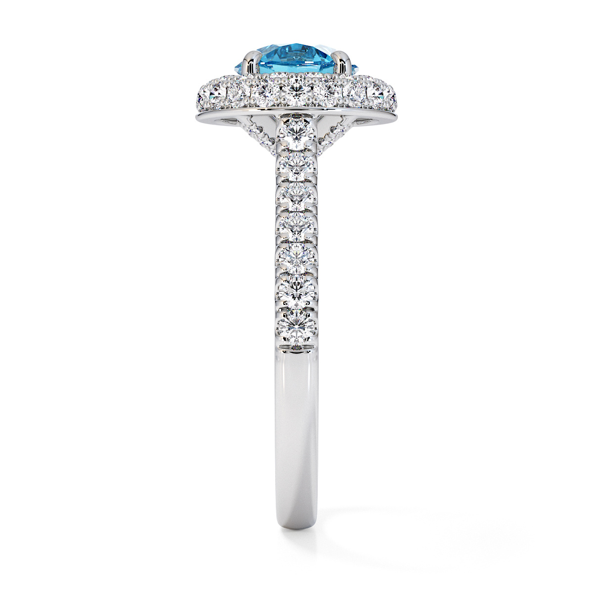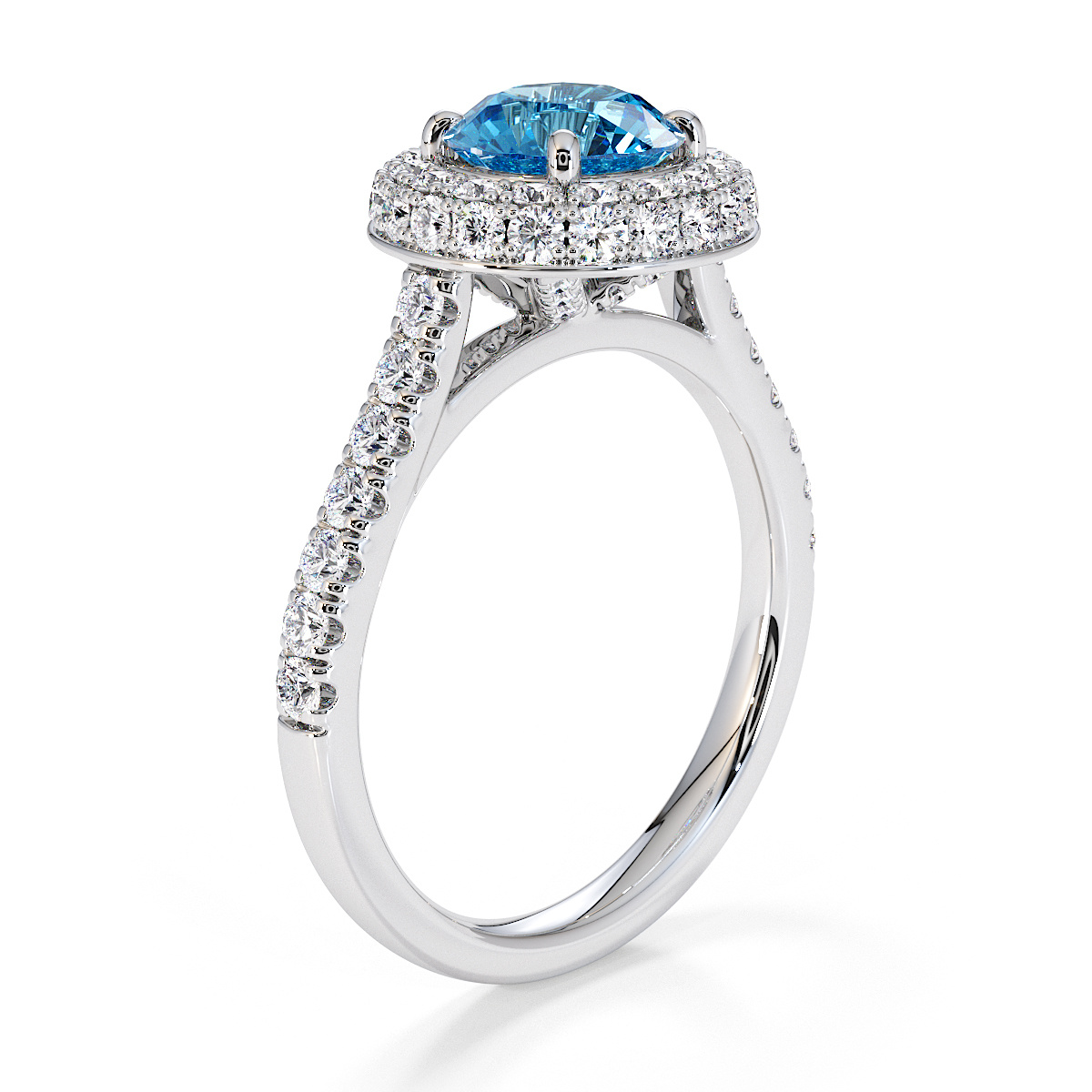 We are presenting our stunning round cut Blue Topaz and Diamond Engagement Ring, showcasing a halo design and prong-set stones for exceptional brilliance.