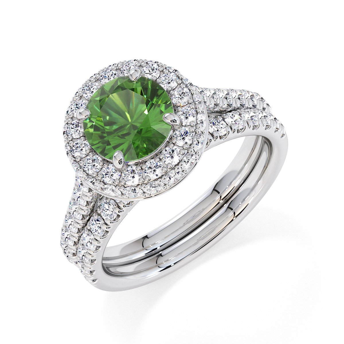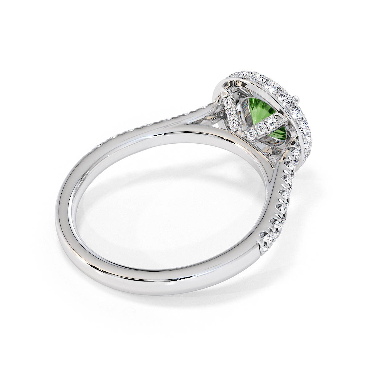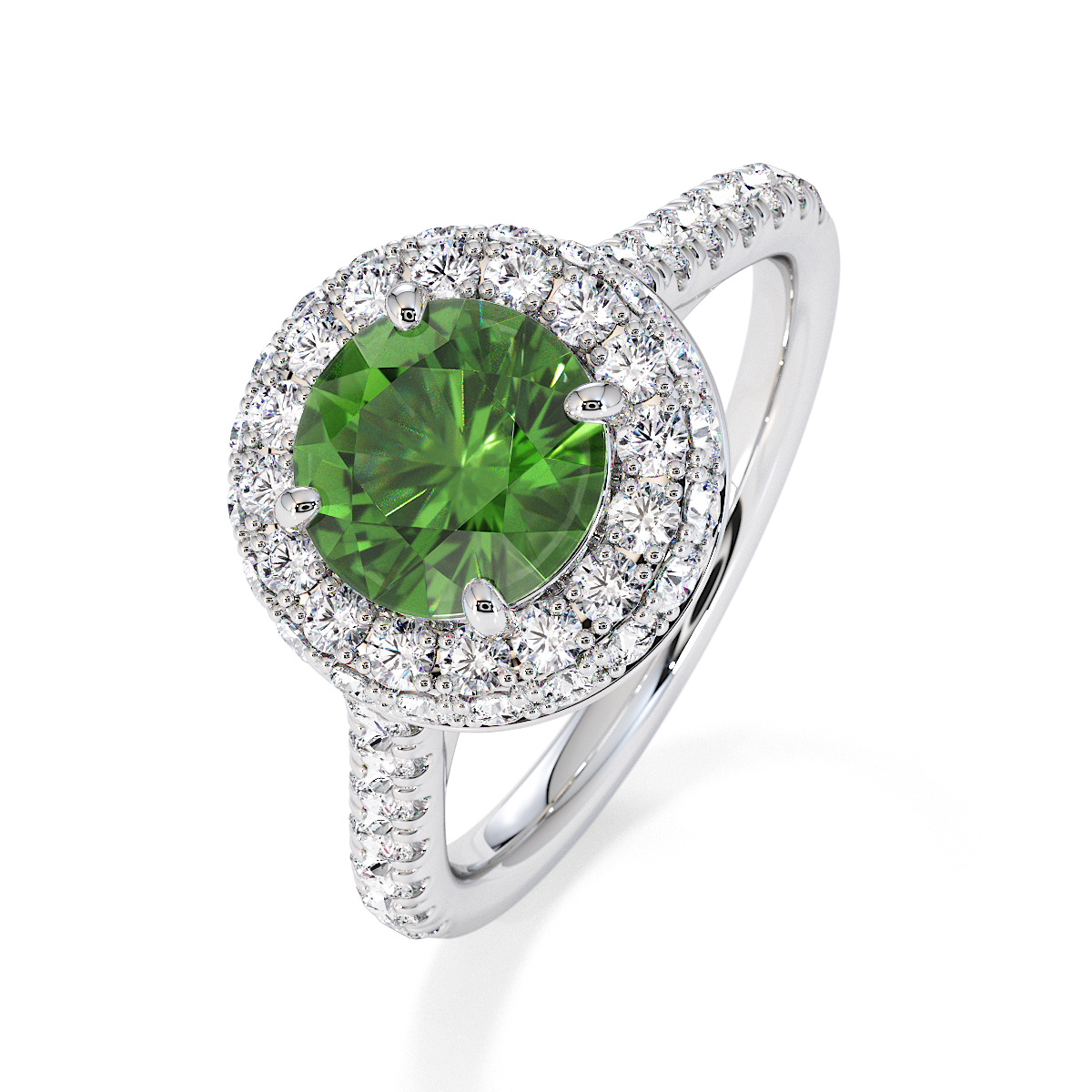 We are presenting our stunning round cut Green Tourmaline and Diamond Engagement Ring, showcasing a halo design and prong-set stones for exceptional brilliance.