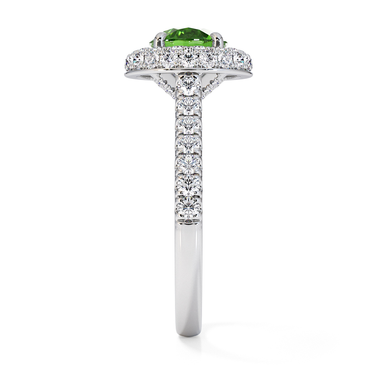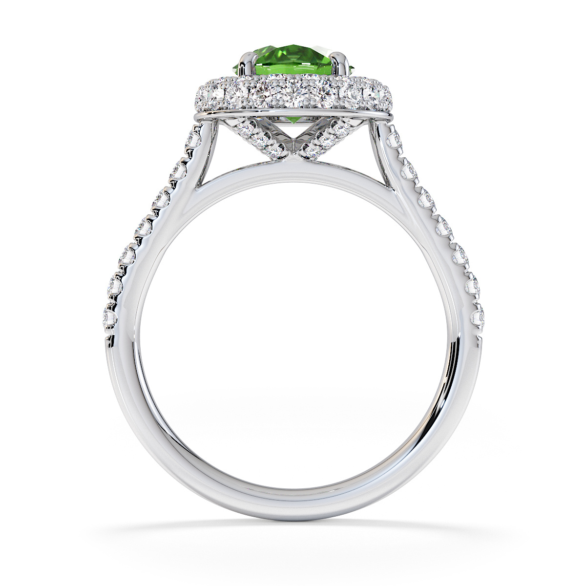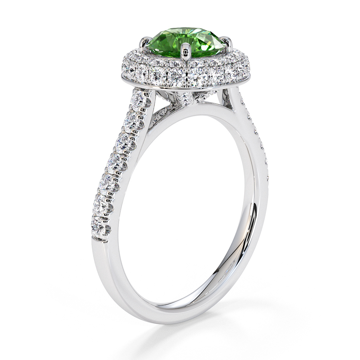We are presenting our stunning round cut Green Tourmaline and Diamond Engagement Ring, showcasing a halo design and prong-set stones for exceptional brilliance.