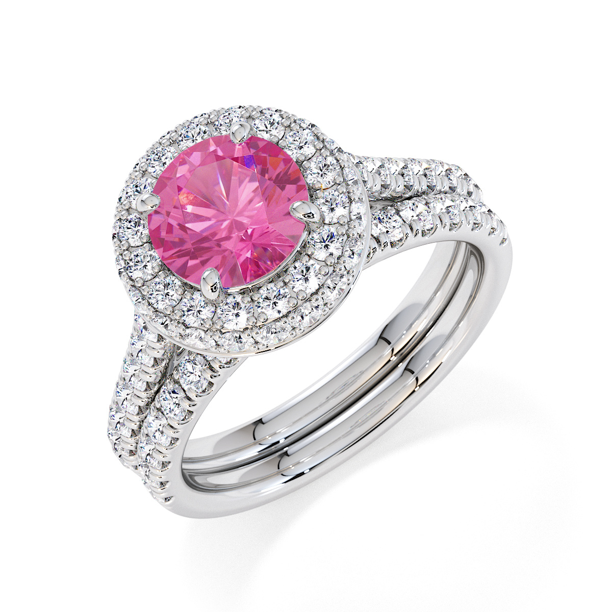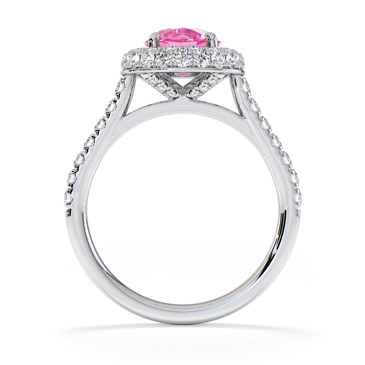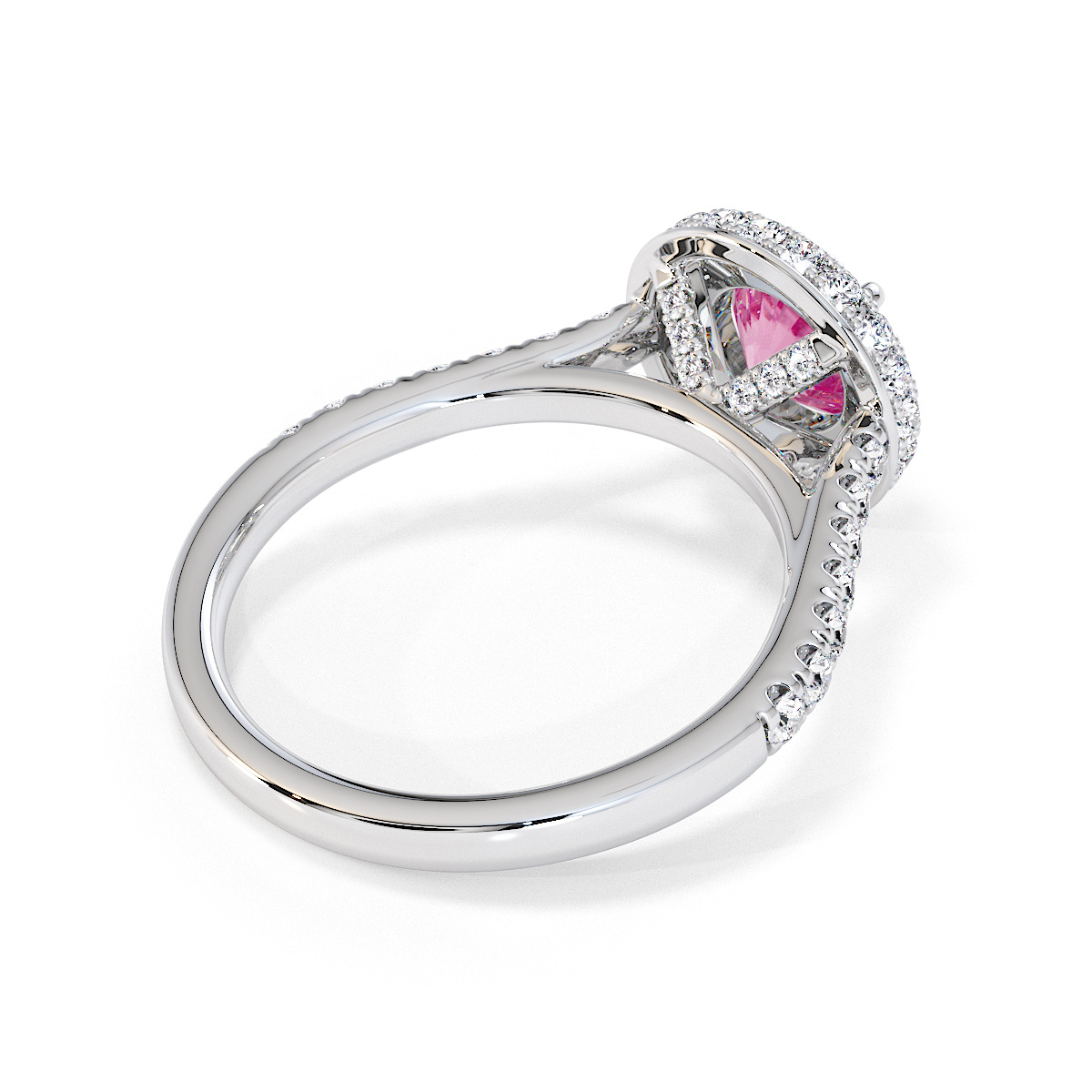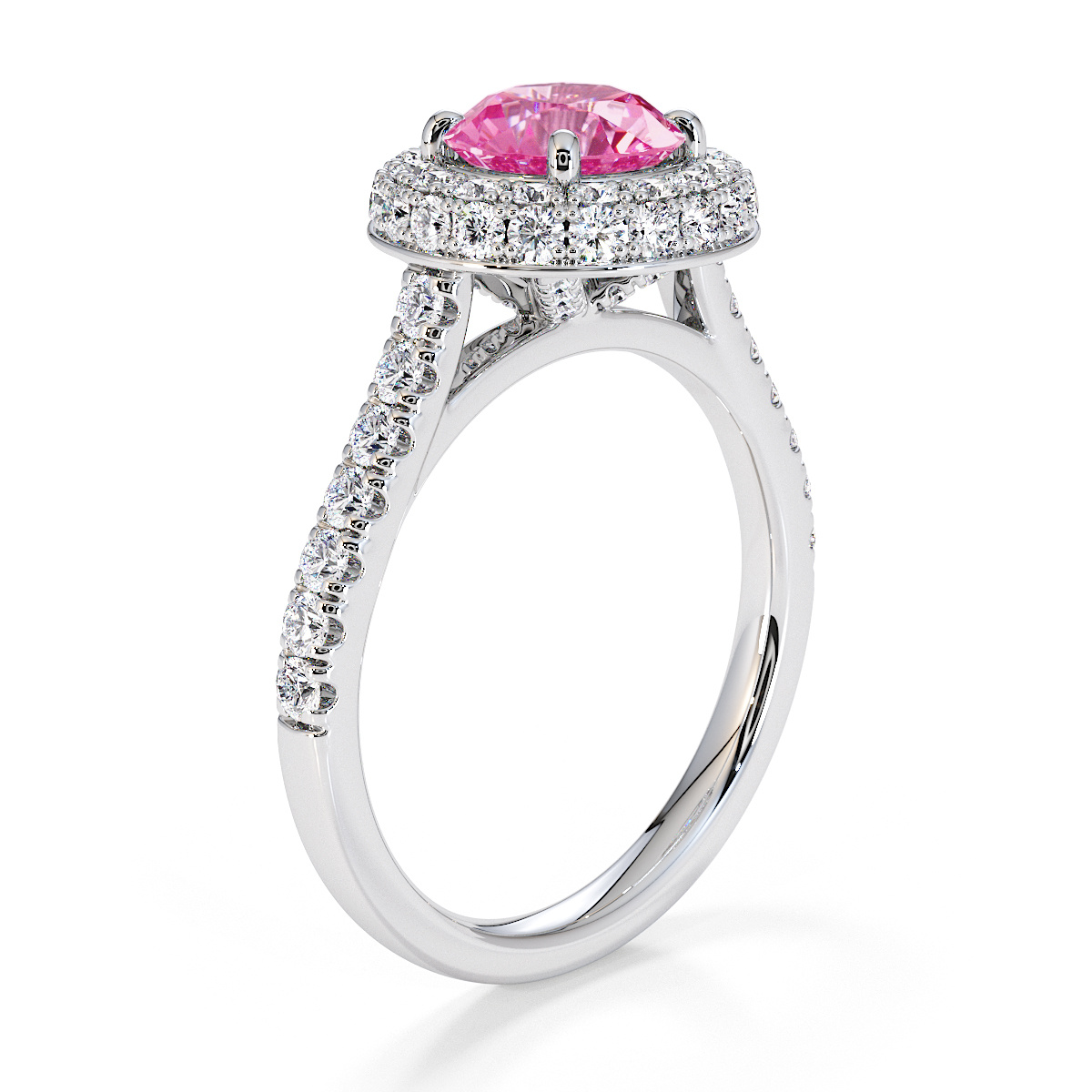 We are presenting our stunning round cut Pink Sapphire and Diamond Engagement Ring, showcasing a halo design and prong-set stones for exceptional brilliance.