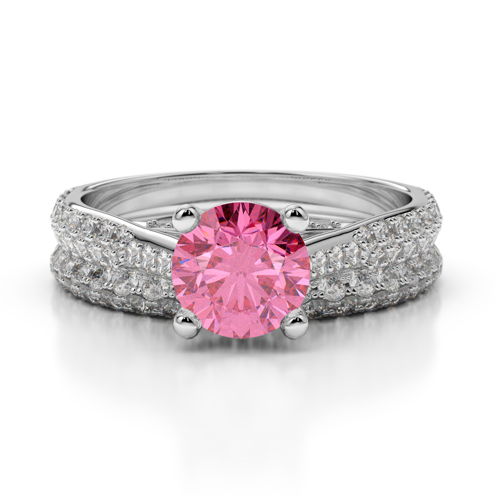 This exquisite bridal set features beautiful diamond bridal set with a stunning pink tourmaline center. The rings are elegantly designed with a pave setting, adding a touch of brilliance and sophistication. Crafted with precision and attention to detail, these rings are the perfect symbol of love and commitment. The sparkling diamonds and the intricate setting make this bridal set a timeless and captivating choice for any couple embarking on their journey together.
