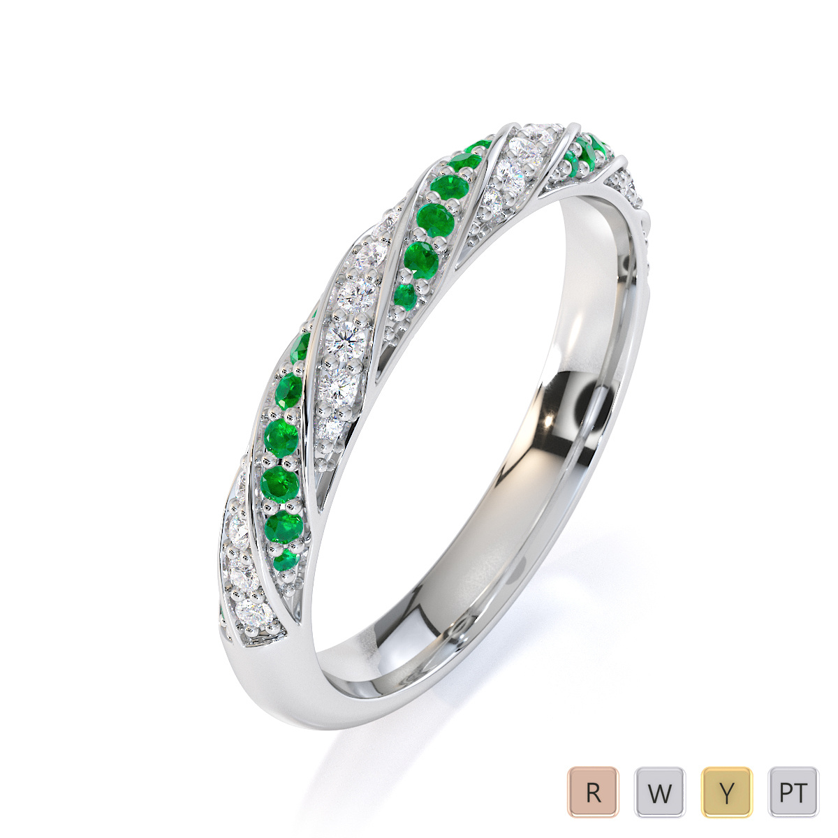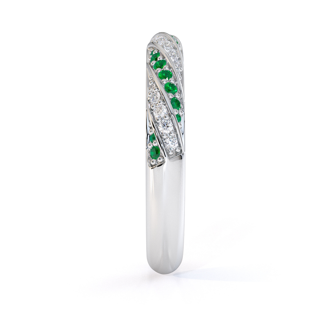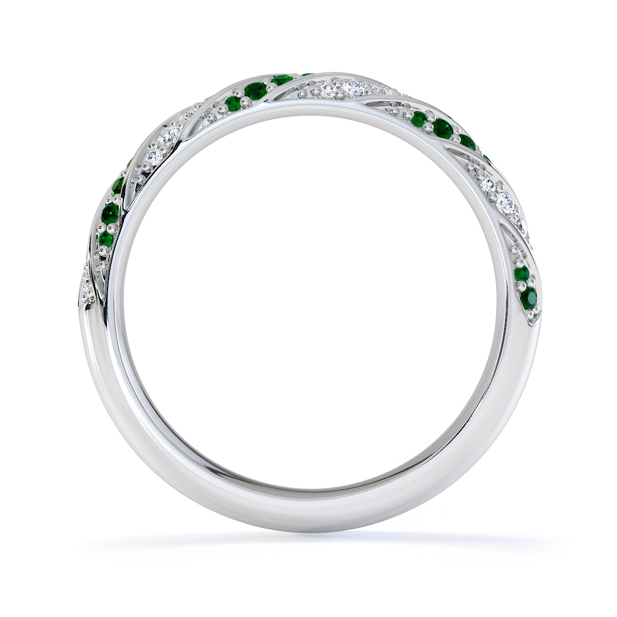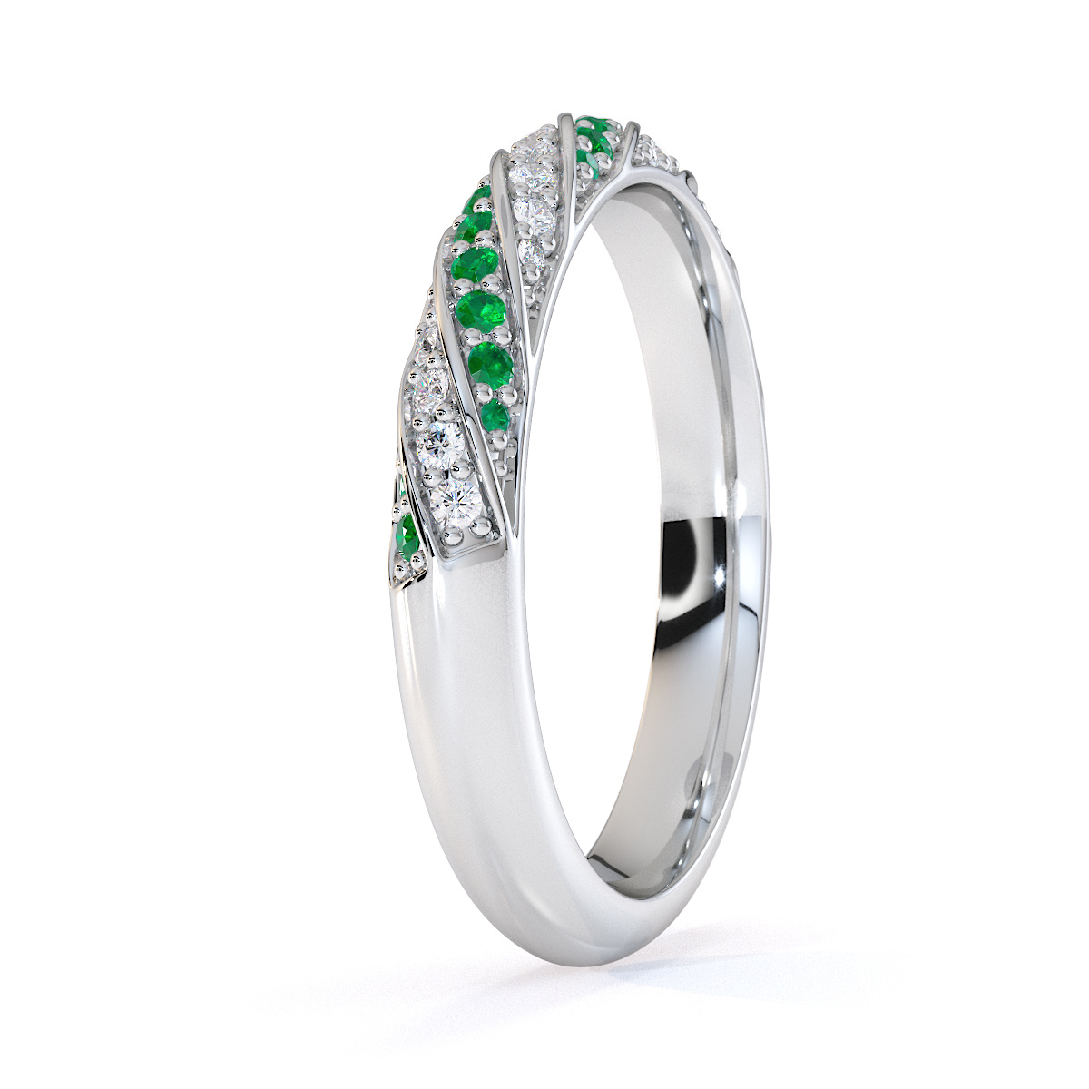 This eternity ring features timeless elegance with emeralds and diamonds, symbolising love and commitment. The half-eternity style, combined with a split prong setting, securely holds each stone while enhancing its brilliance. This elegant piece adds a touch of sophistication to any bride’s ensemble on her special day.